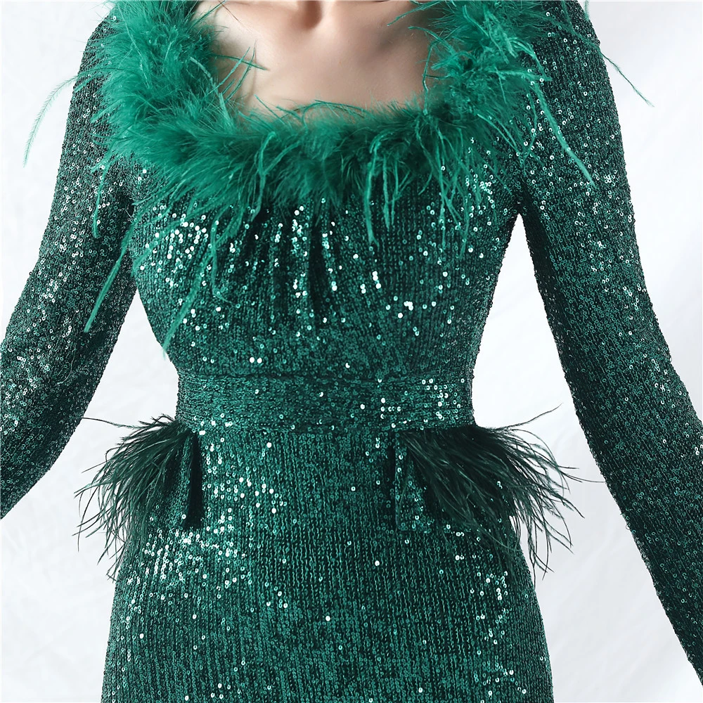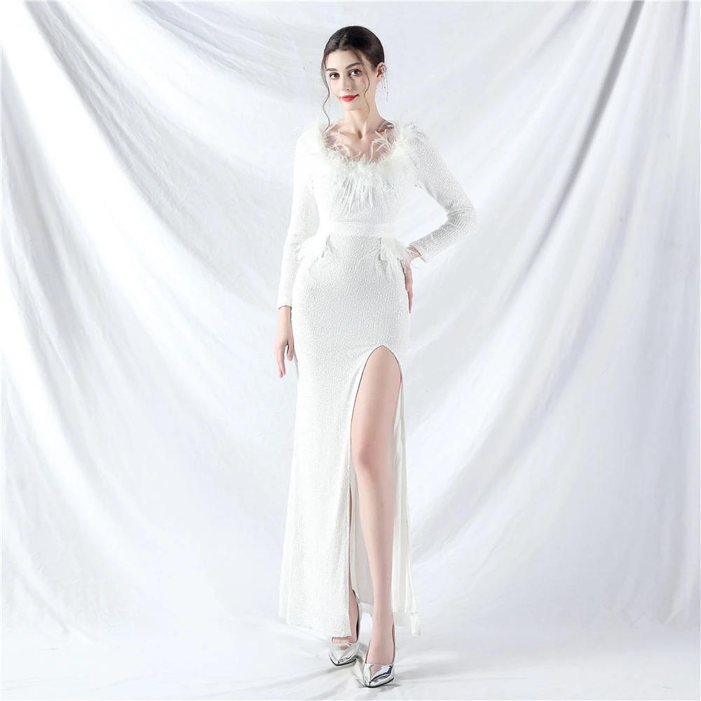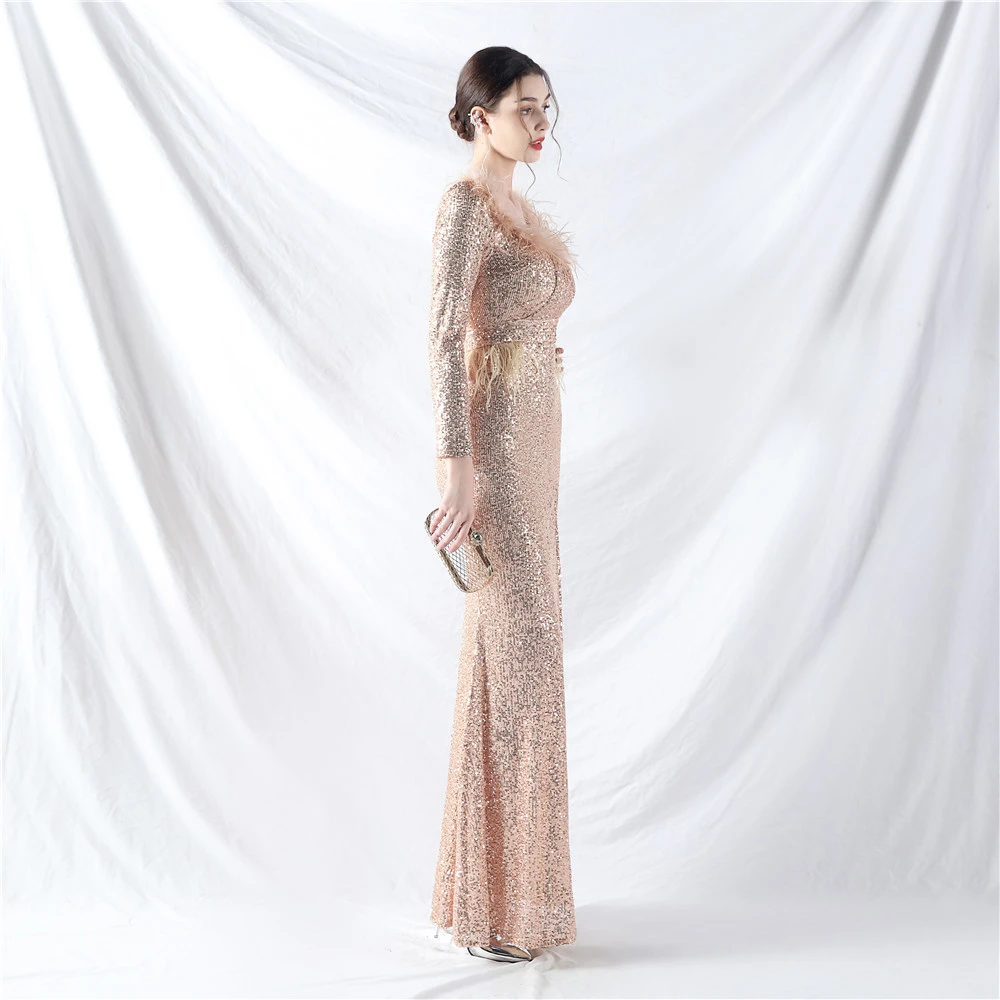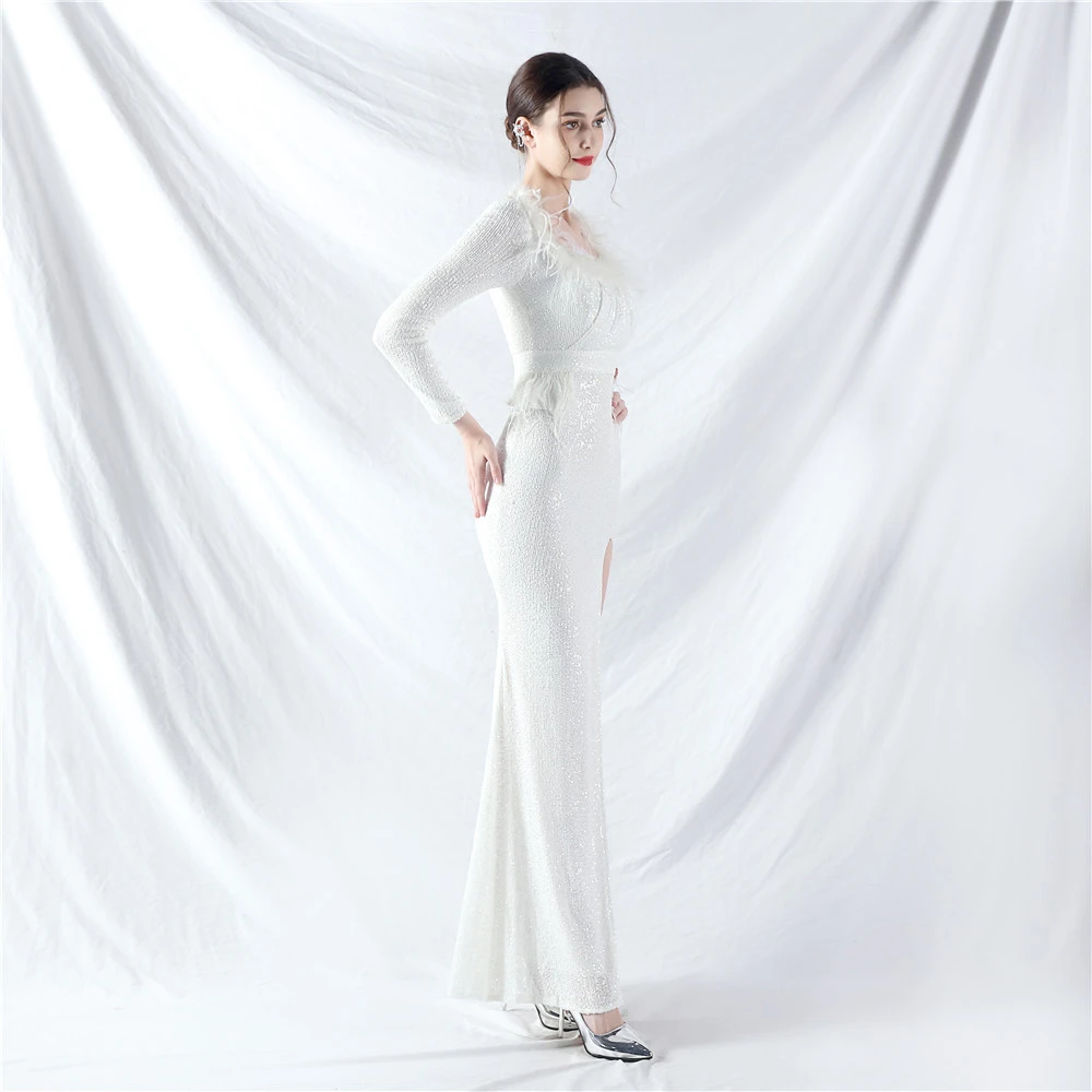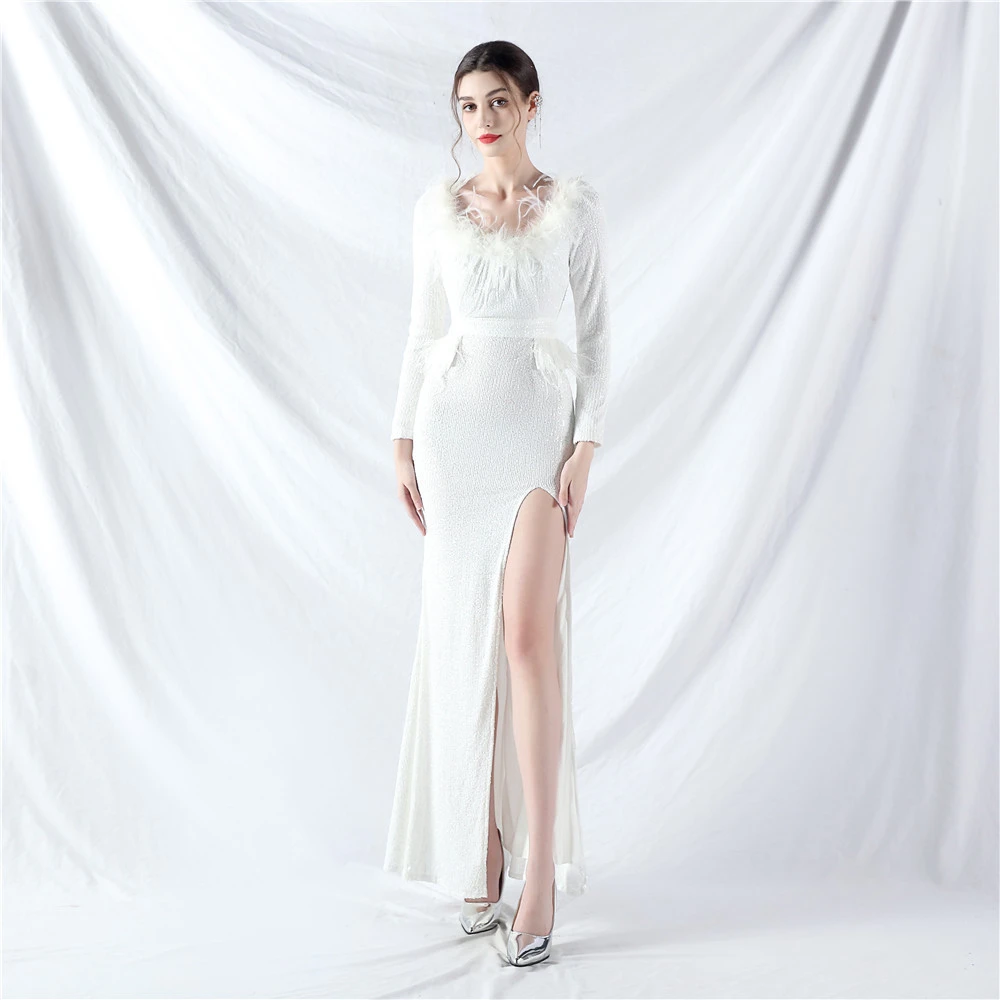 Craft-Made Ostrich Feather Long-Sleeved Beads Evening Dress