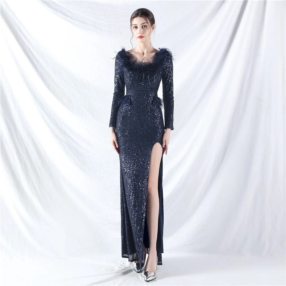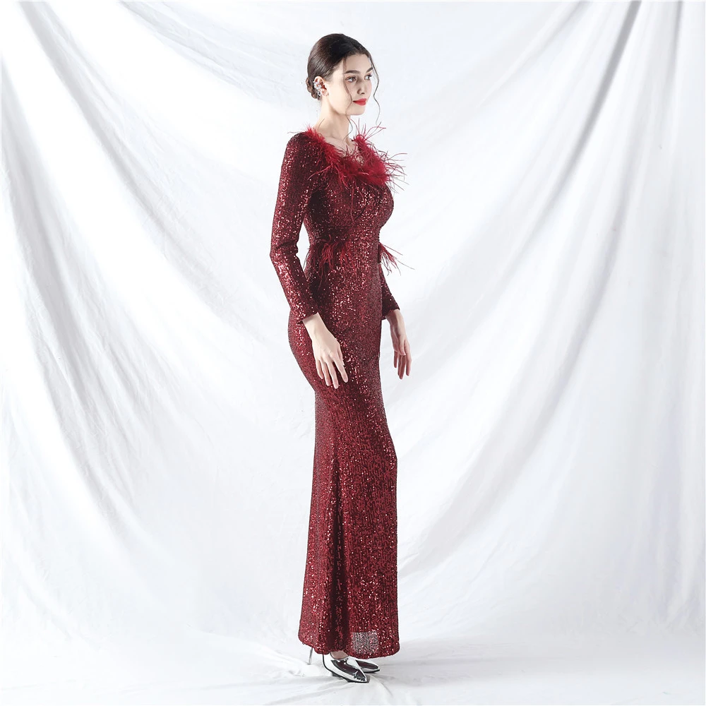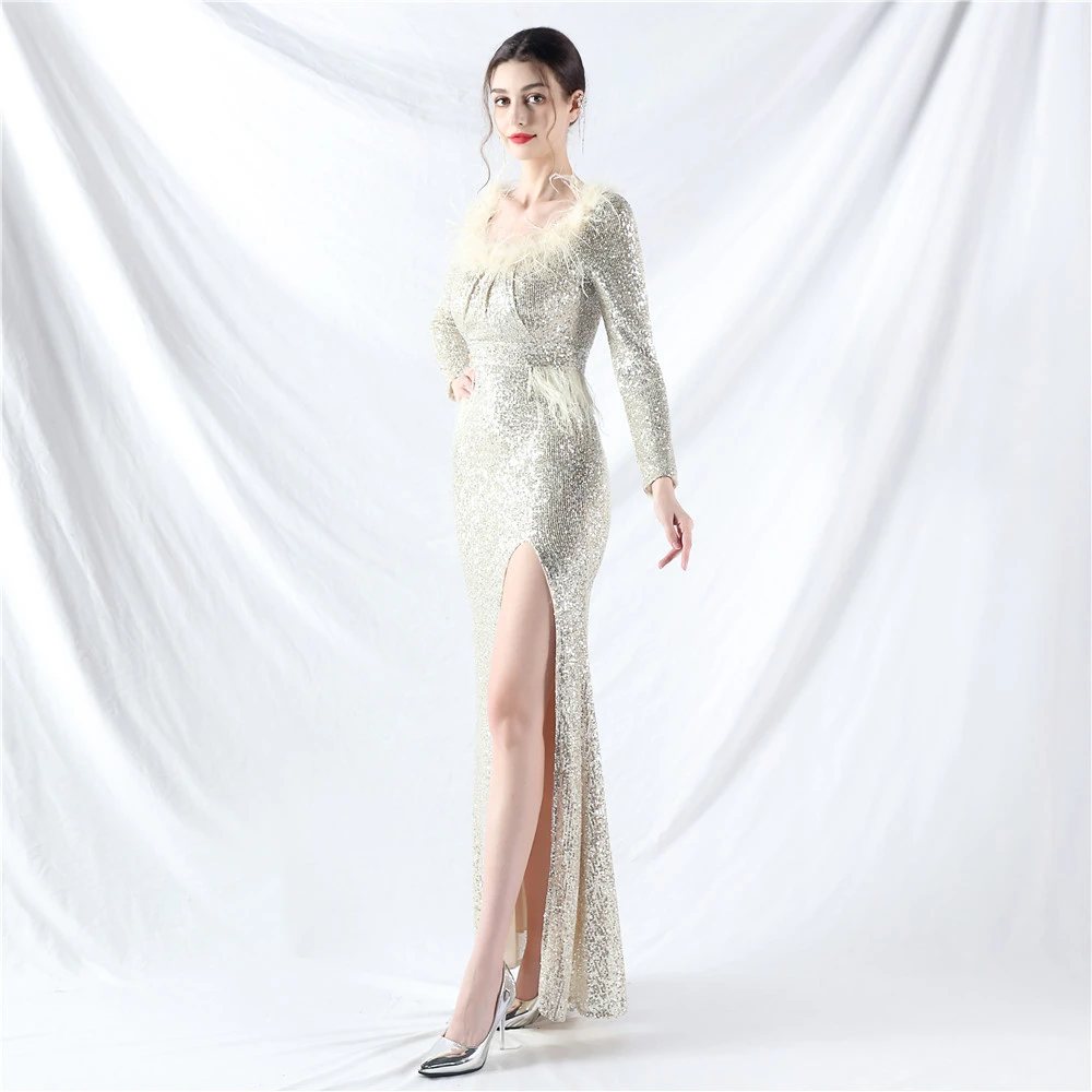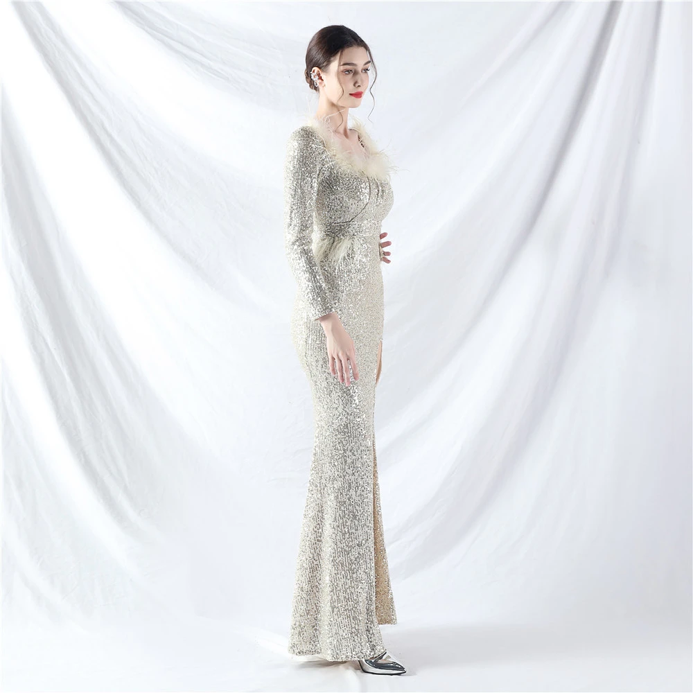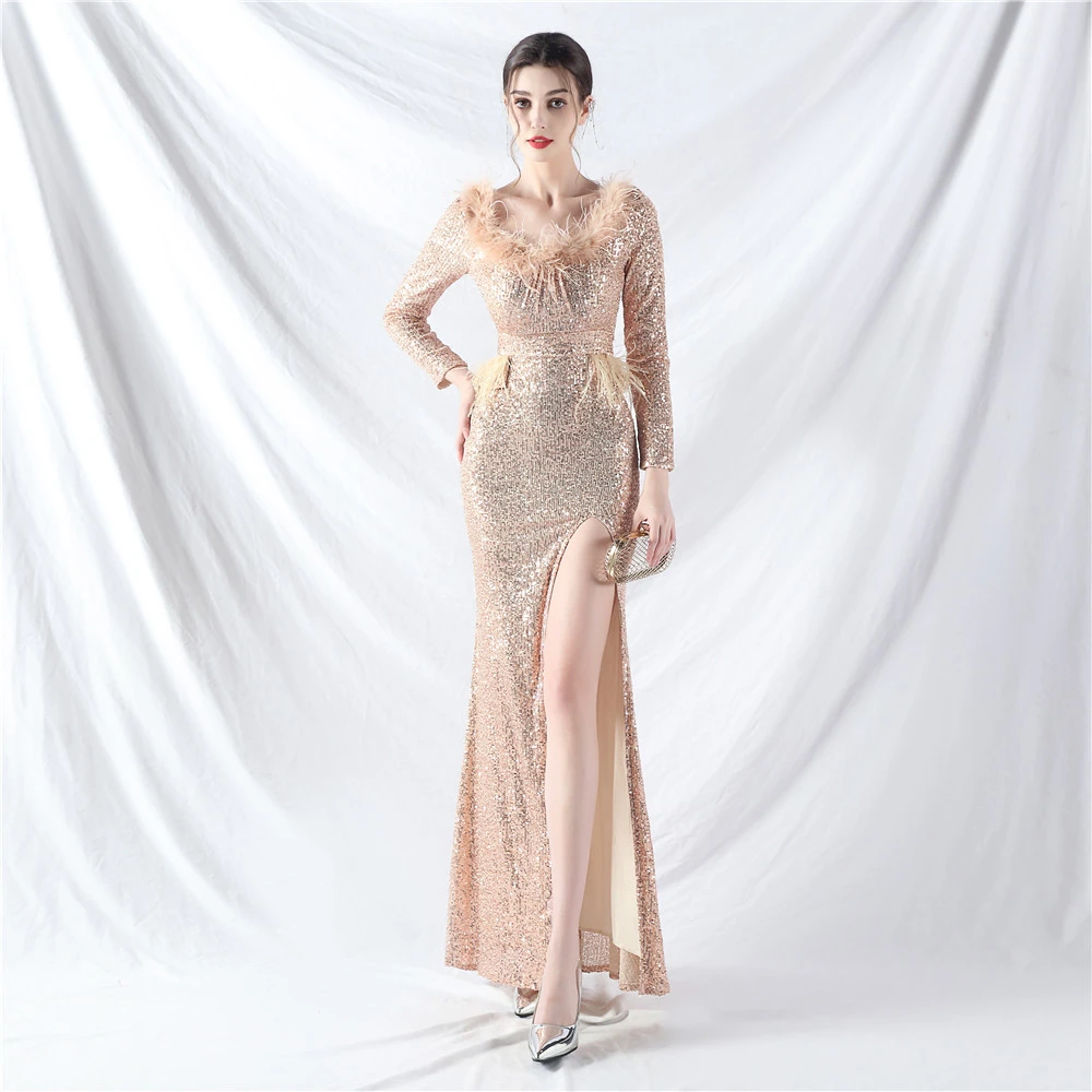 Craft-Made Ostrich Feather Long-Sleeved Beads Evening Dress