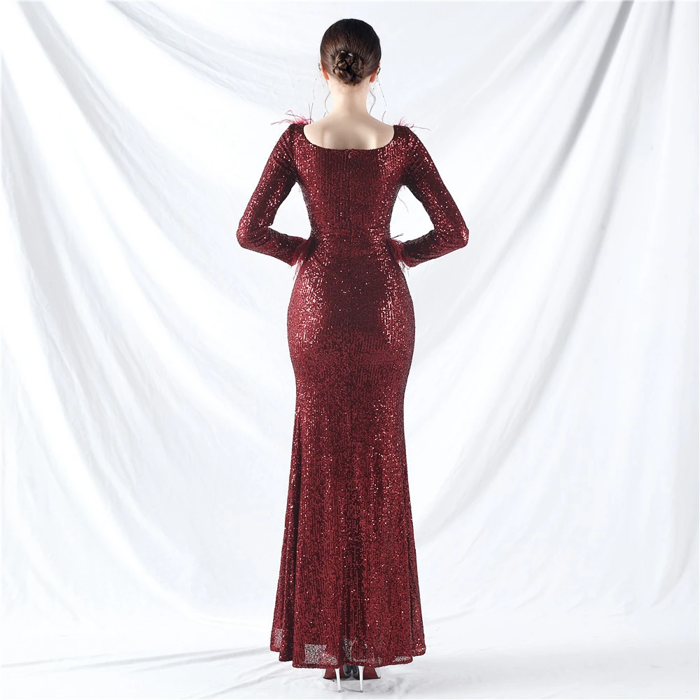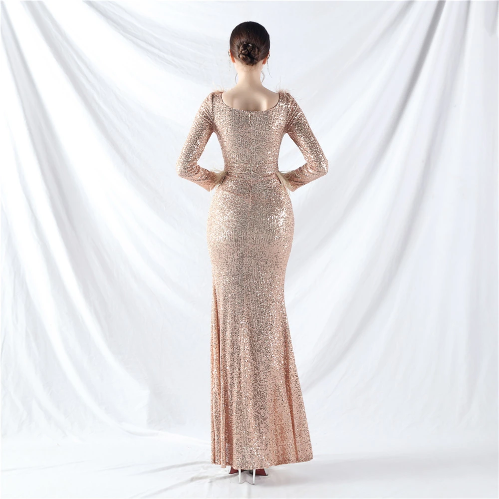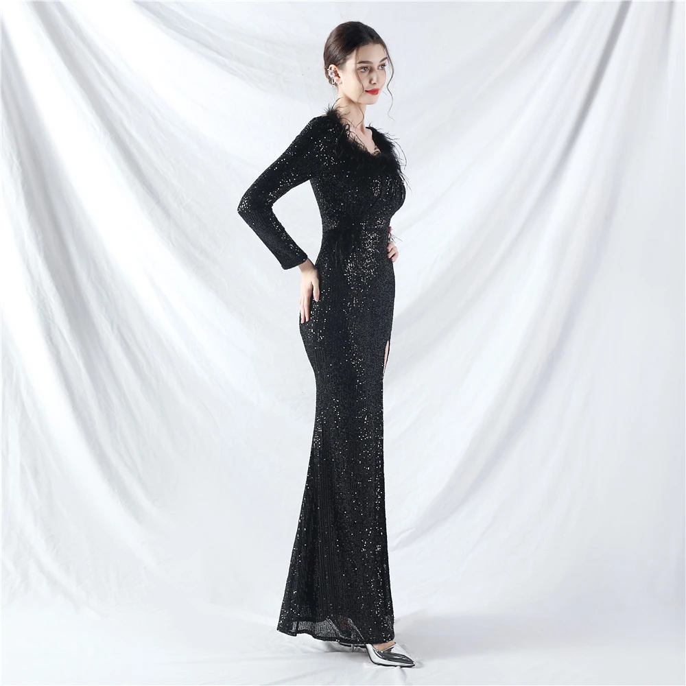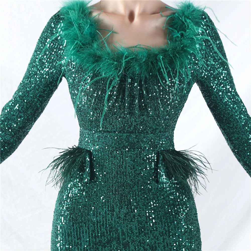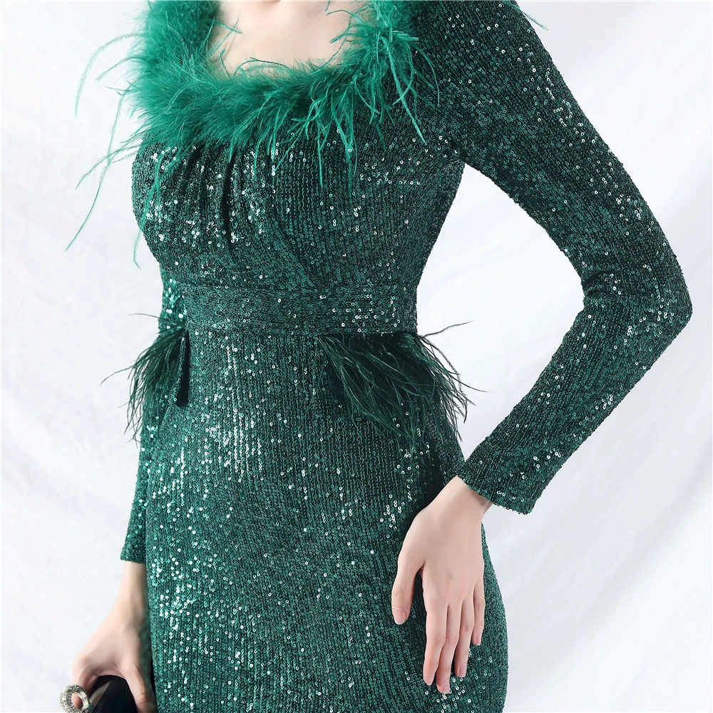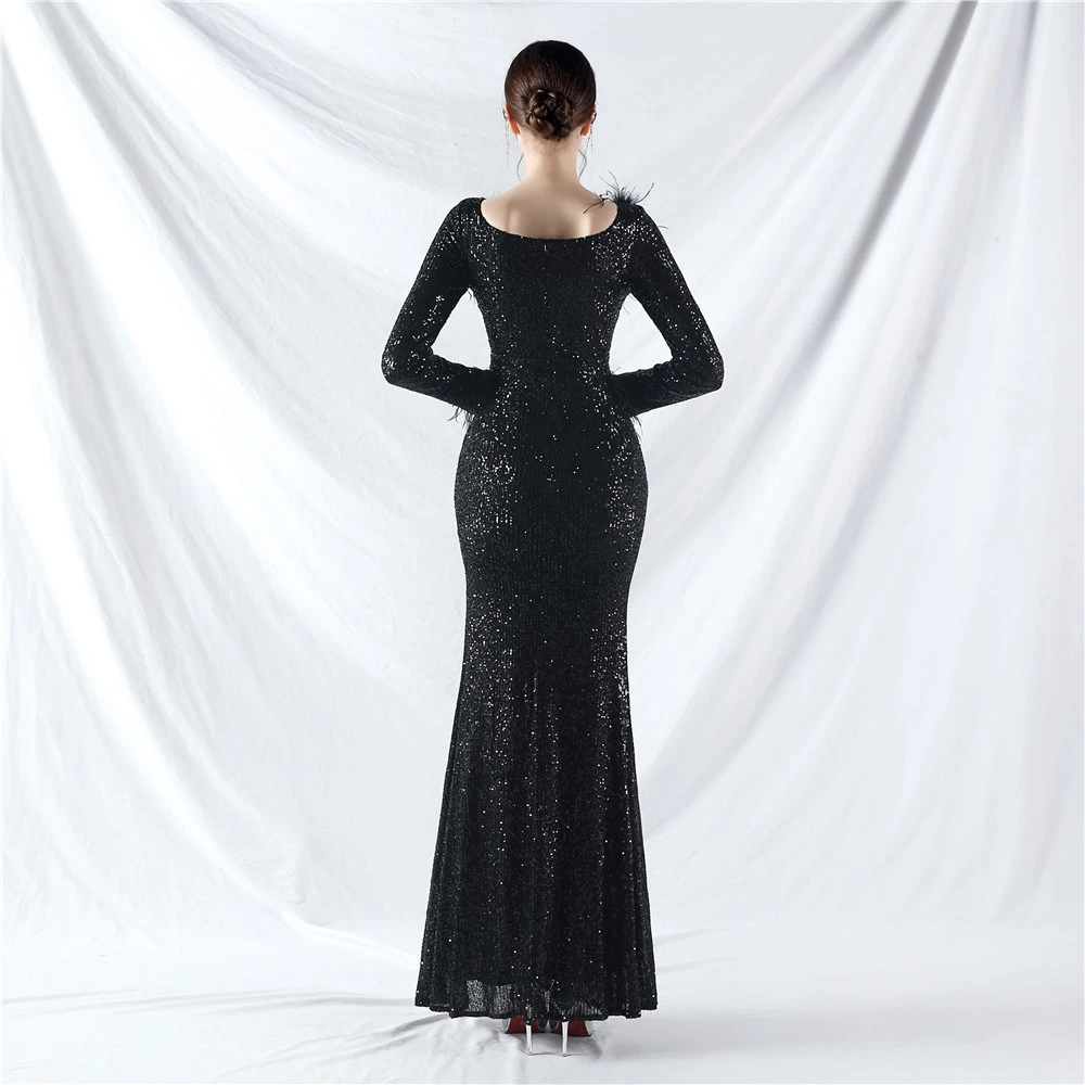 Craft-Made Ostrich Feather Long-Sleeved Beads Evening Dress
