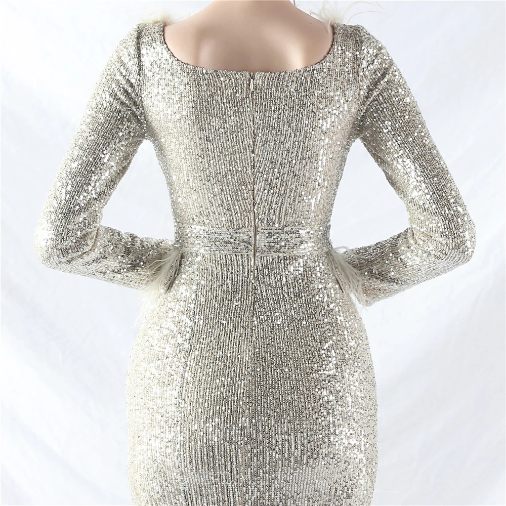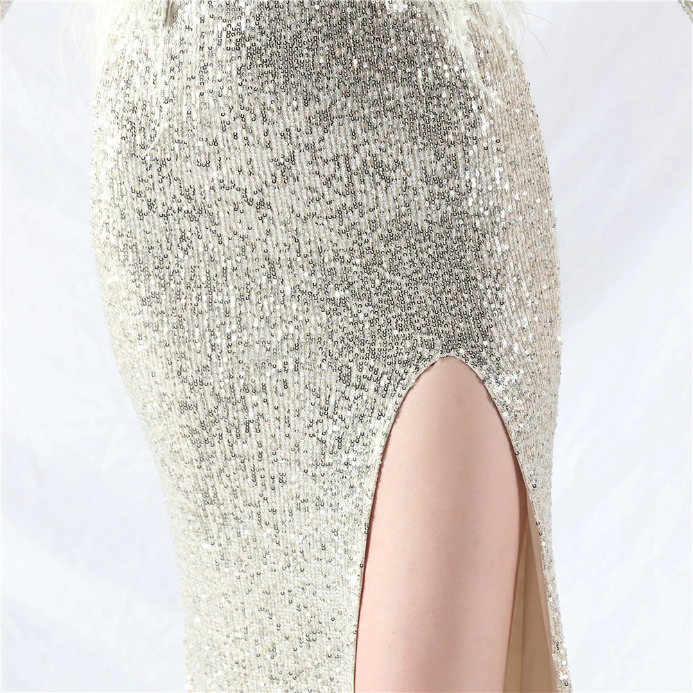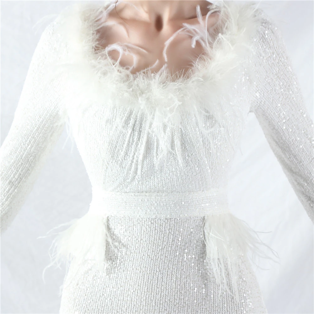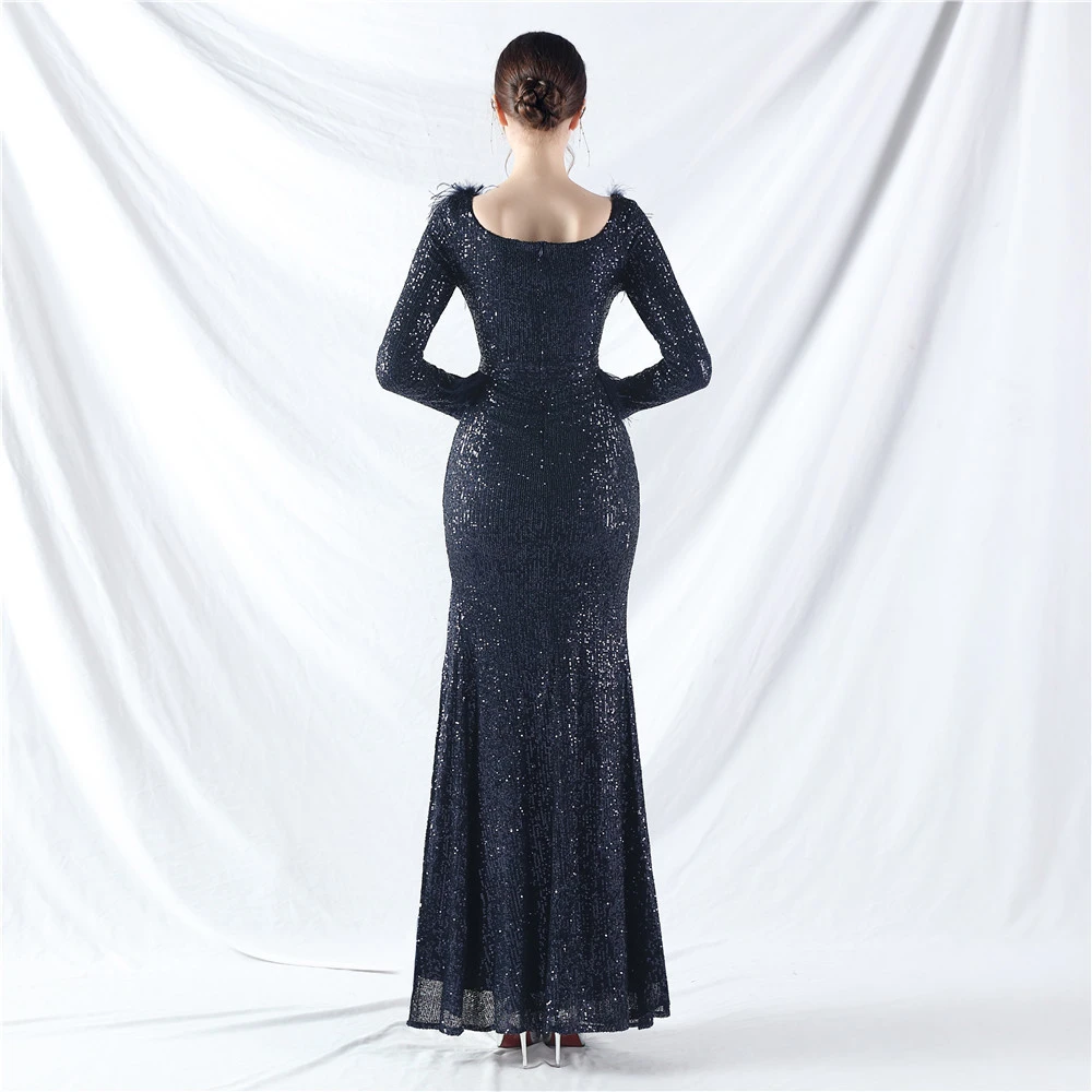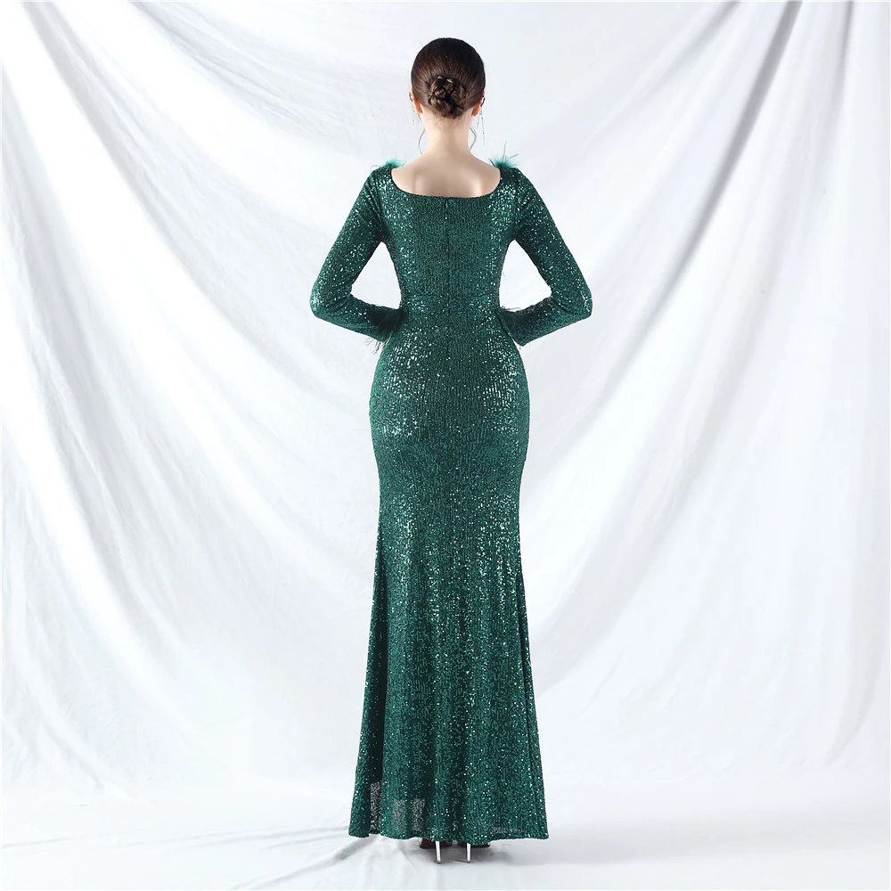 Craft-Made Ostrich Feather Long-Sleeved Beads Evening Dress