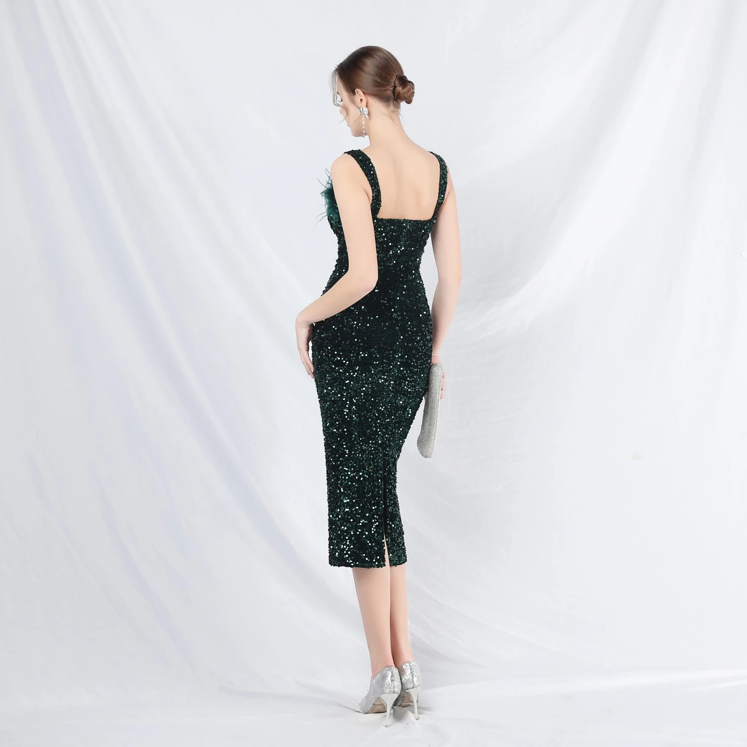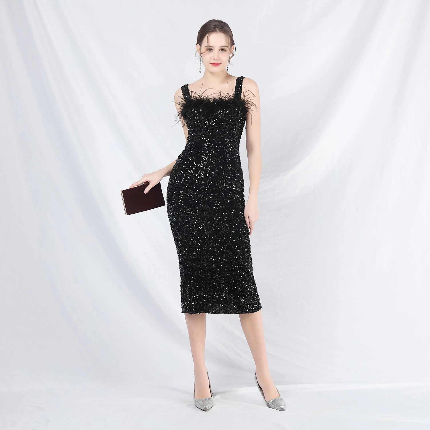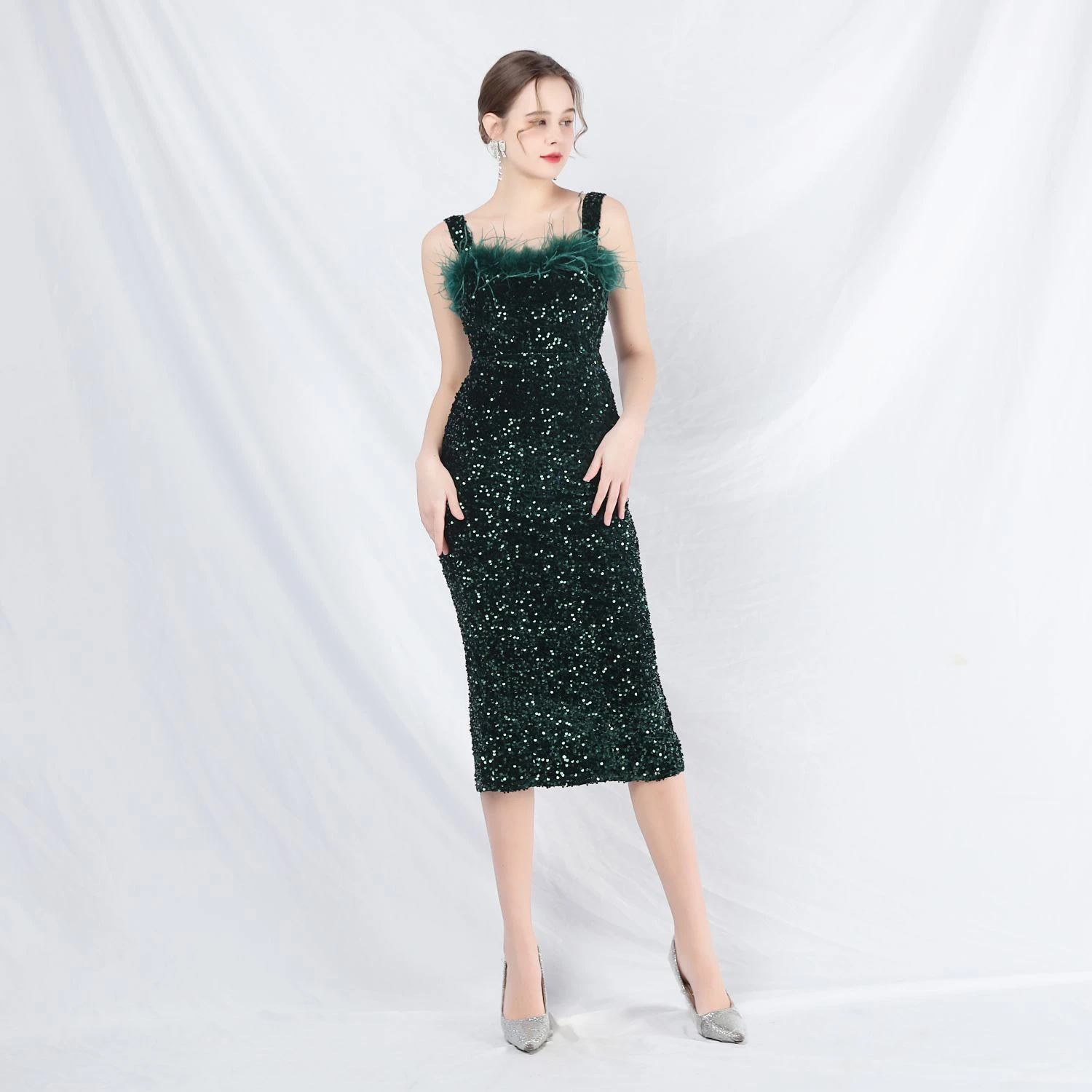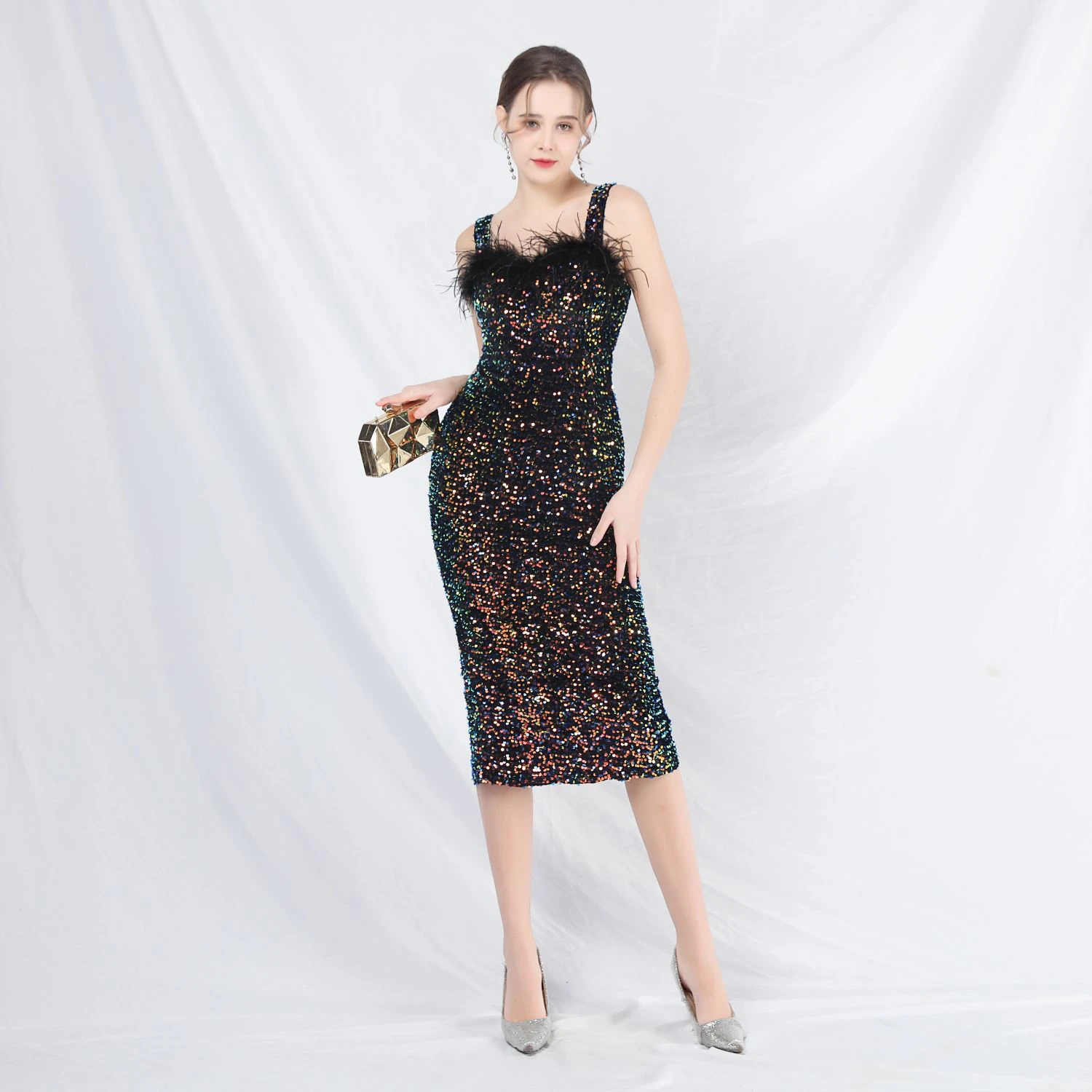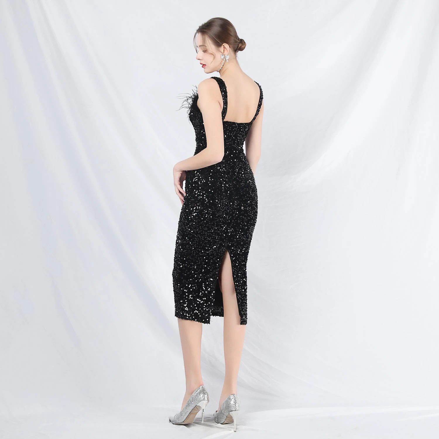 Craft Ostrich Feather Velvet Sequined Evening Dress