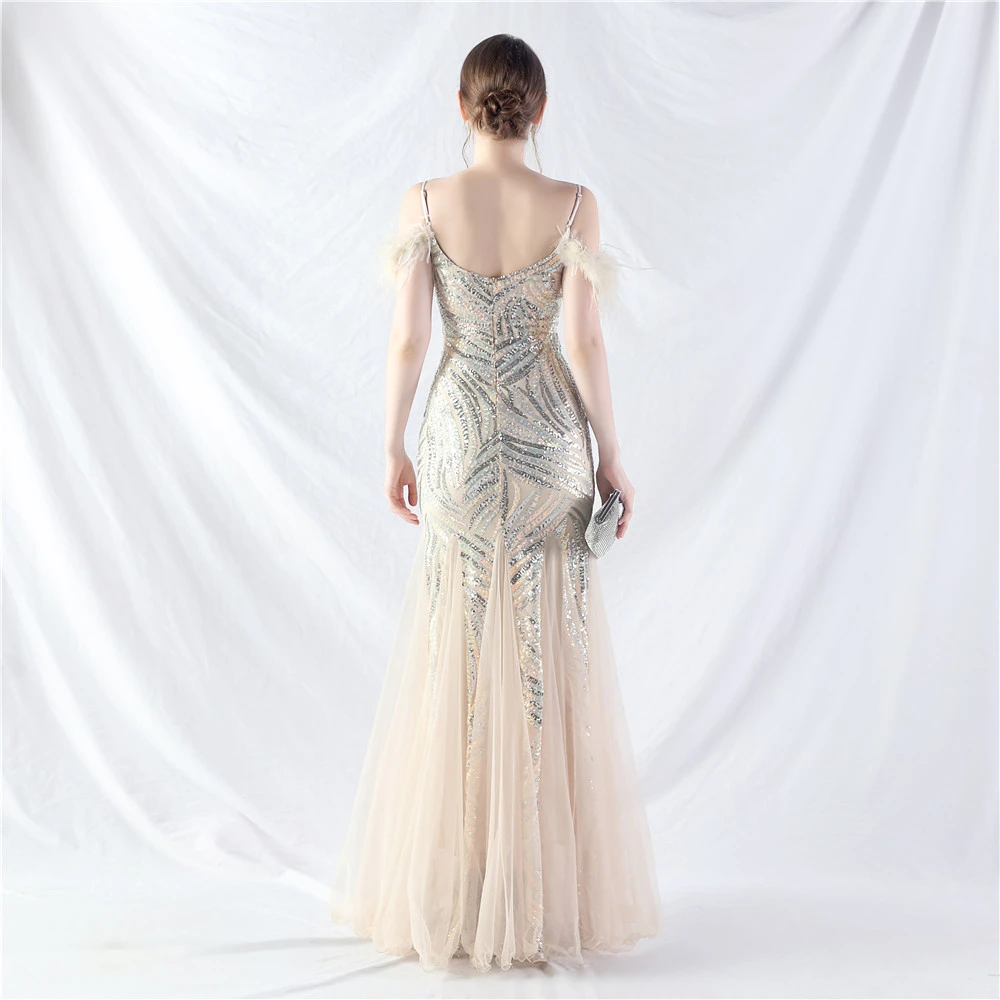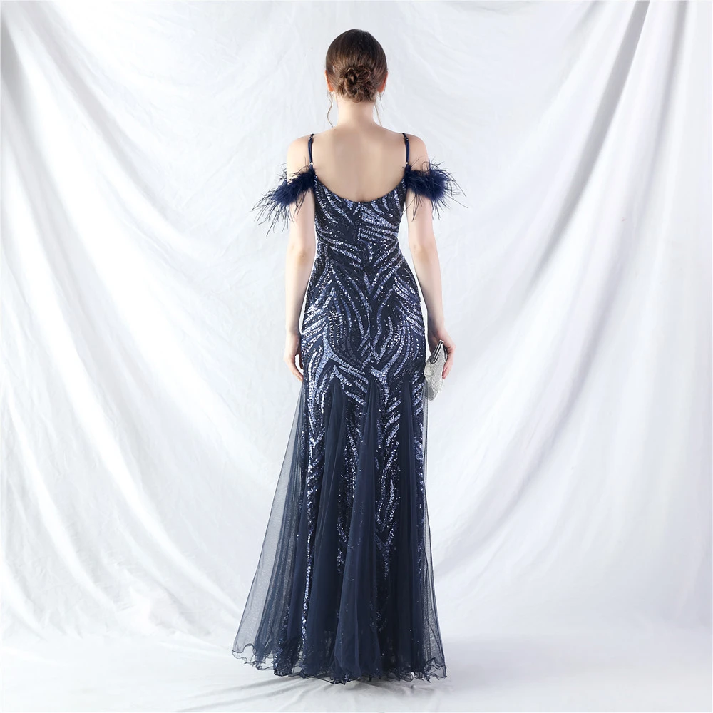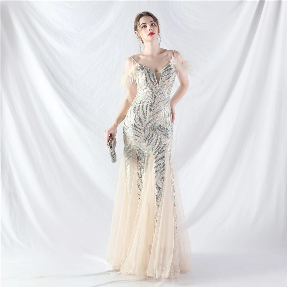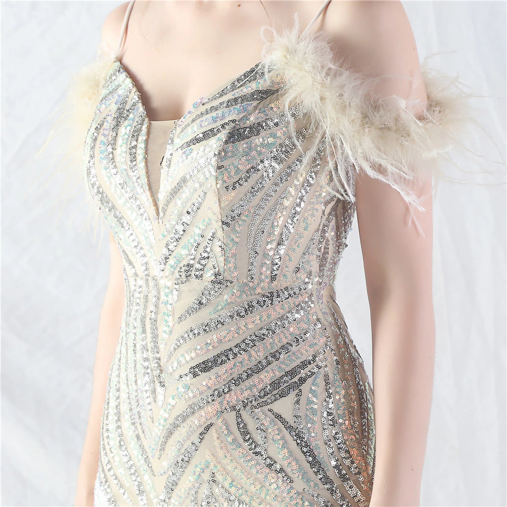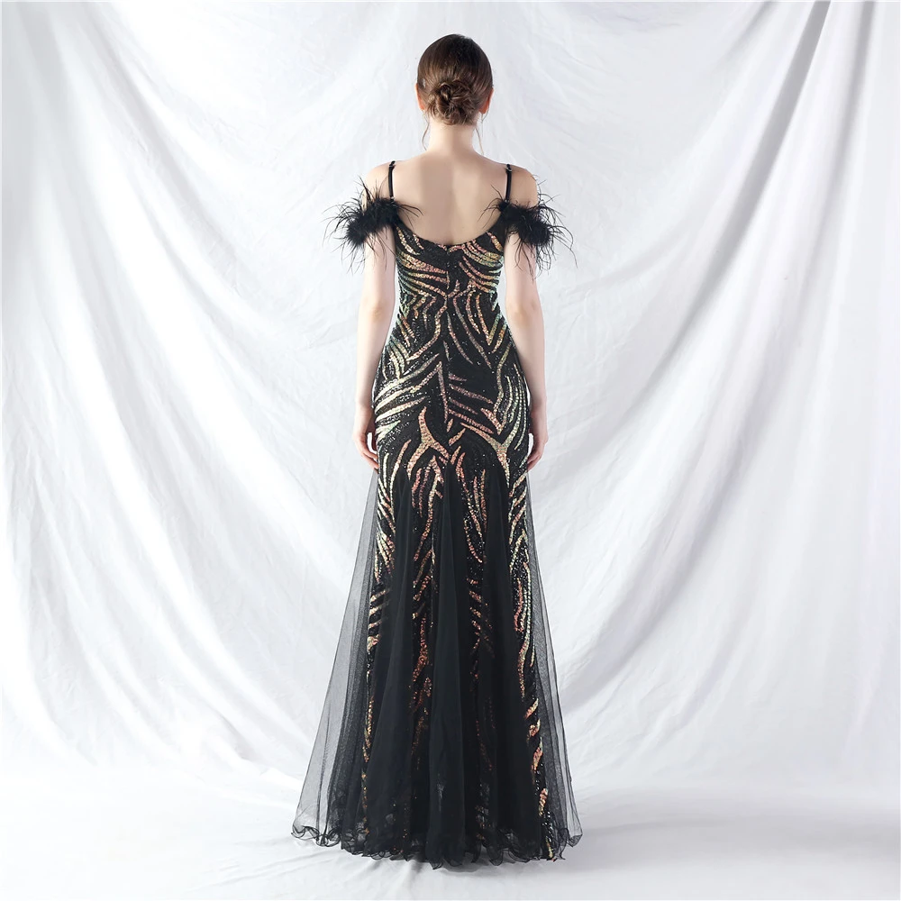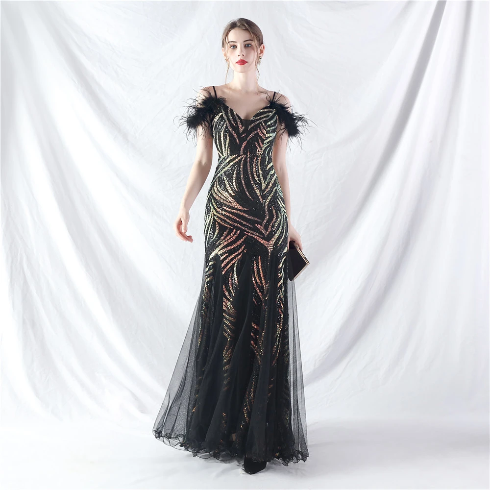 Crafted Ostrich Feather Stacked Sequins Splicing Mesh Gauze High-End Evening Dress Clothes