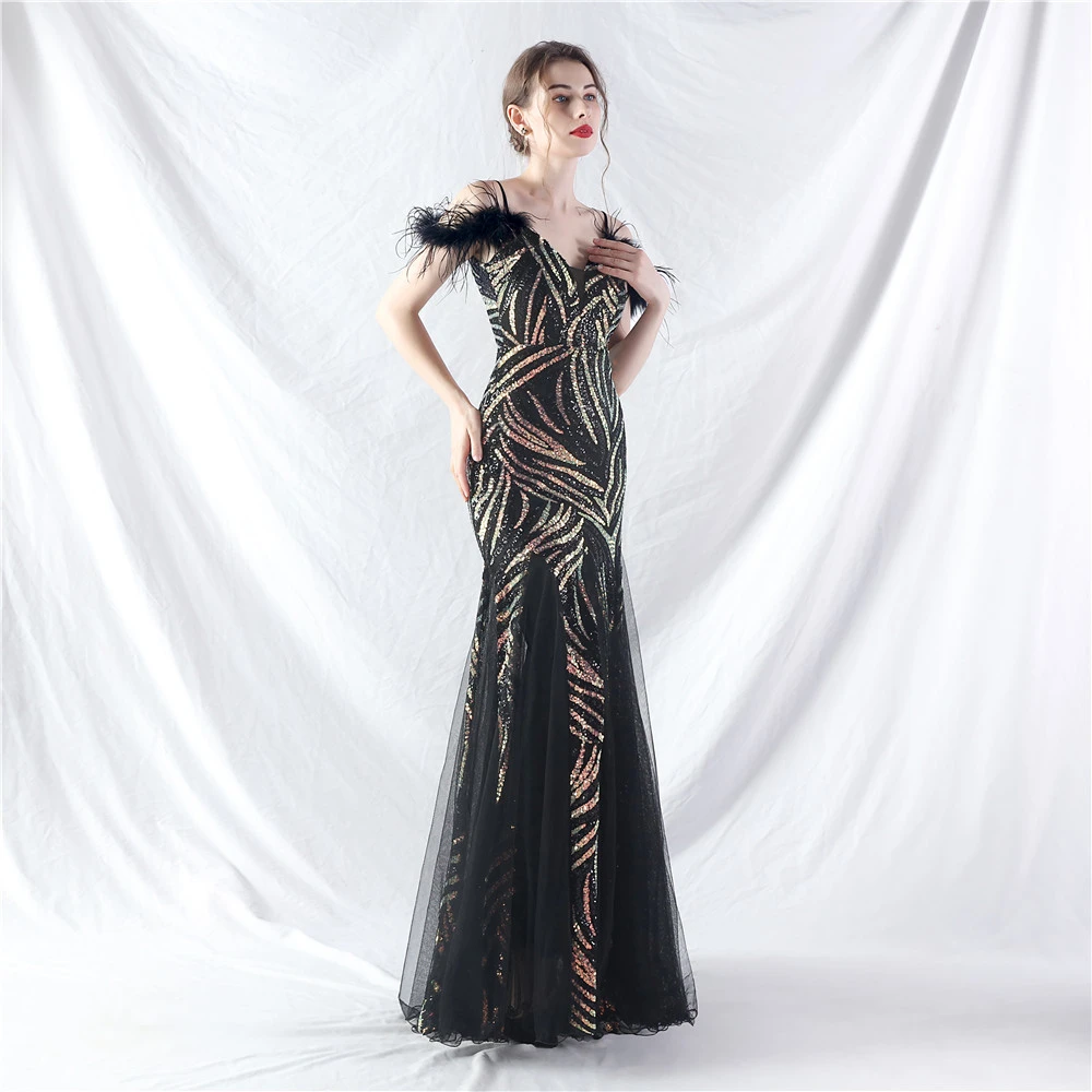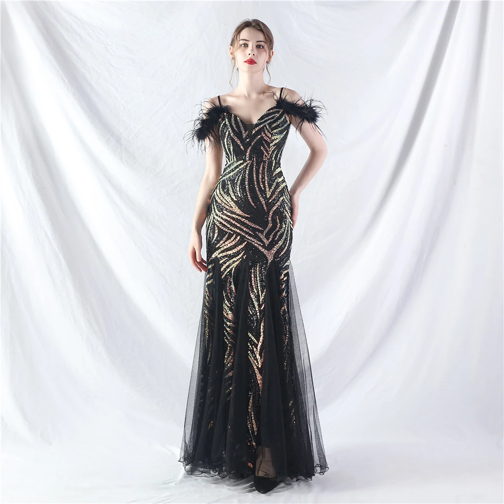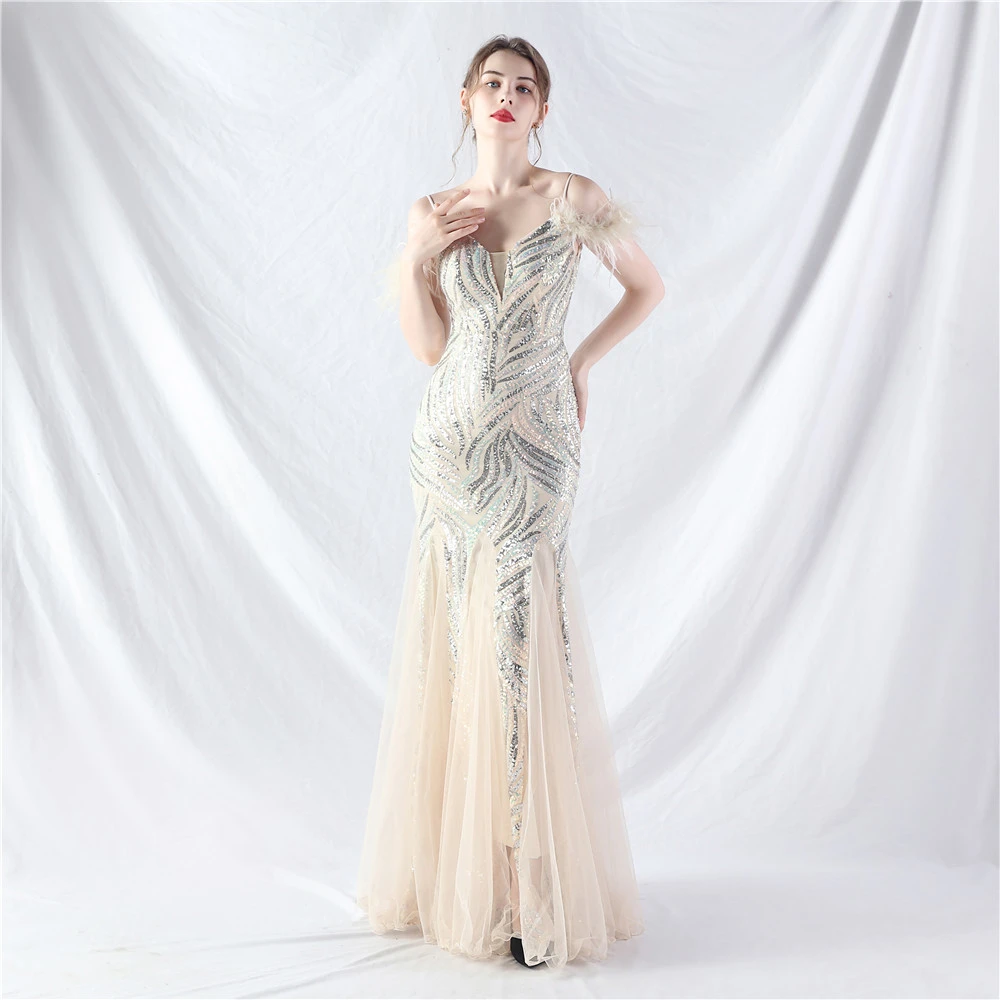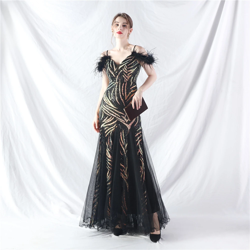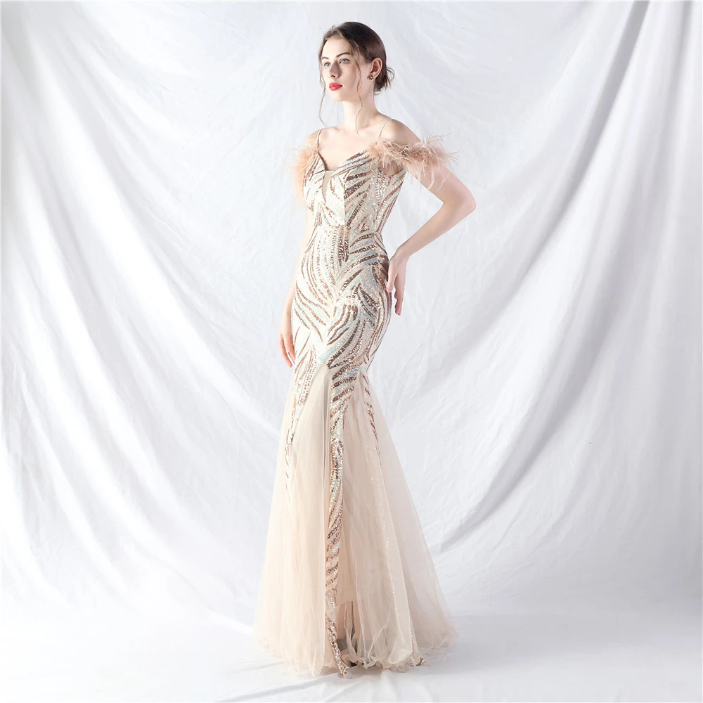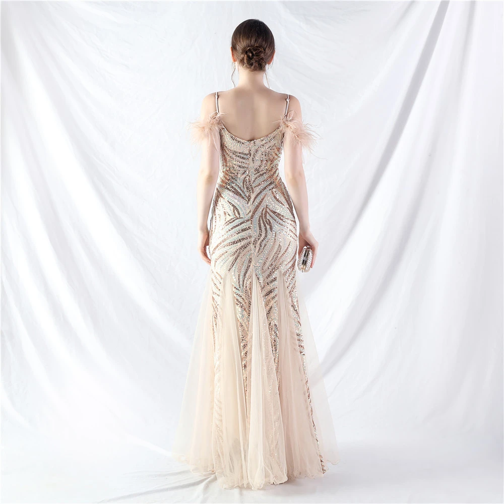 Crafted Ostrich Feather Stacked Sequins Splicing Mesh Gauze High-End Evening Dress Clothes