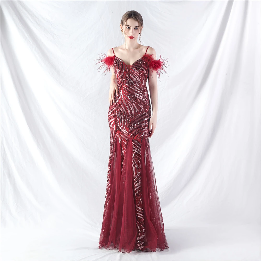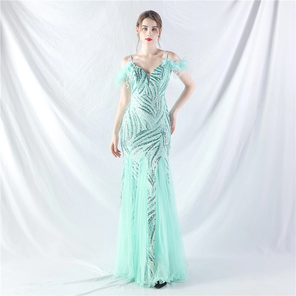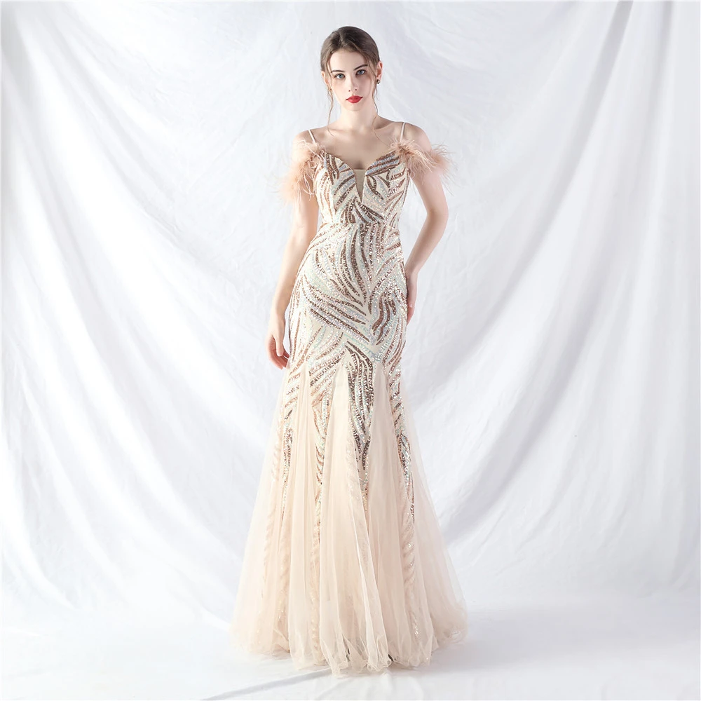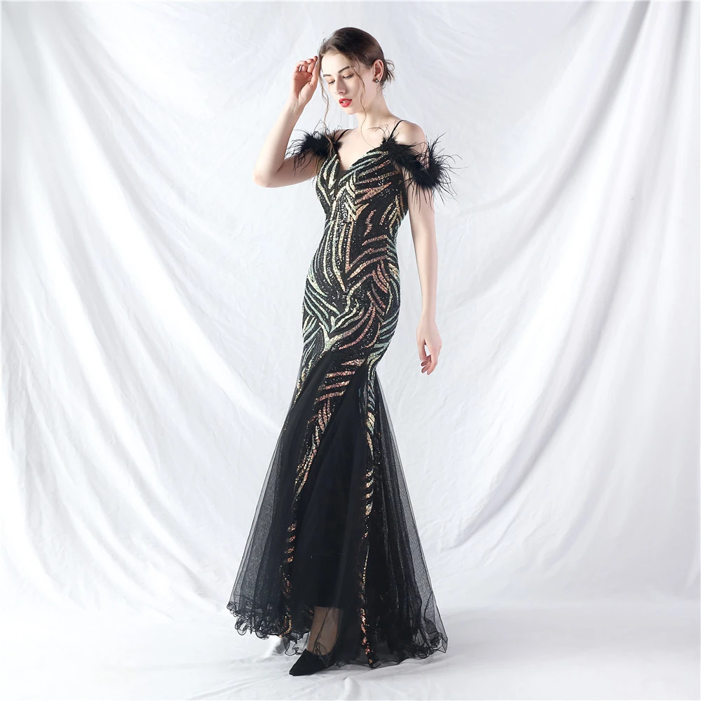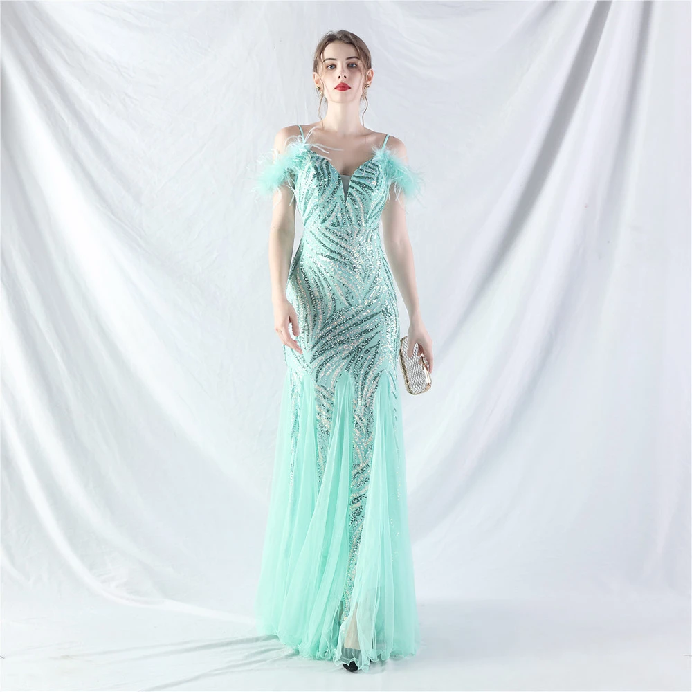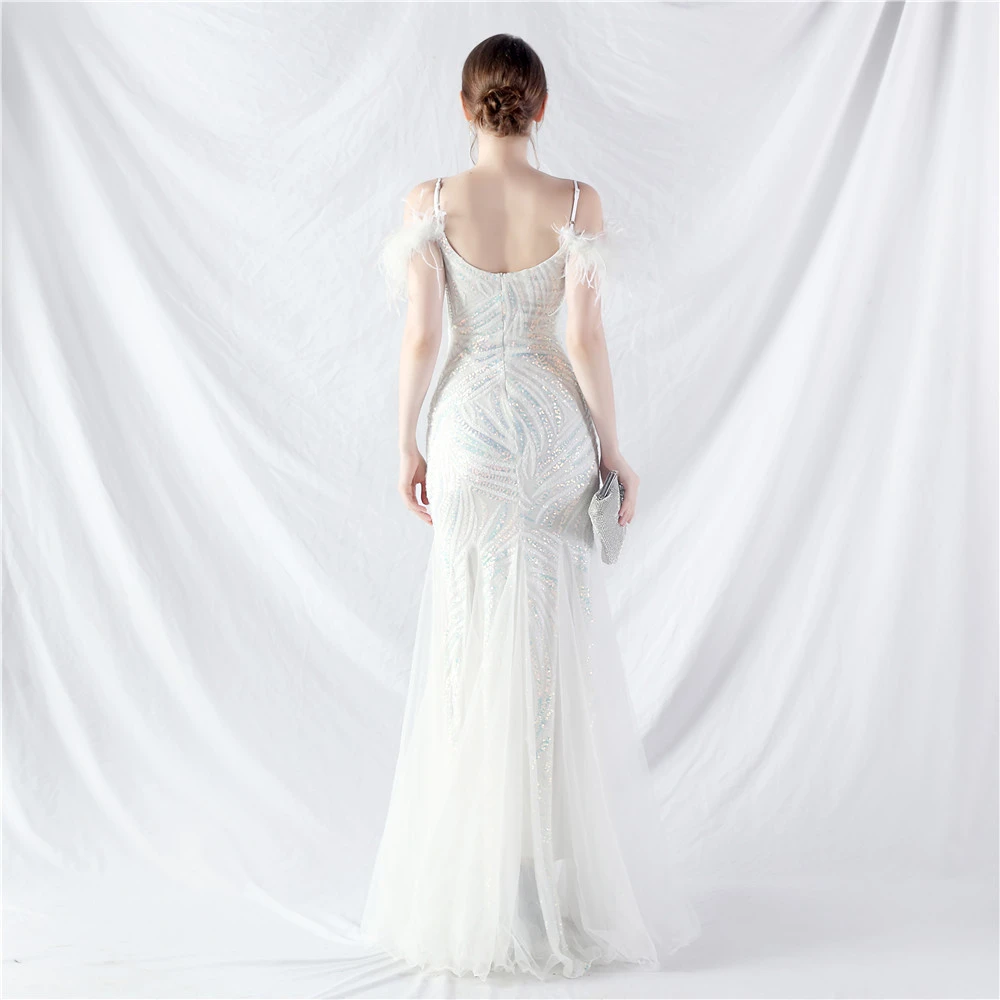 Crafted Ostrich Feather Stacked Sequins Splicing Mesh Gauze High-End Evening Dress Clothes