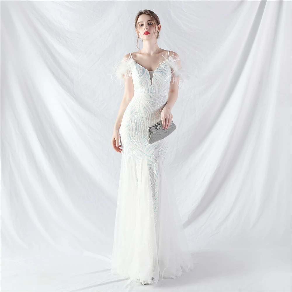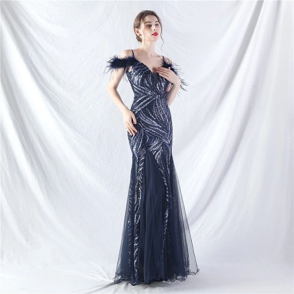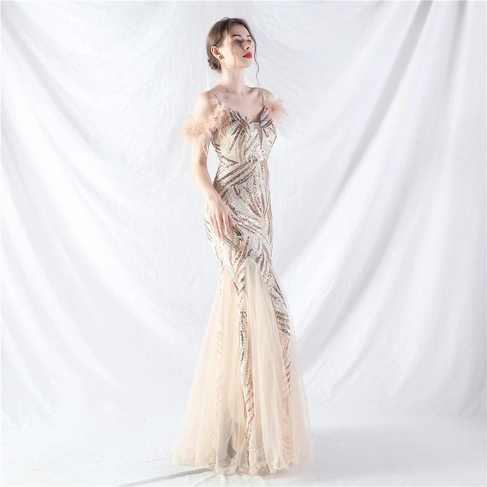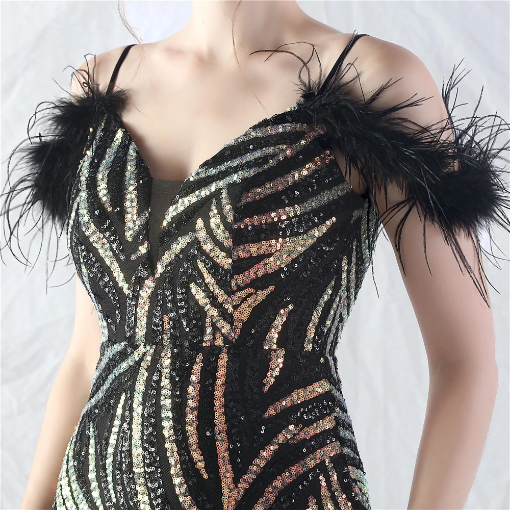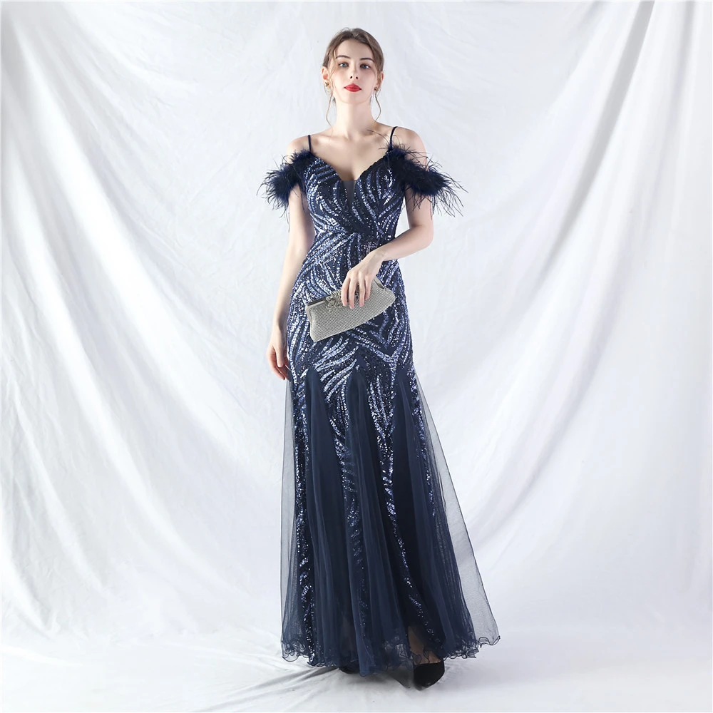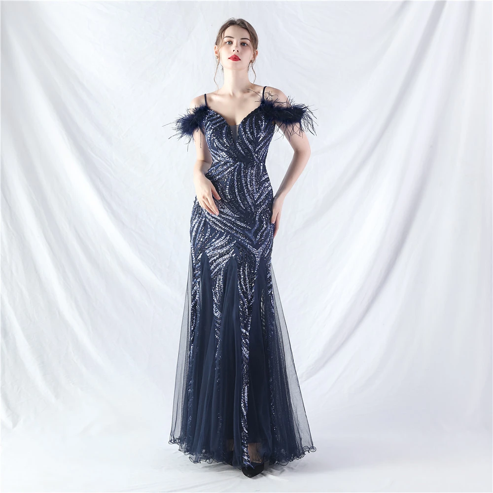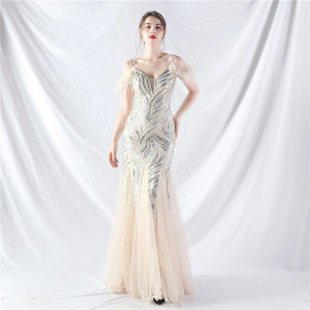 Crafted Ostrich Feather Stacked Sequins Splicing Mesh Gauze High-End Evening Dress Clothes