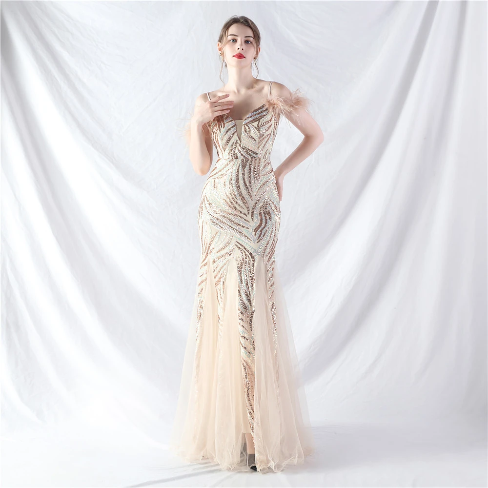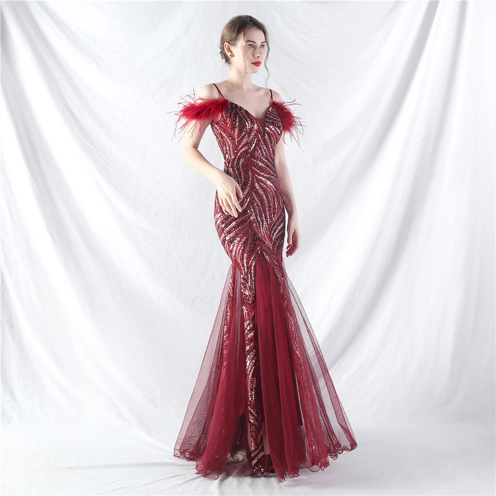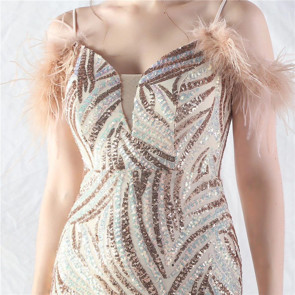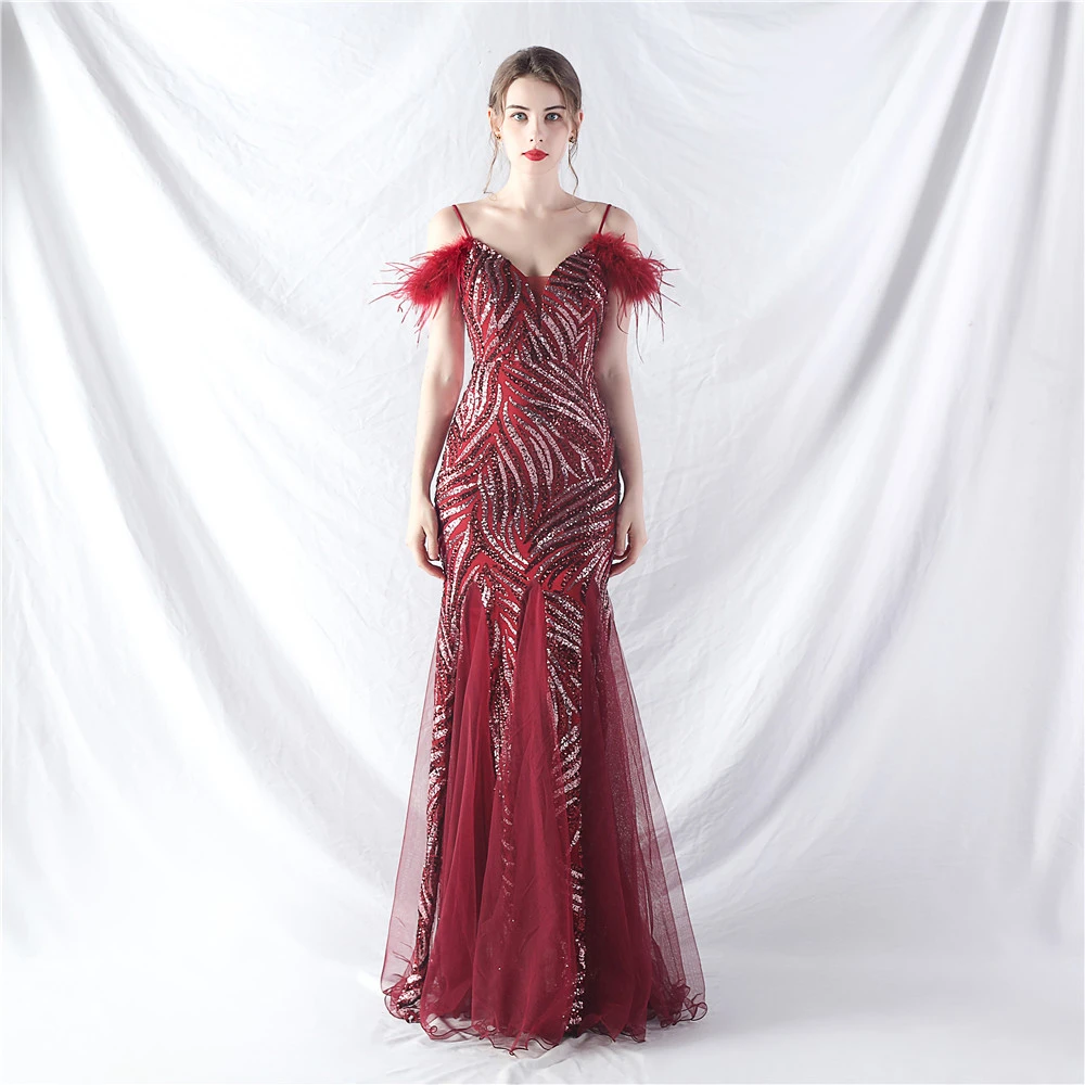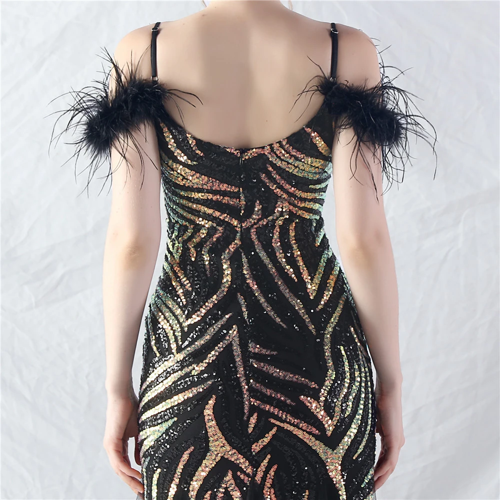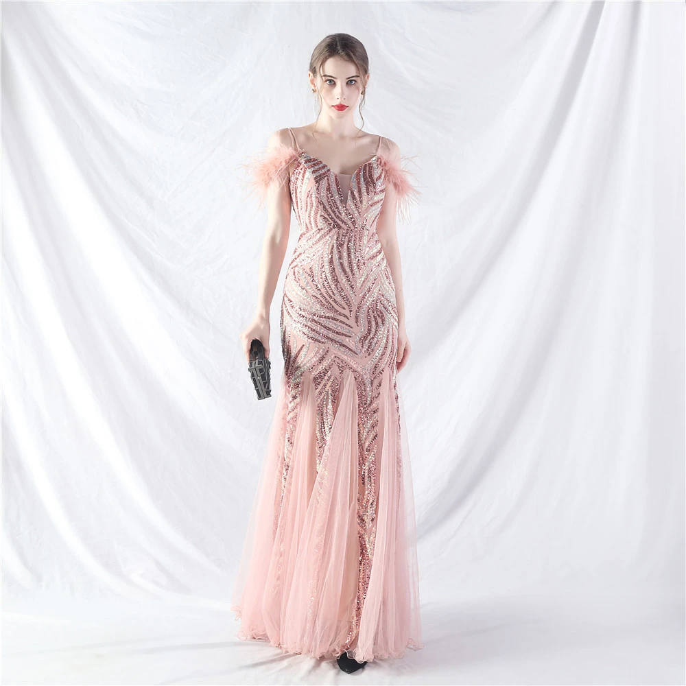Crafted Ostrich Feather Stacked Sequins Splicing Mesh Gauze High-End Evening Dress Clothes