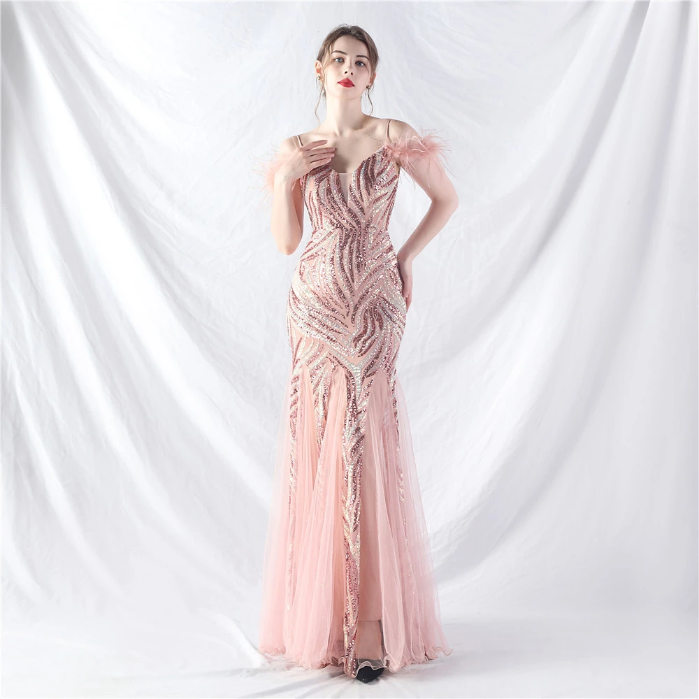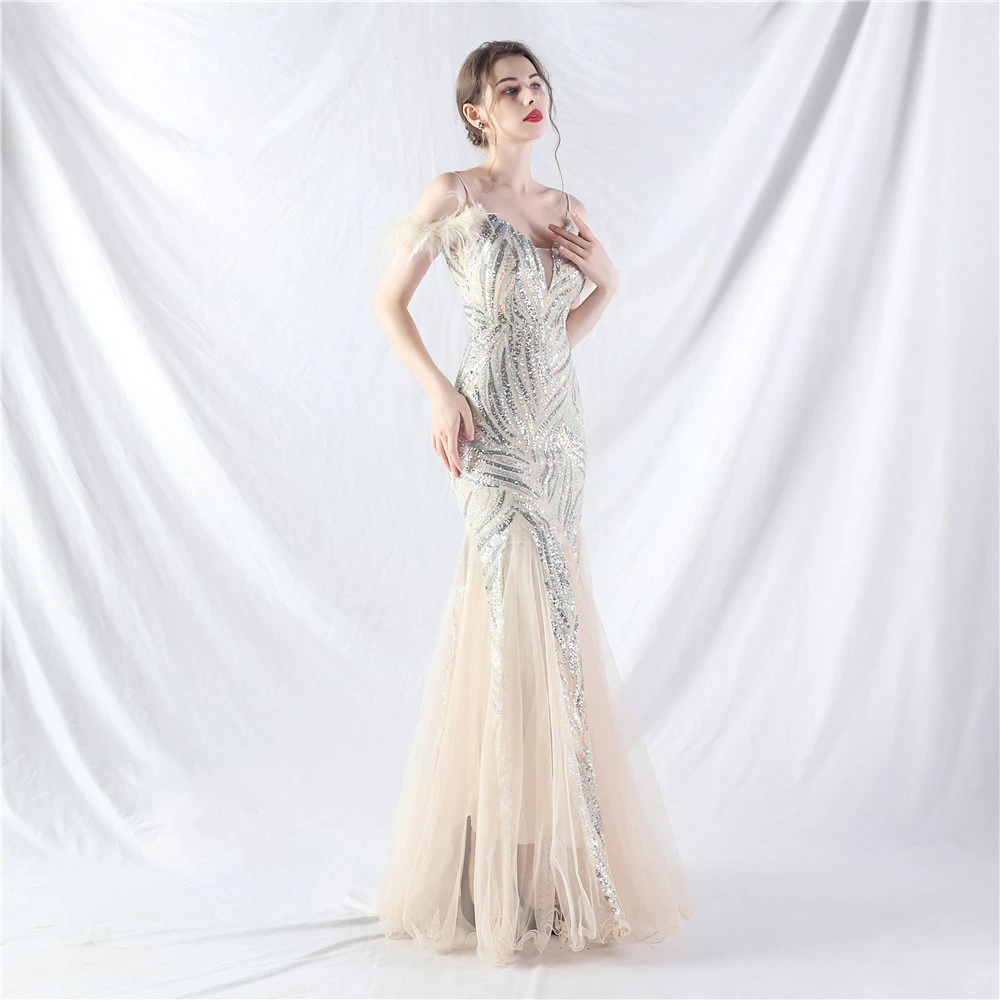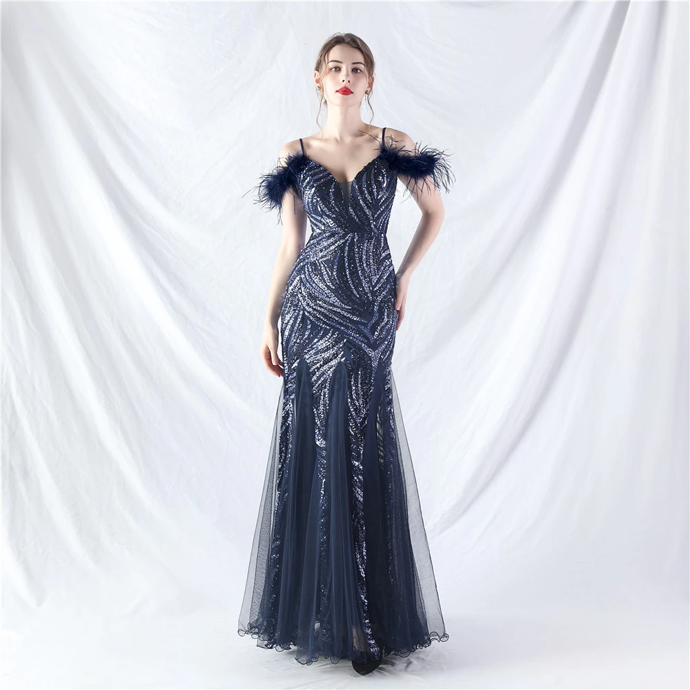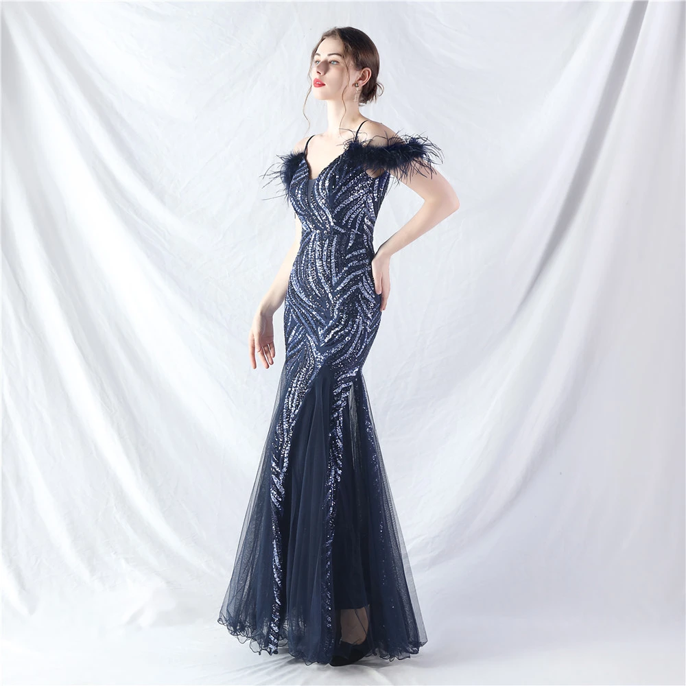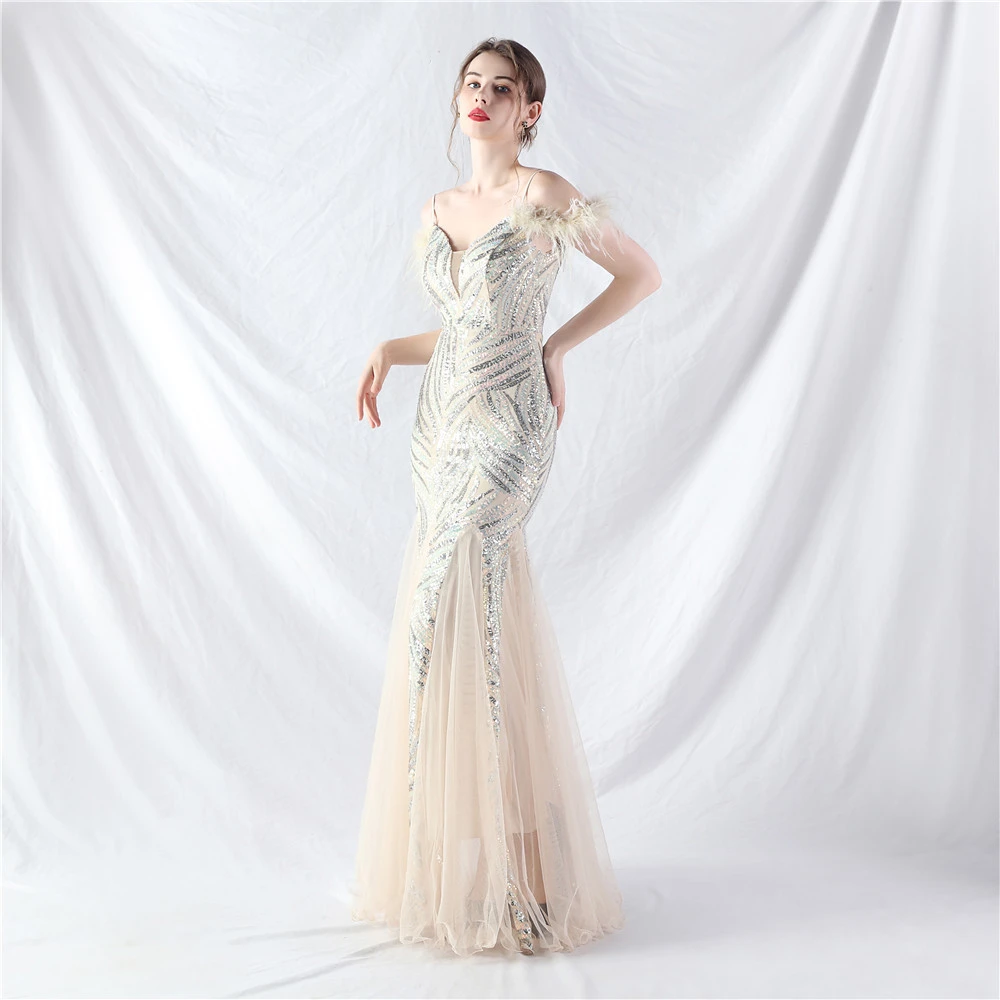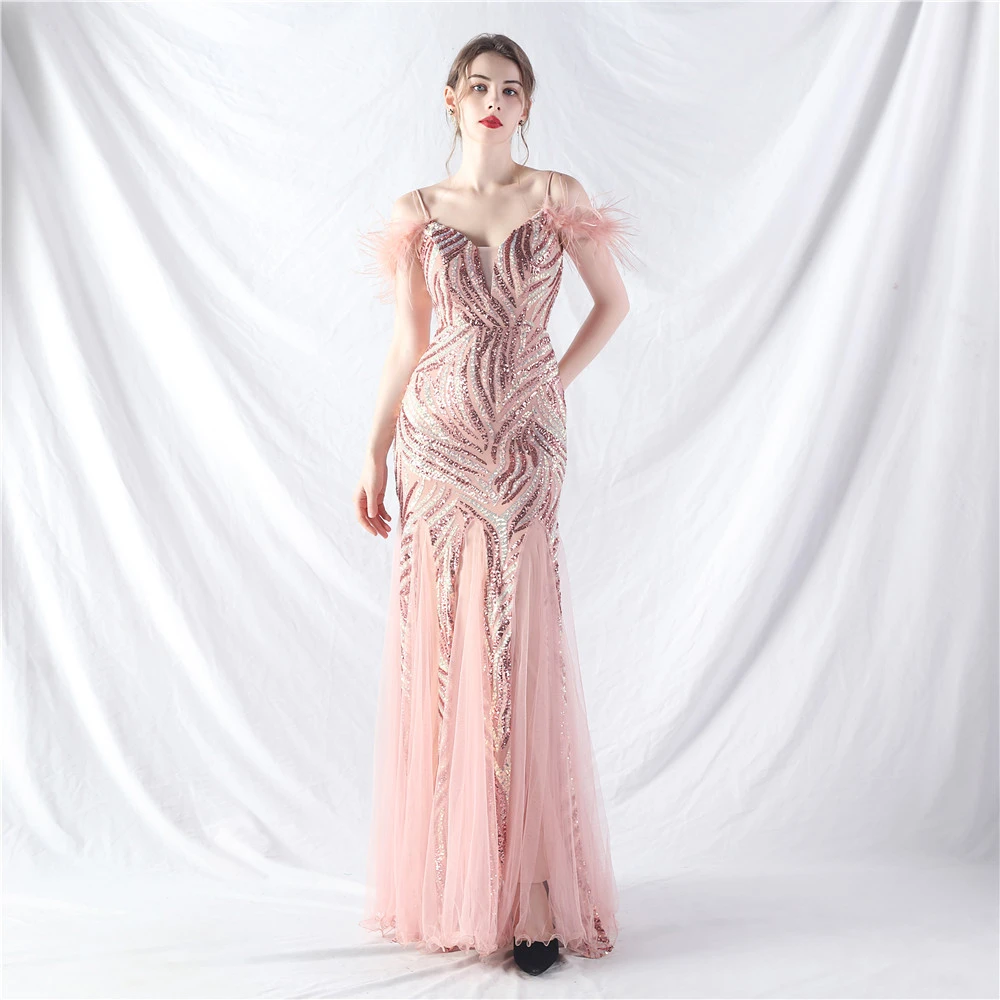 Crafted Ostrich Feather Stacked Sequins Splicing Mesh Gauze High-End Evening Dress Clothes