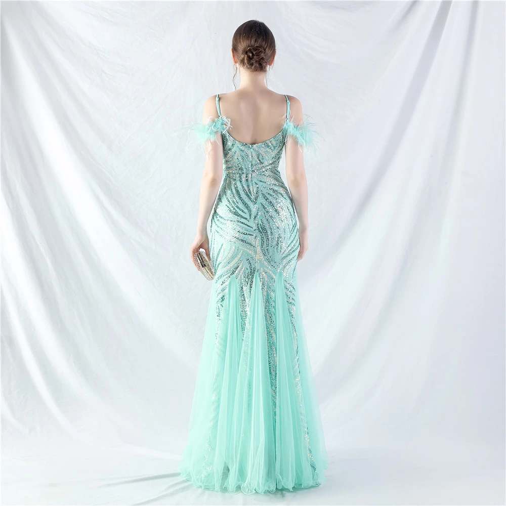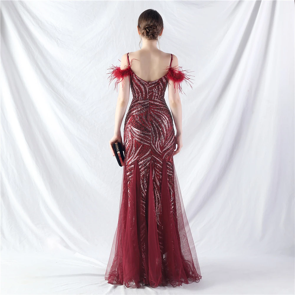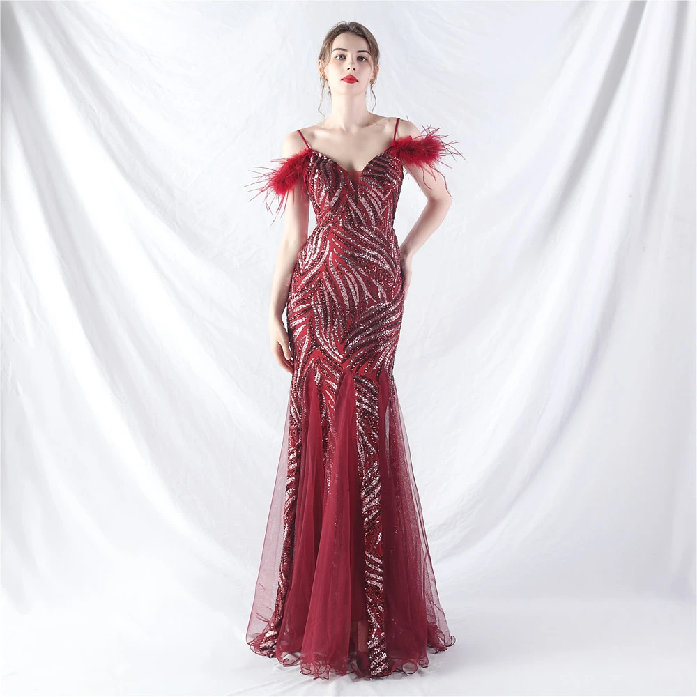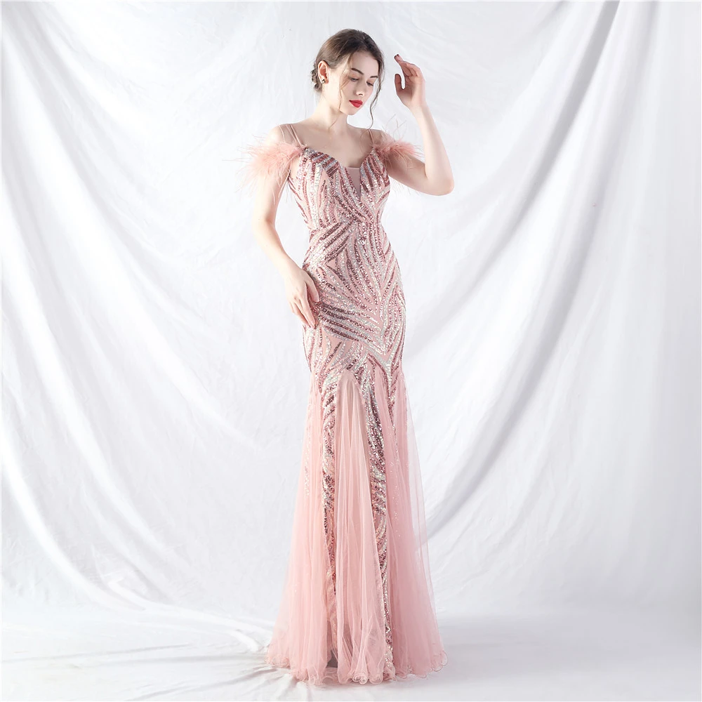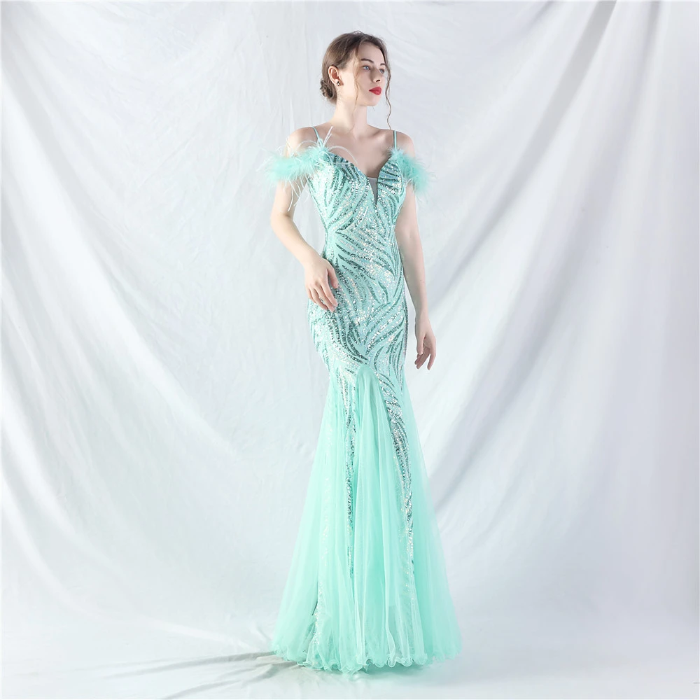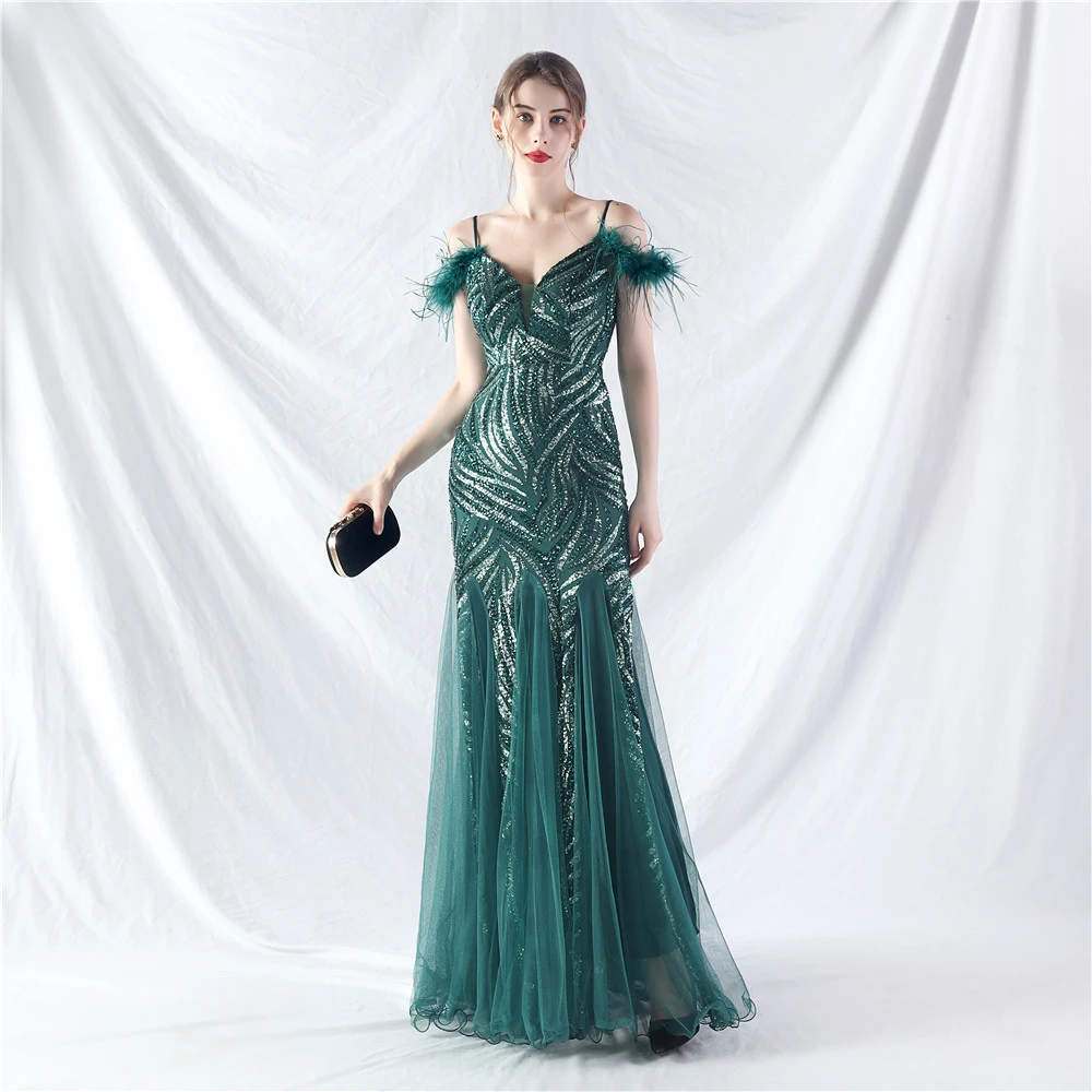 Crafted Ostrich Feather Stacked Sequins Splicing Mesh Gauze High-End Evening Dress Clothes