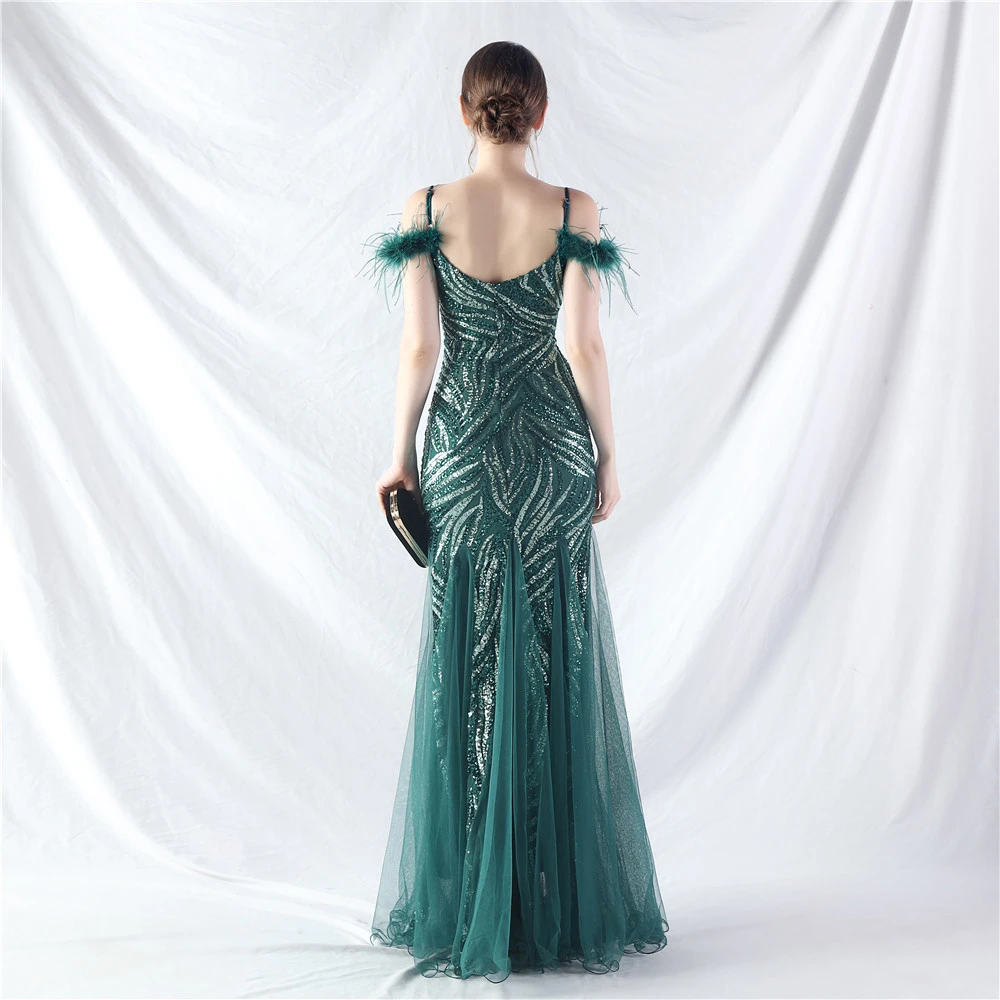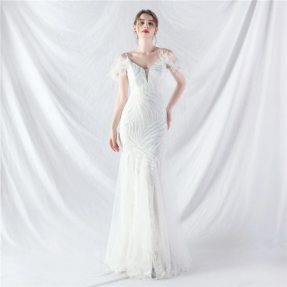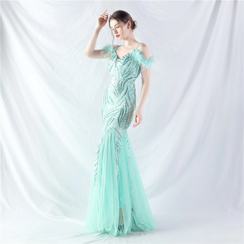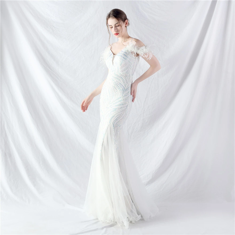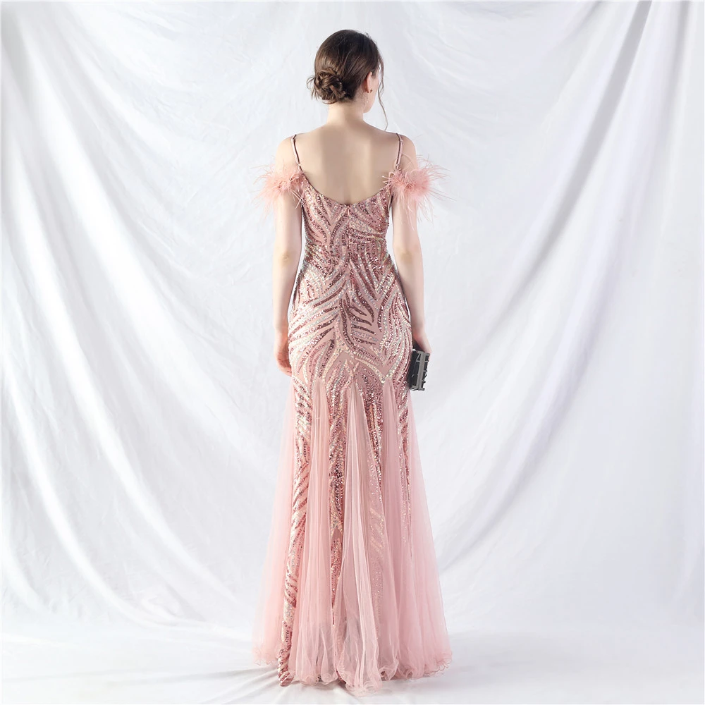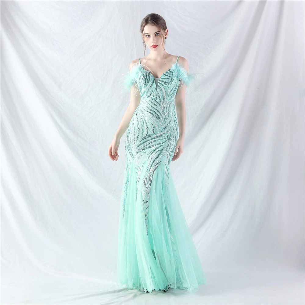 Crafted Ostrich Feather Stacked Sequins Splicing Mesh Gauze High-End Evening Dress Clothes