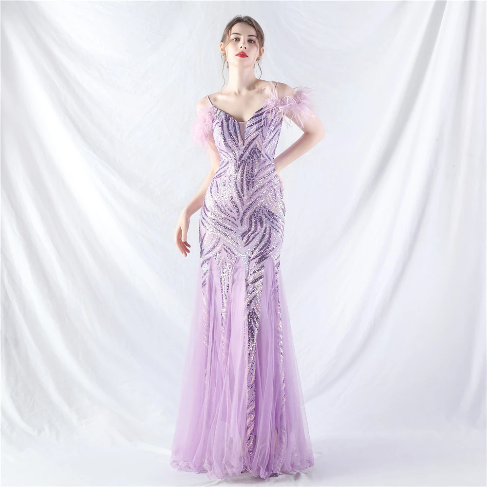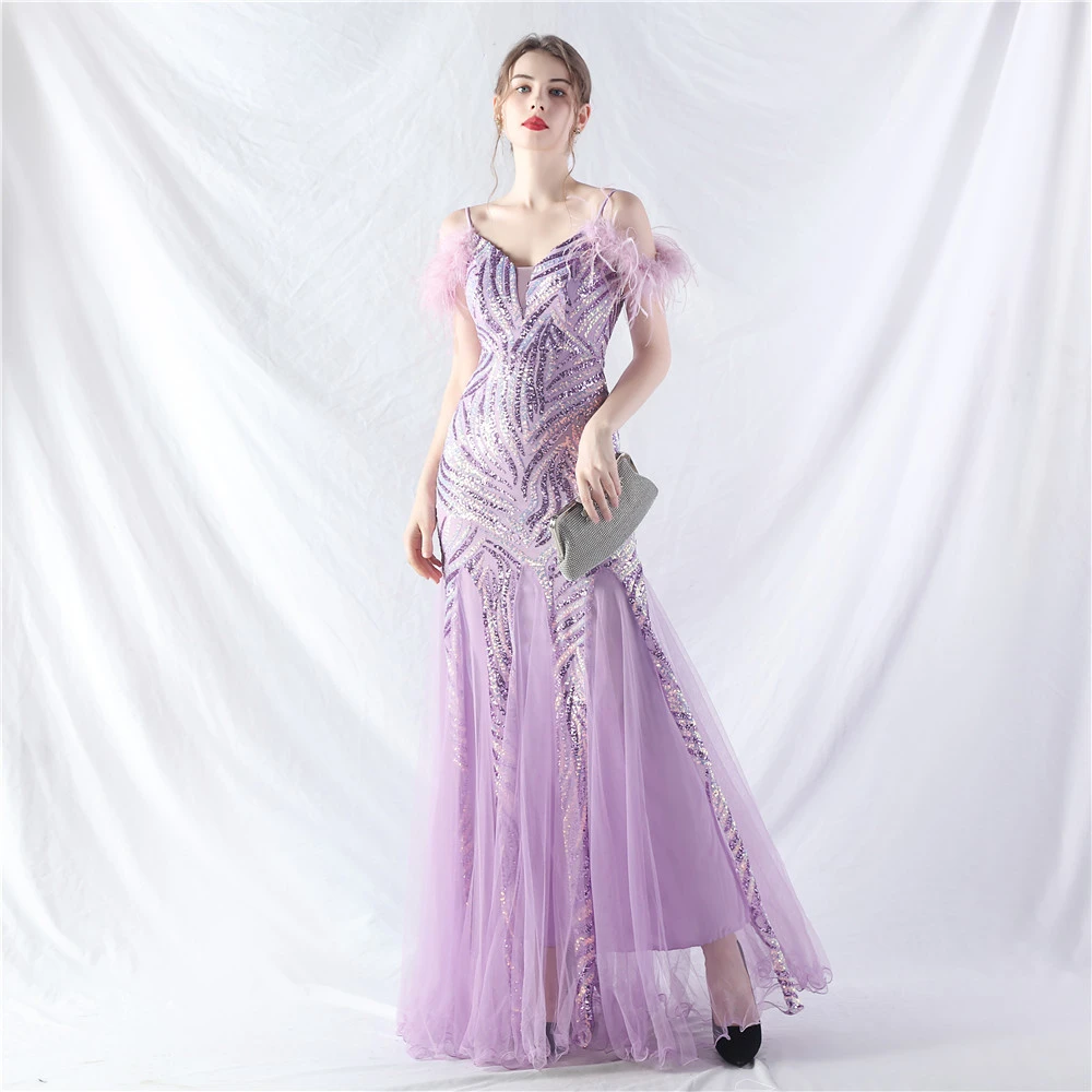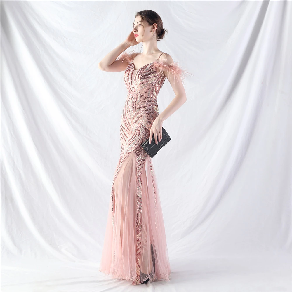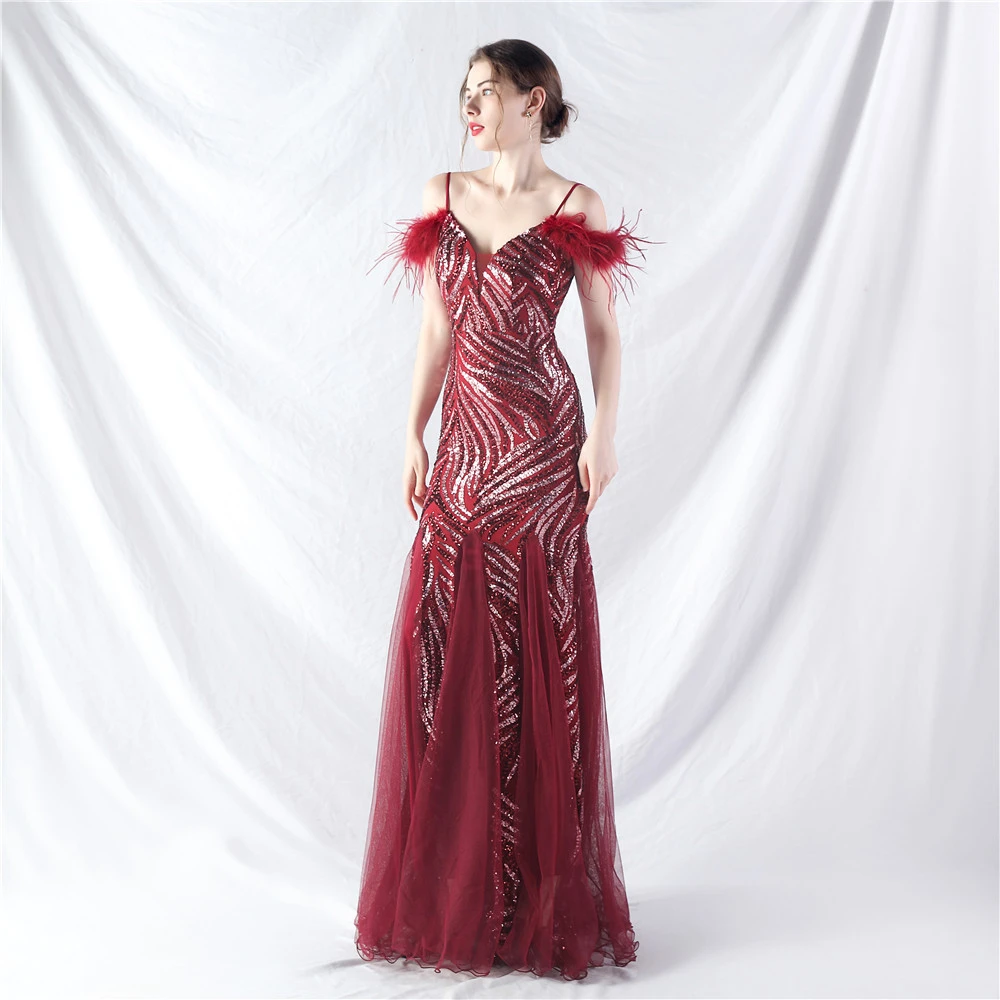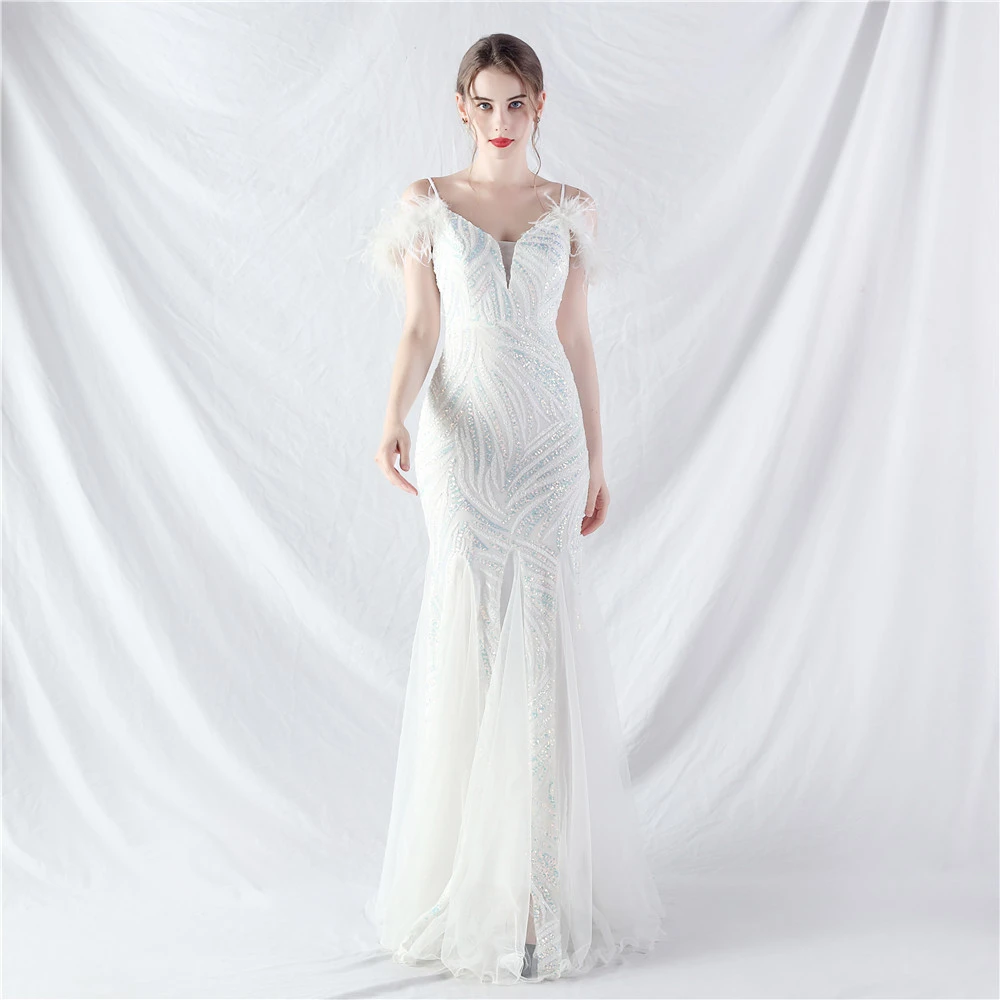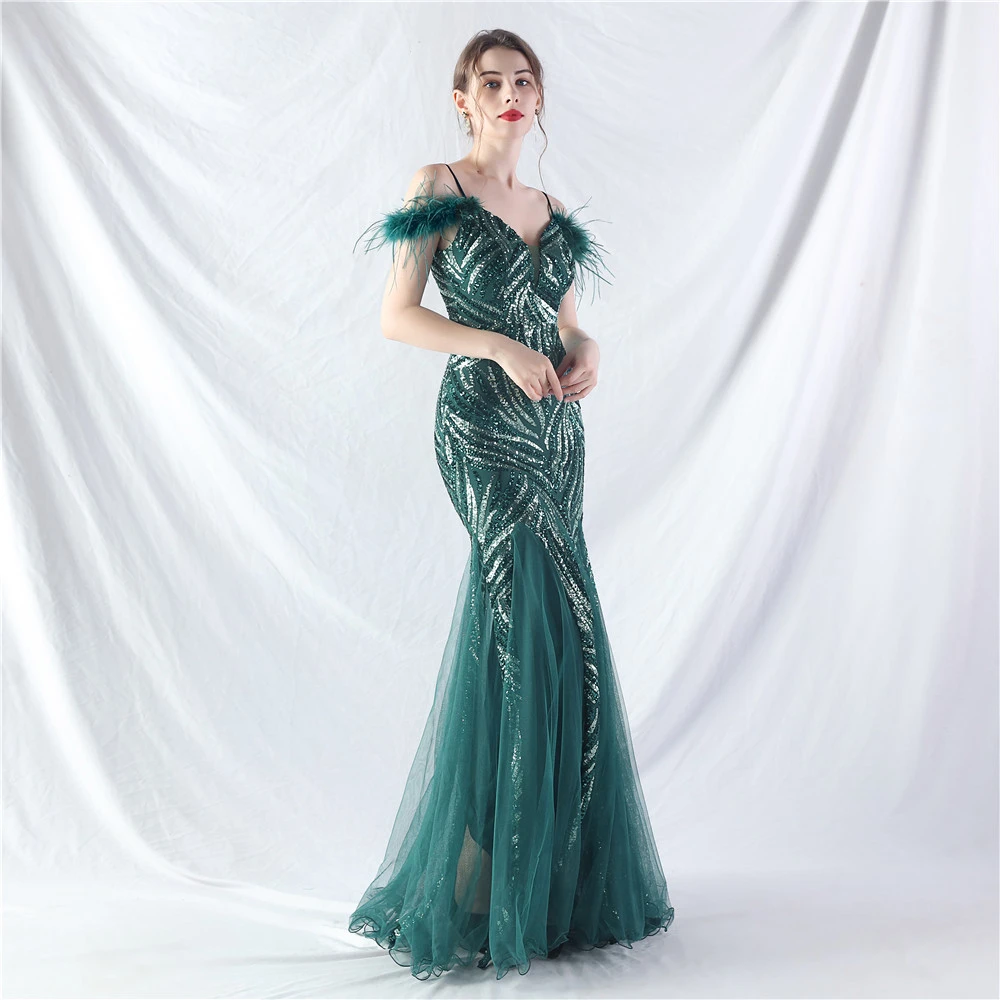 Crafted Ostrich Feather Stacked Sequins Splicing Mesh Gauze High-End Evening Dress Clothes