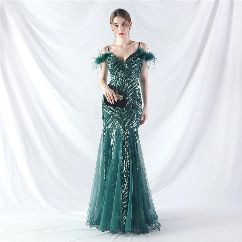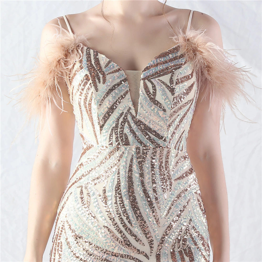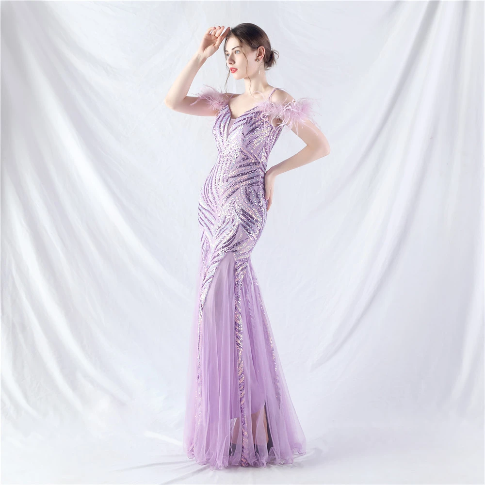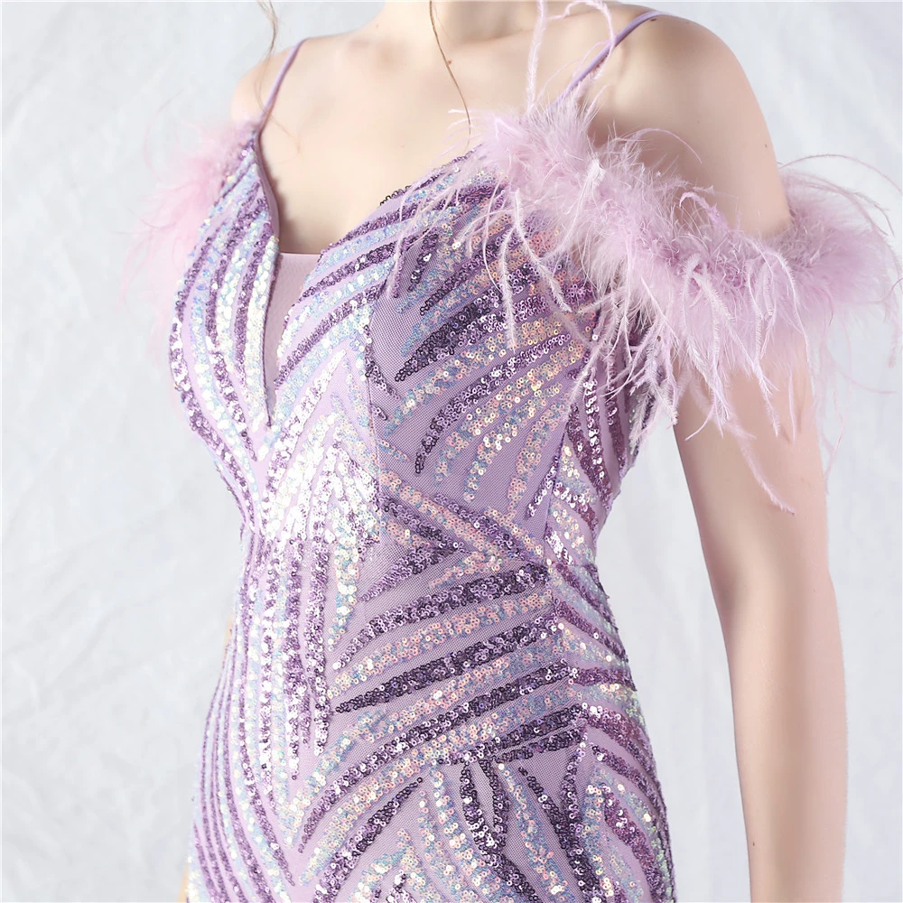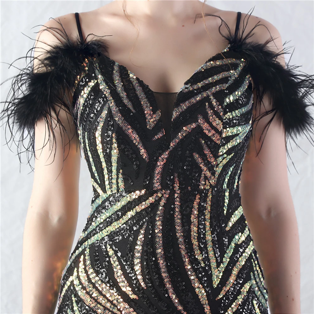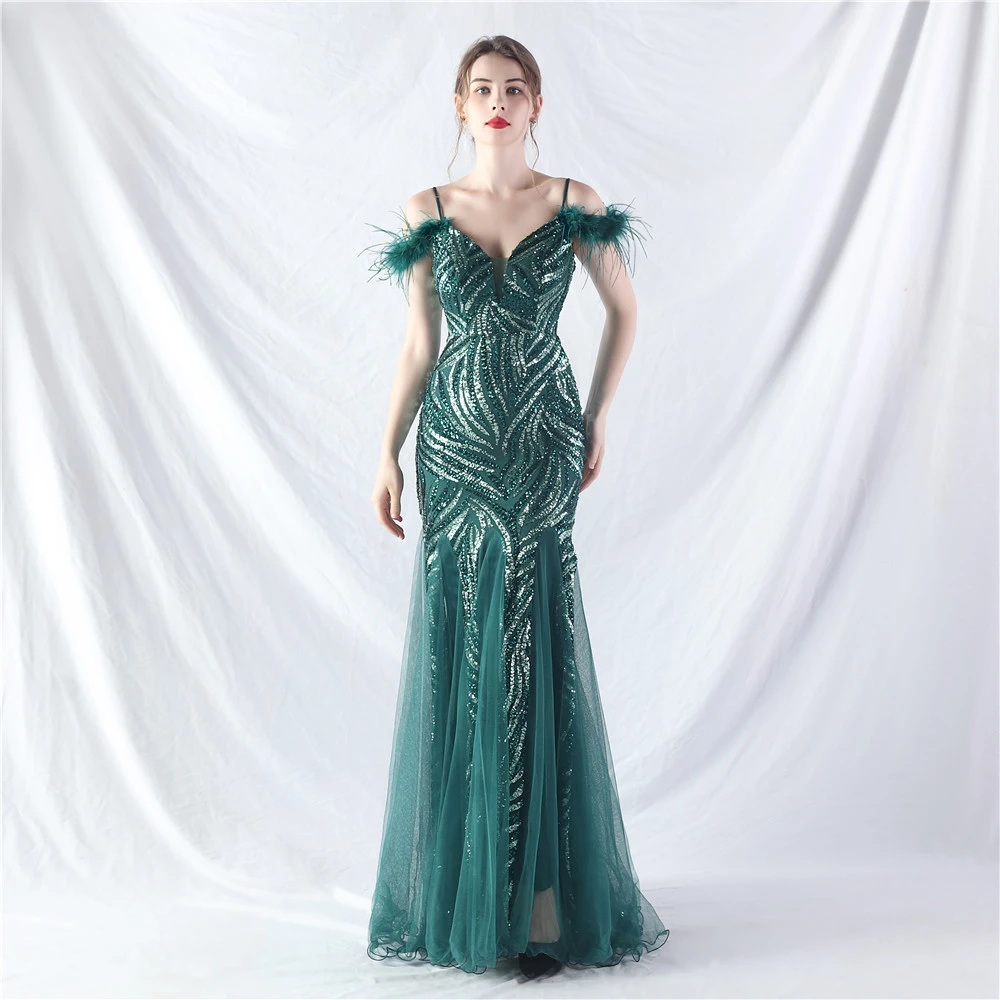 Crafted Ostrich Feather Stacked Sequins Splicing Mesh Gauze High-End Evening Dress Clothes