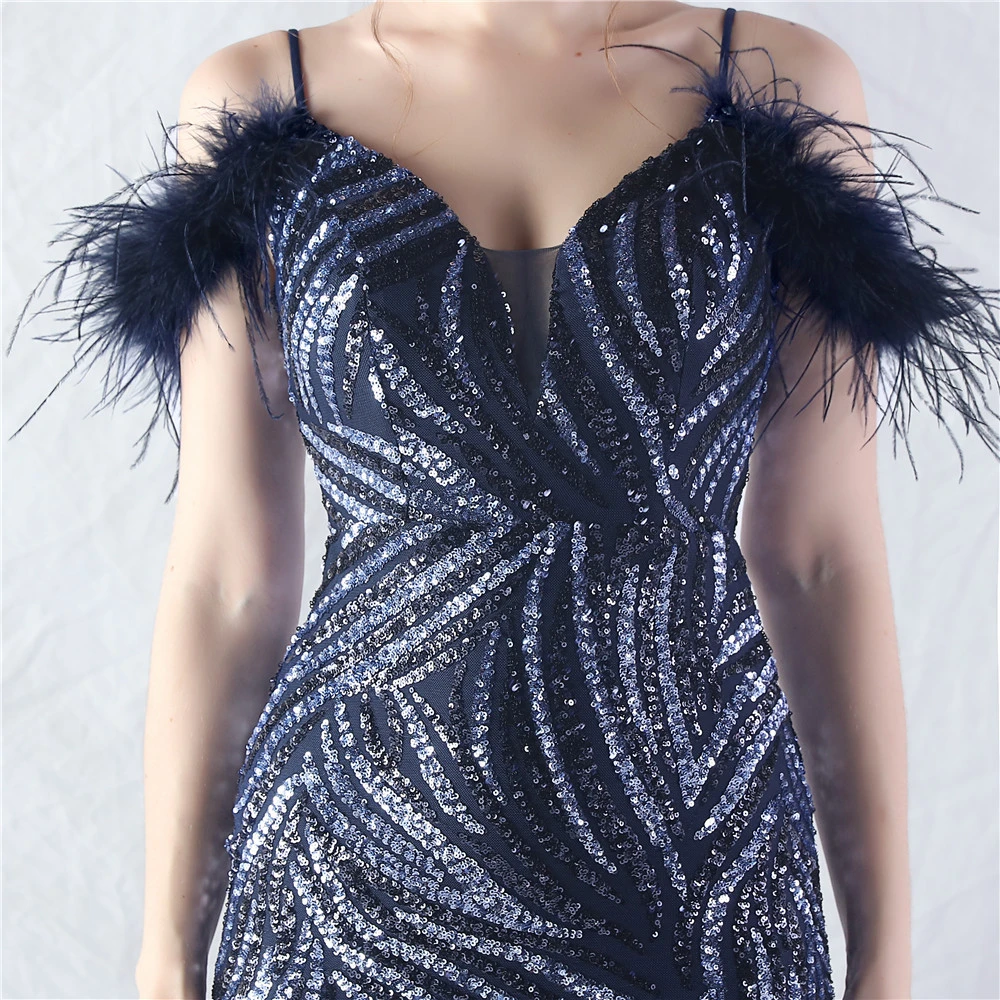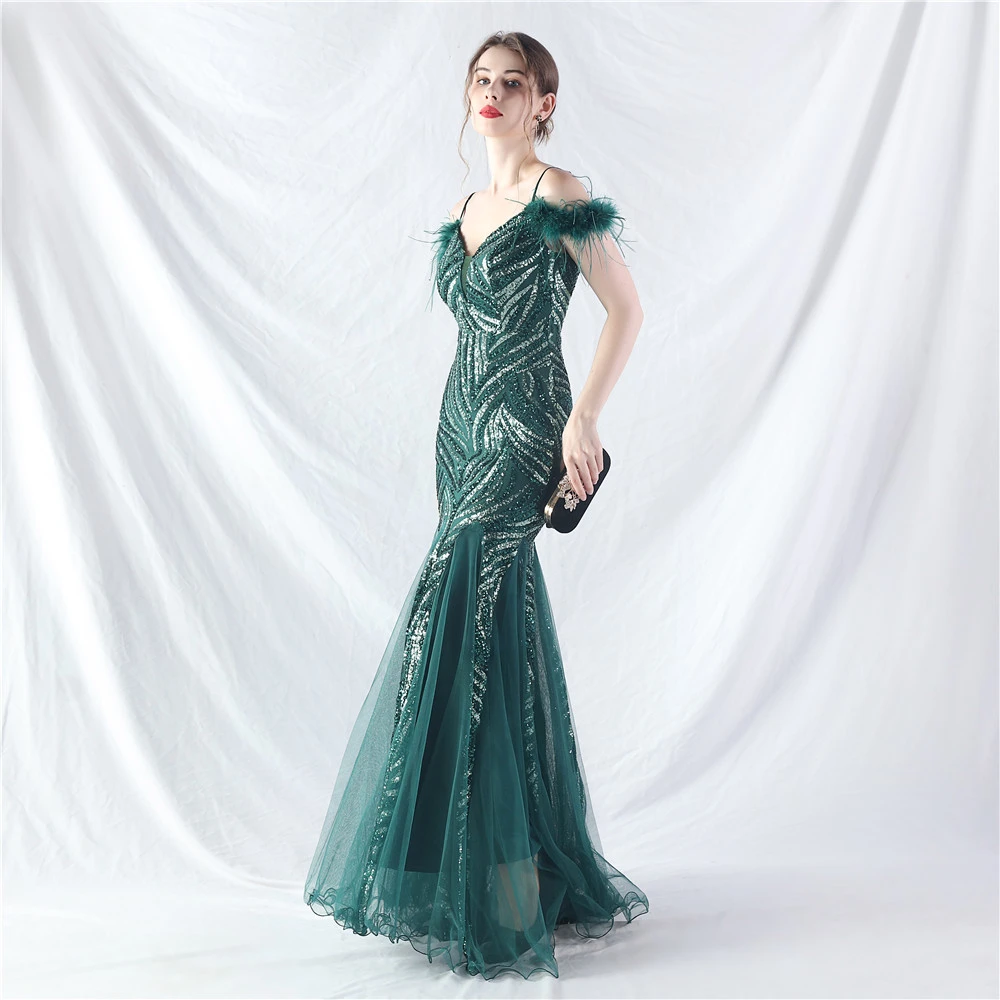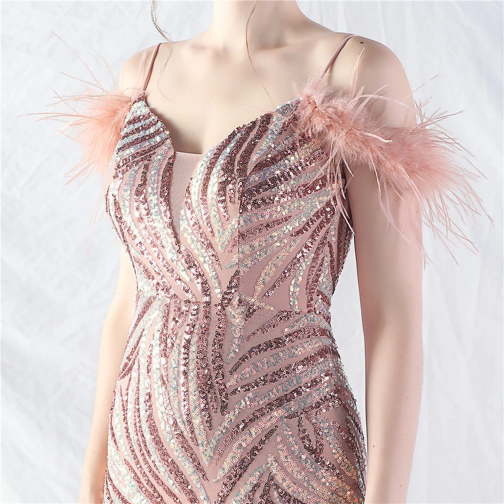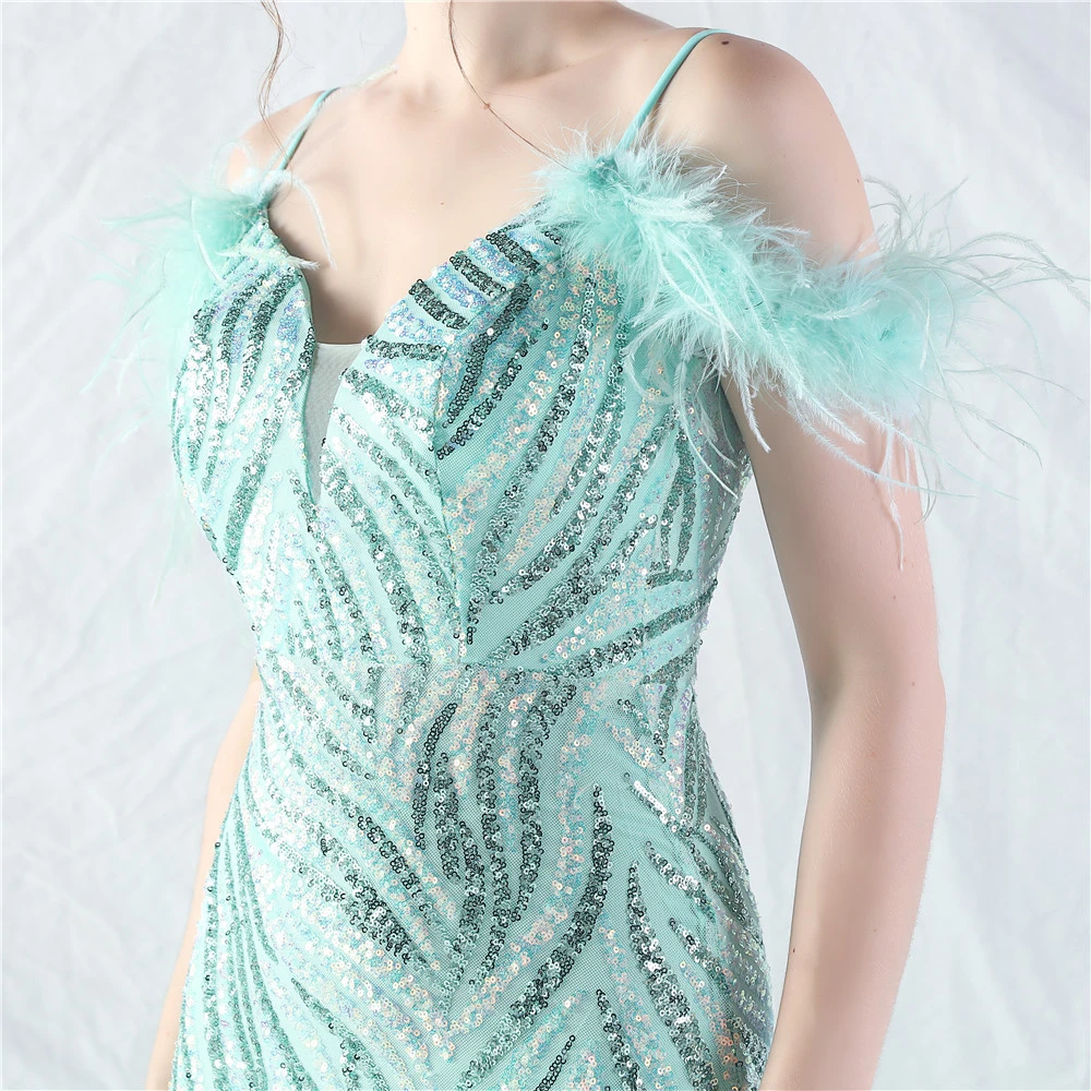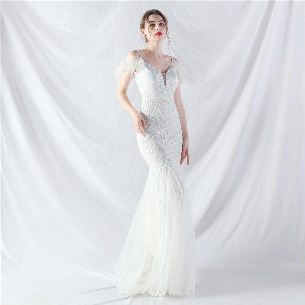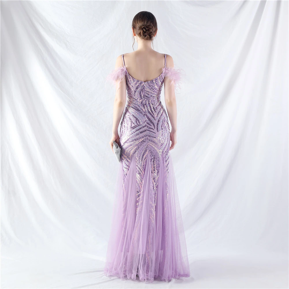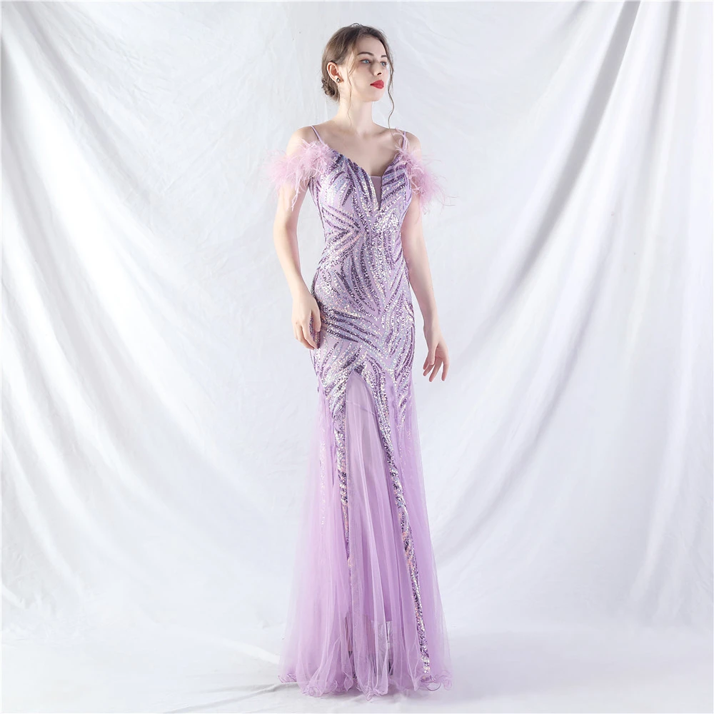 Crafted Ostrich Feather Stacked Sequins Splicing Mesh Gauze High-End Evening Dress Clothes