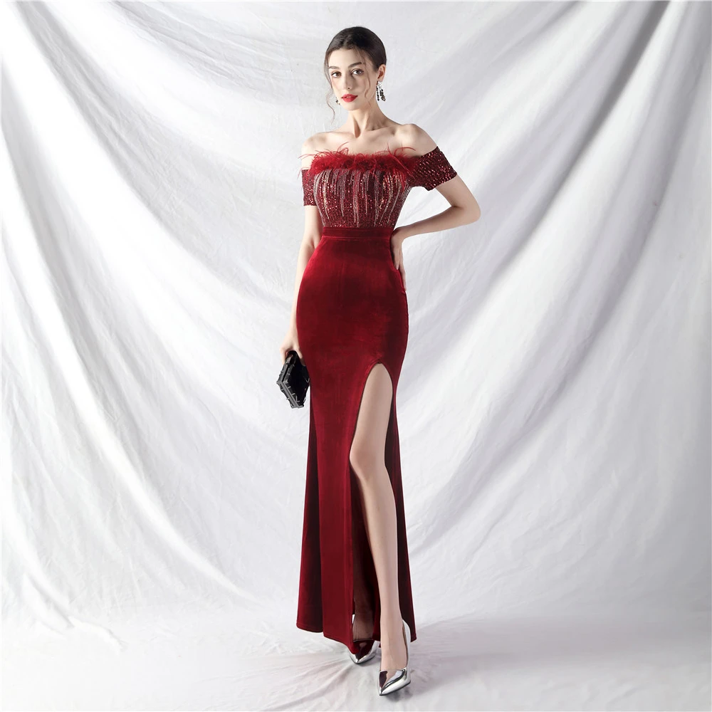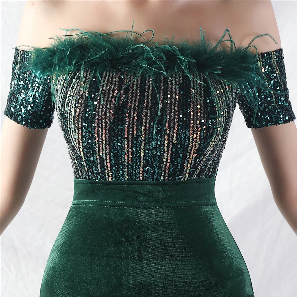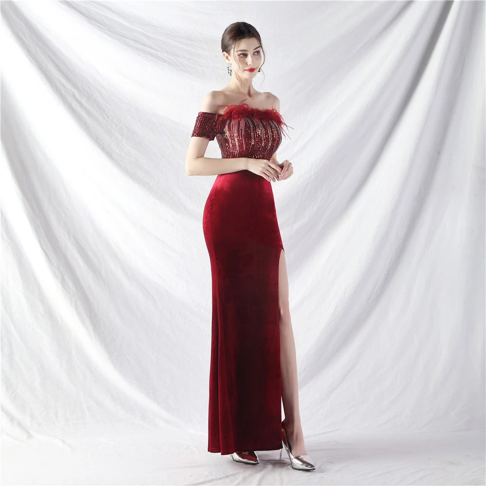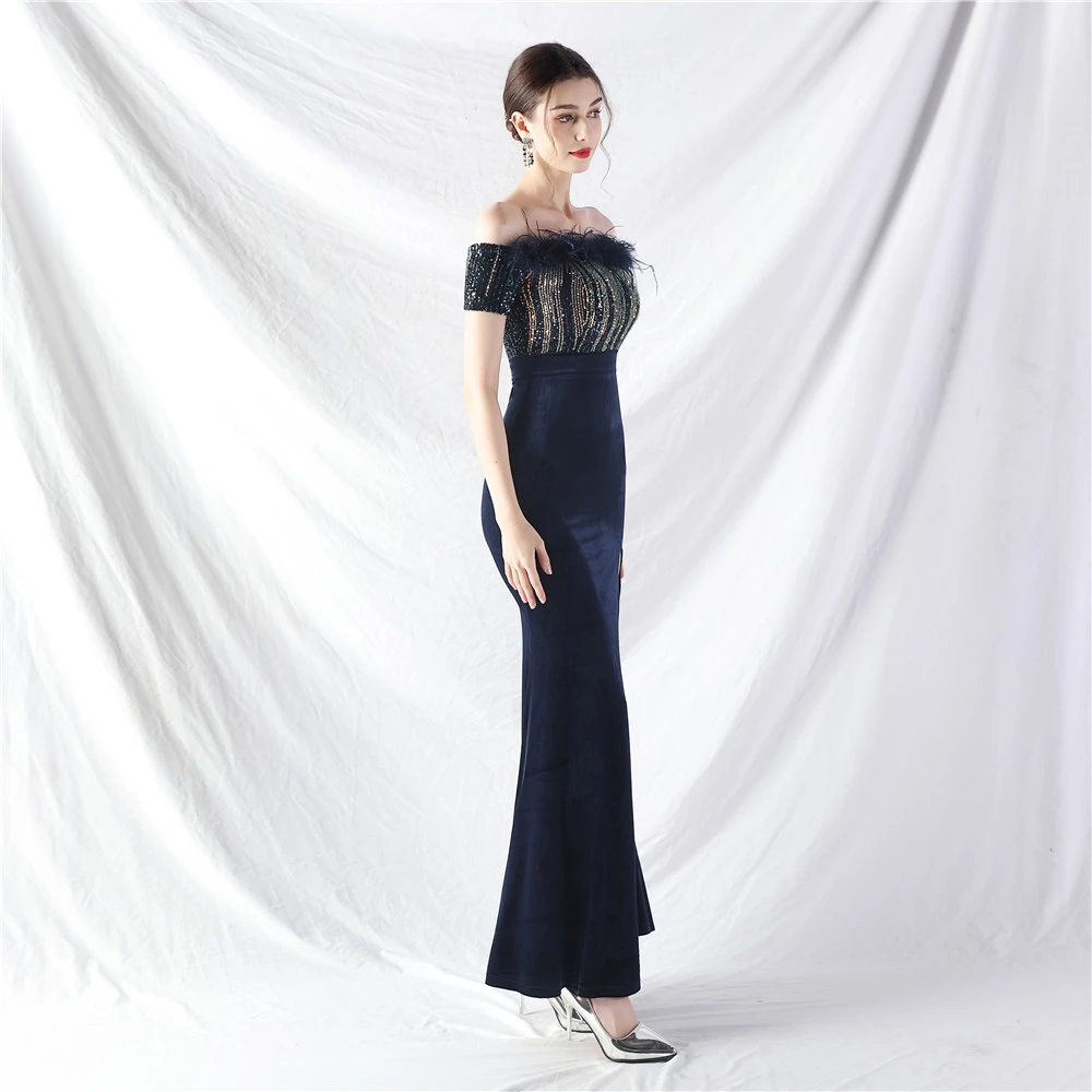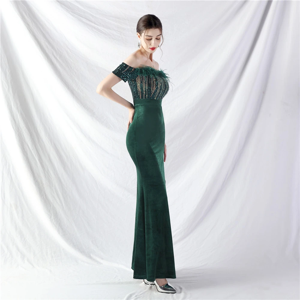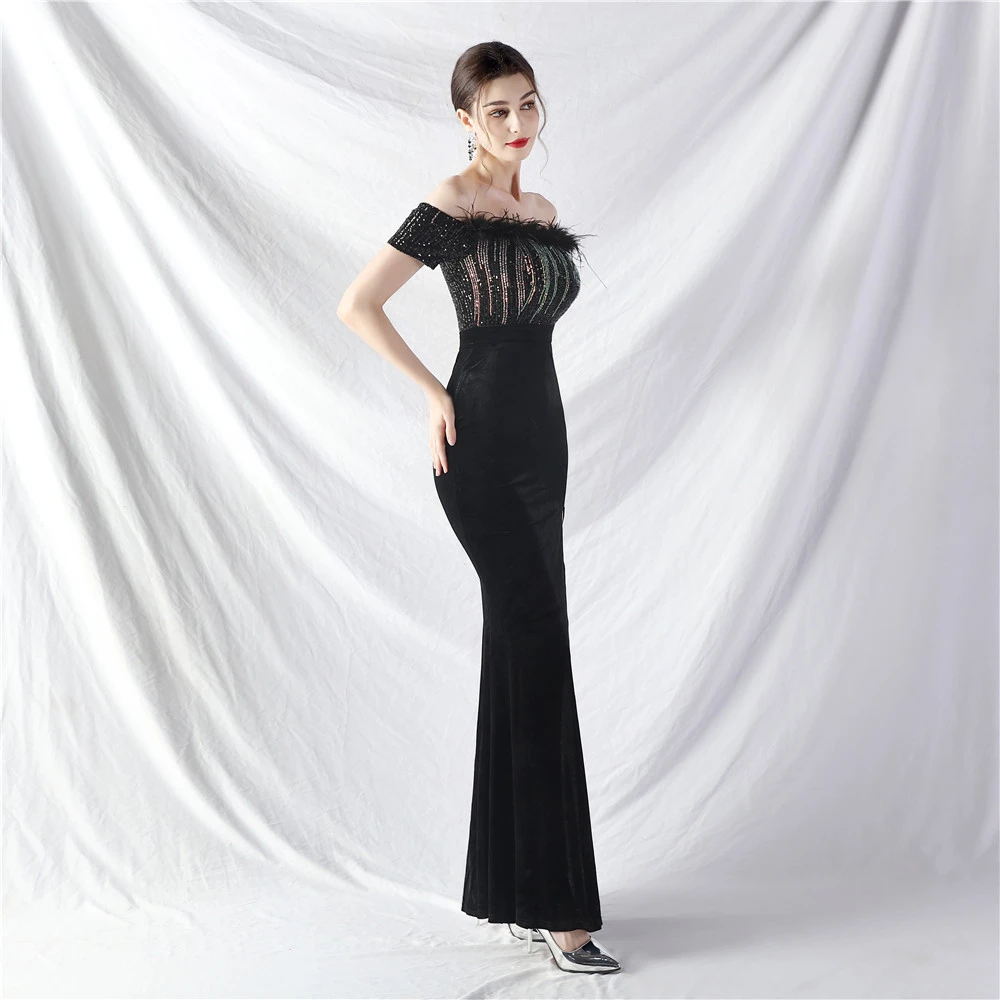 Crafted Ostrich Feather Velvet One-Shoulder Evening Dress