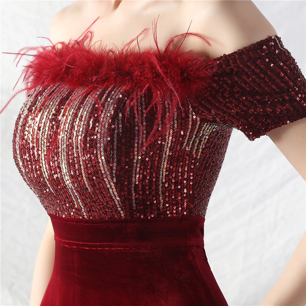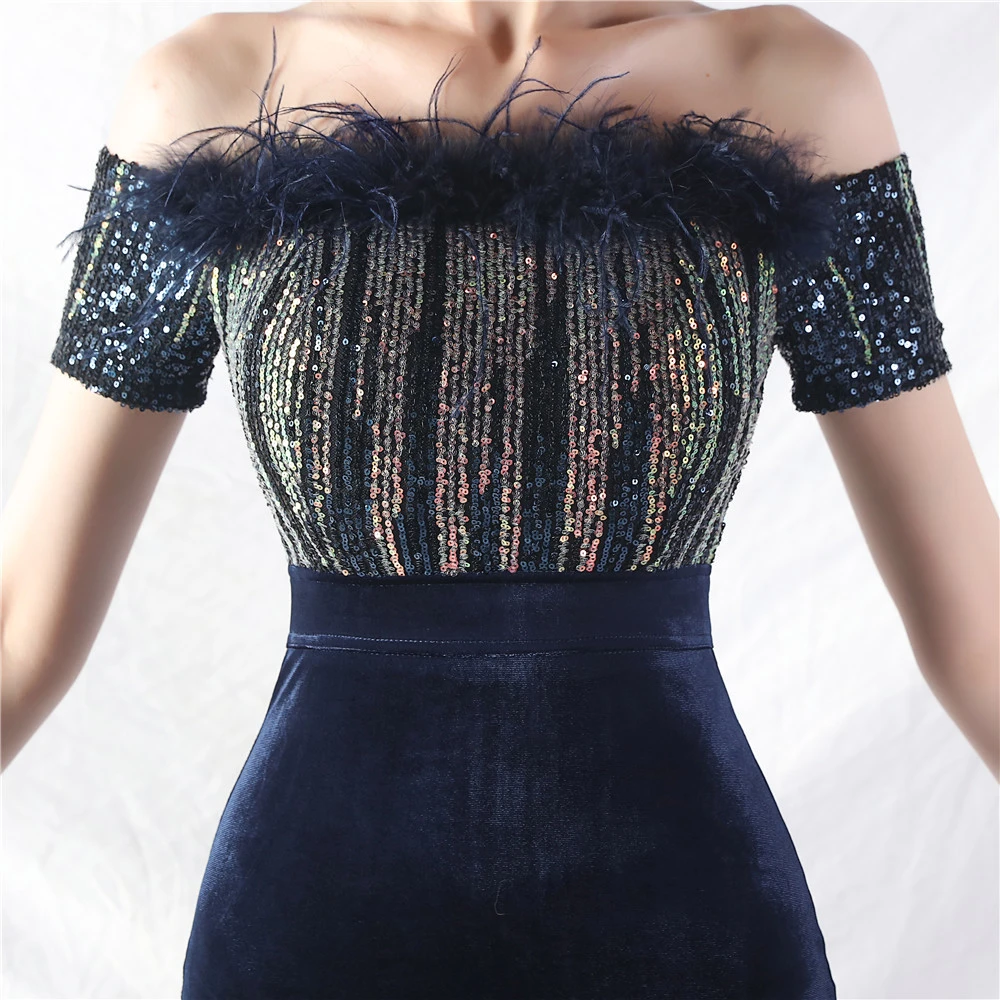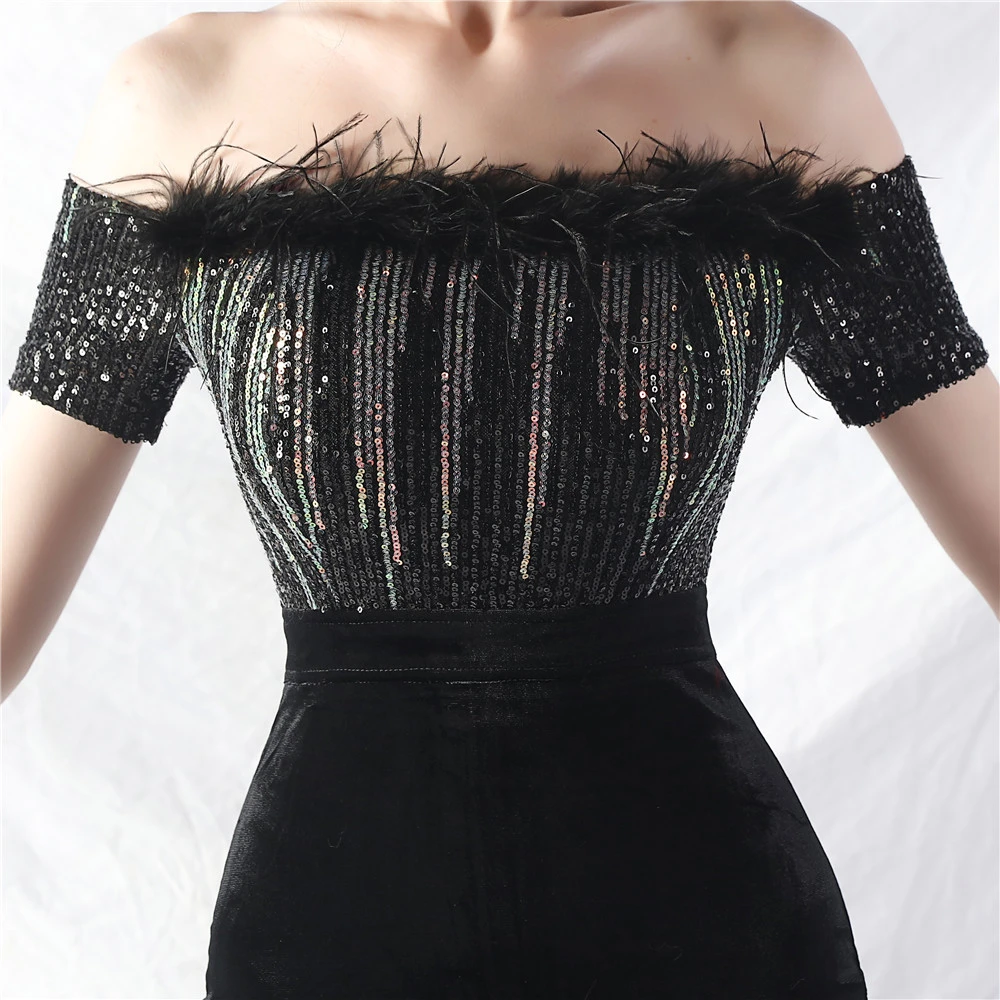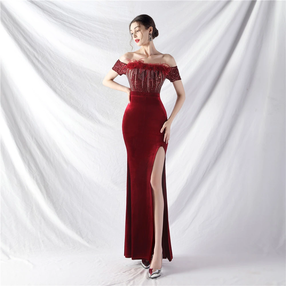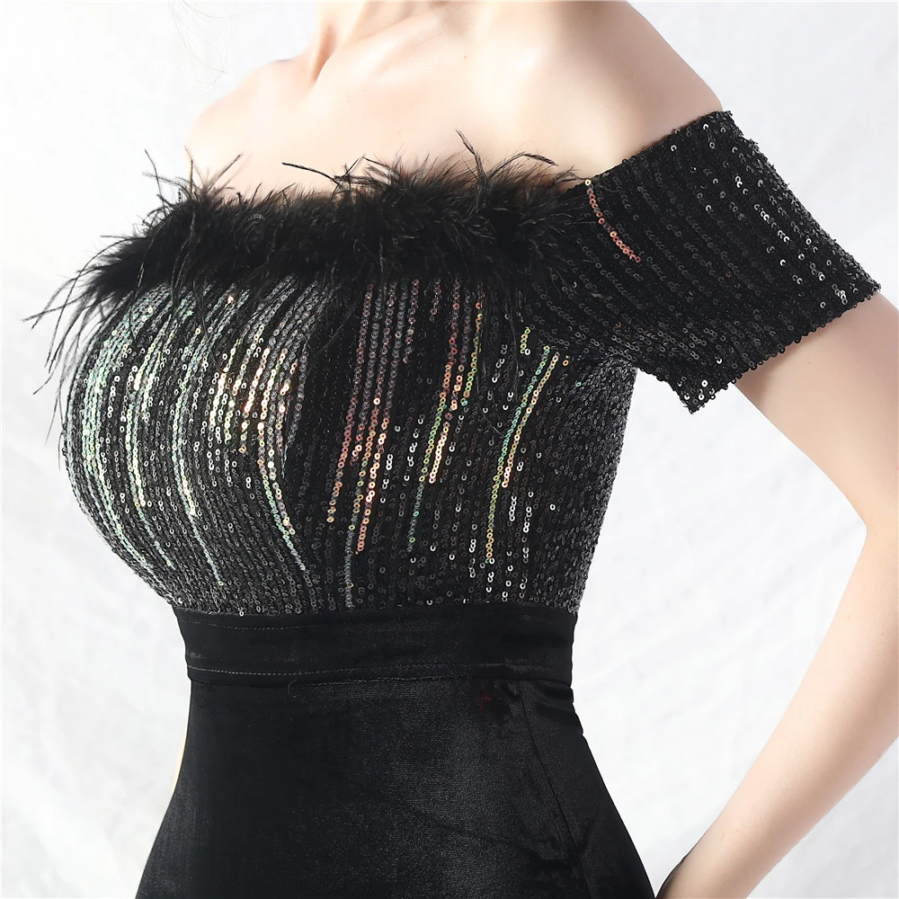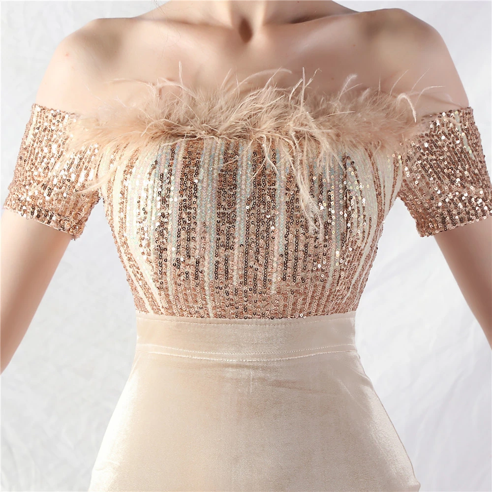 Crafted Ostrich Feather Velvet One-Shoulder Evening Dress