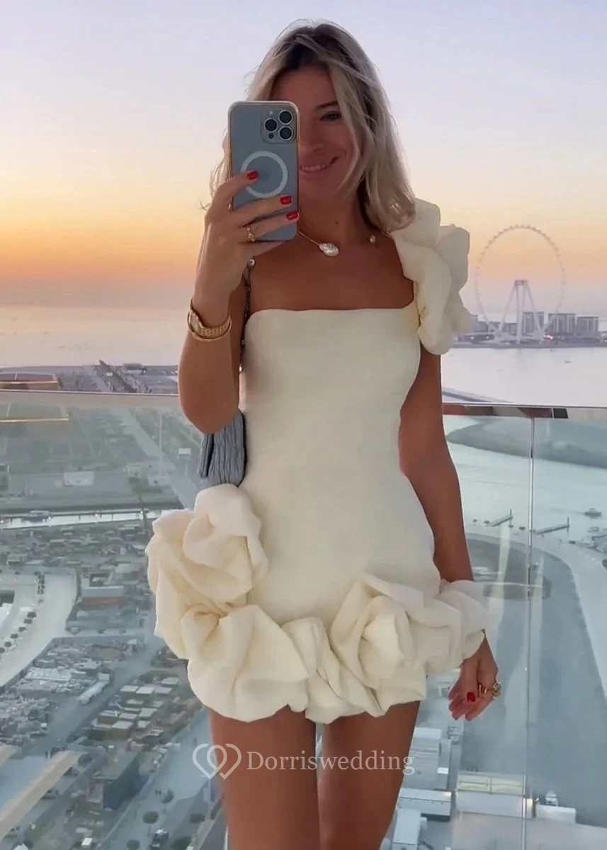 This elegant cream one-shoulder dress features flounced details at the shoulder and skirt, creating a sweet and playful look. Perfect for outdoor events, parties, or romantic occasions, it offers a comfortable fit with its lightweight fabric. The design is ideal for summer gatherings or special celebrations, embodying a blend of elegance and fun.