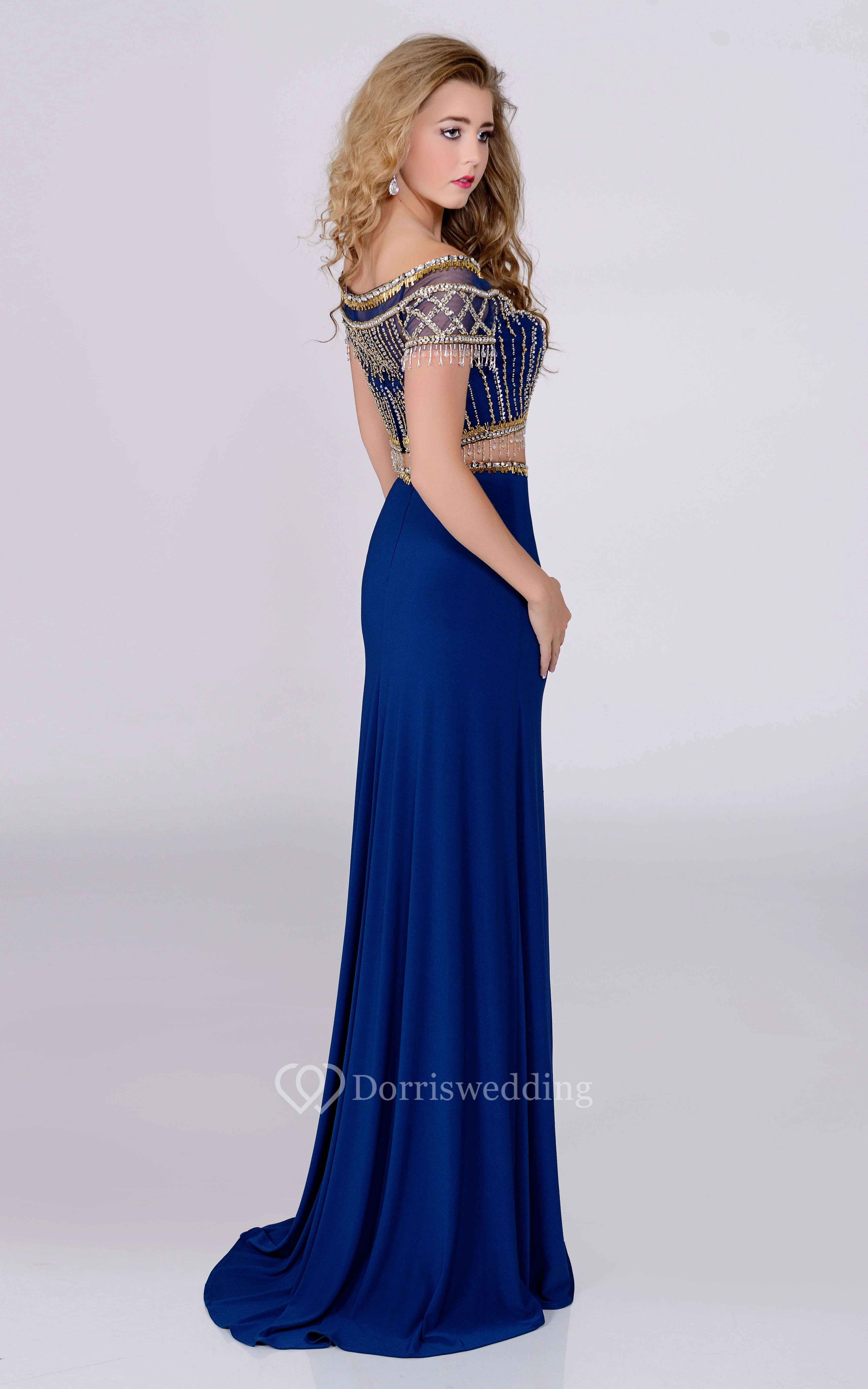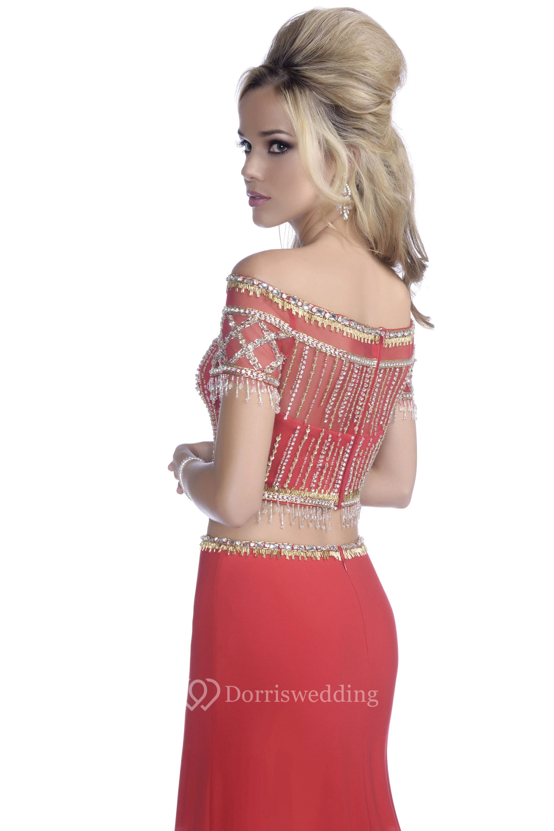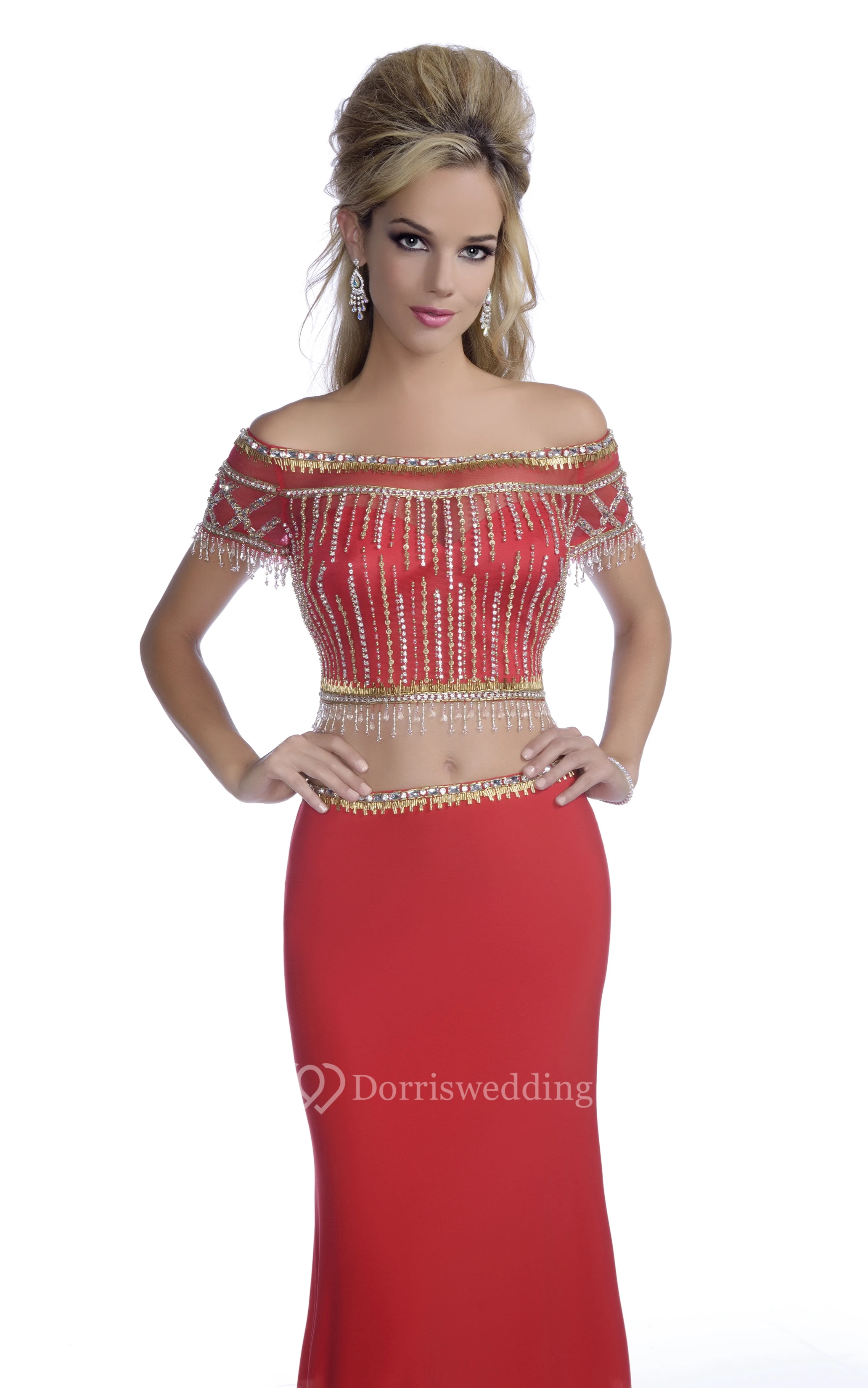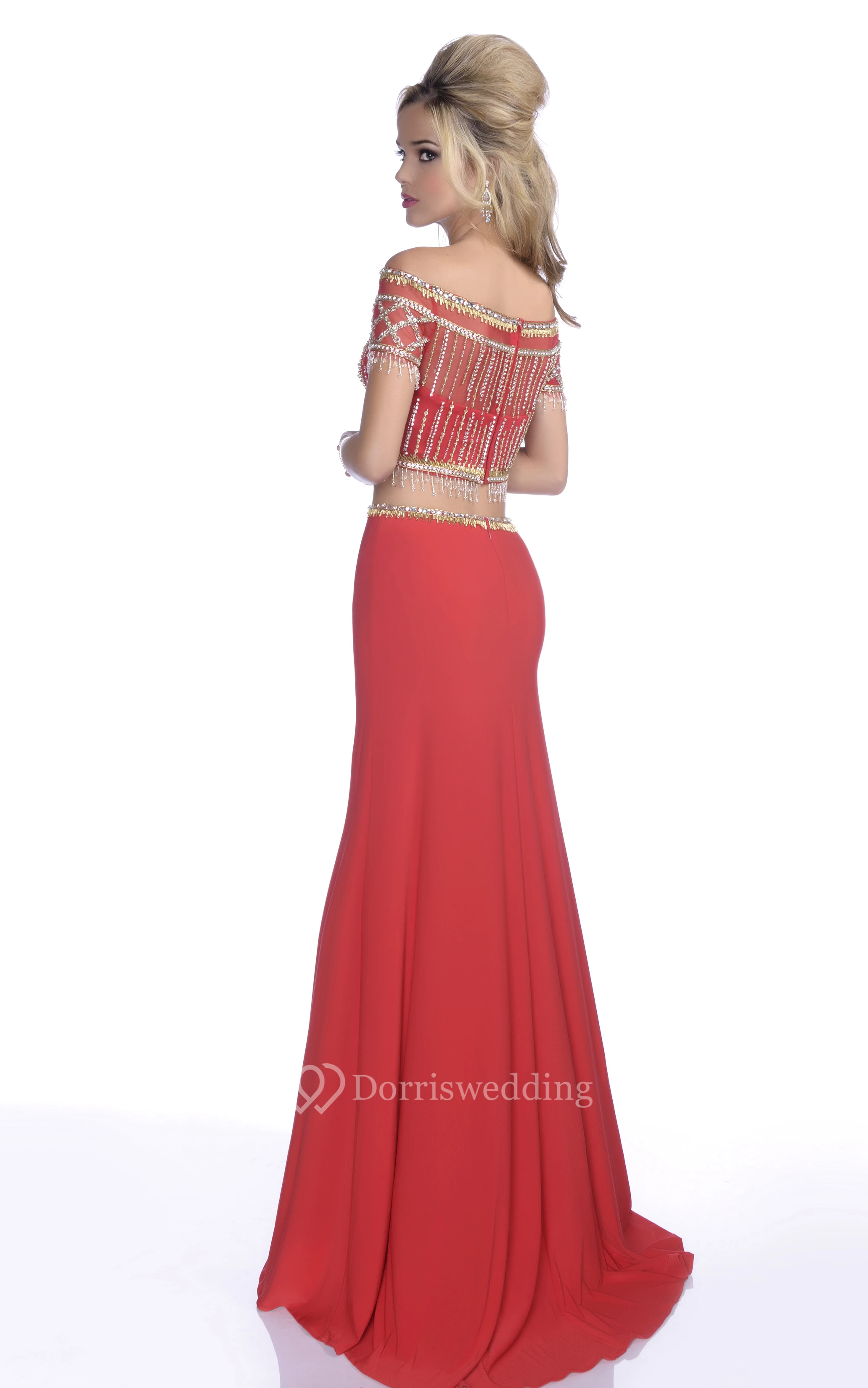 Crop Top Off-The-Shoulder Column Prom Dress With Crystal Jeweled Appliques