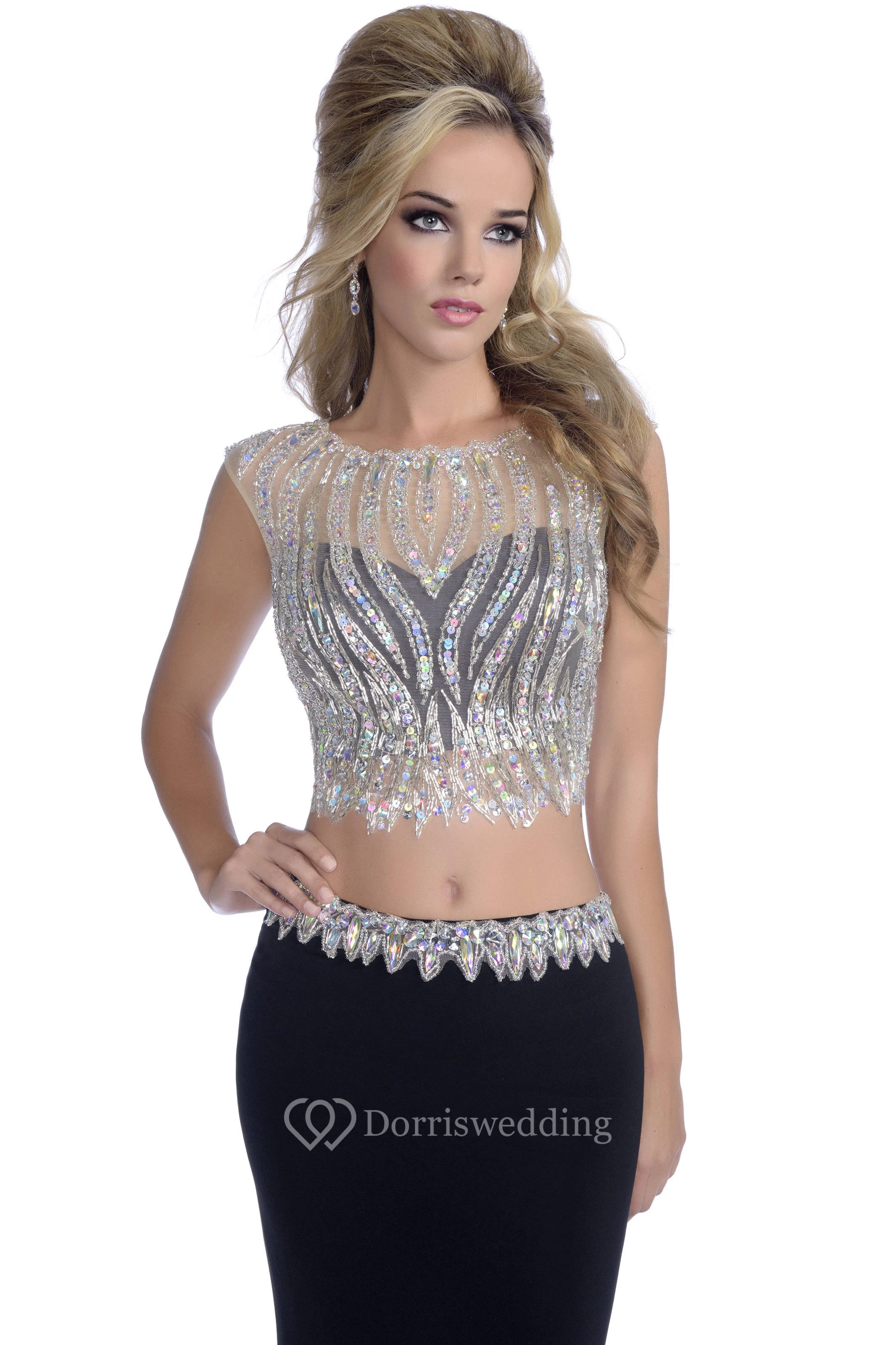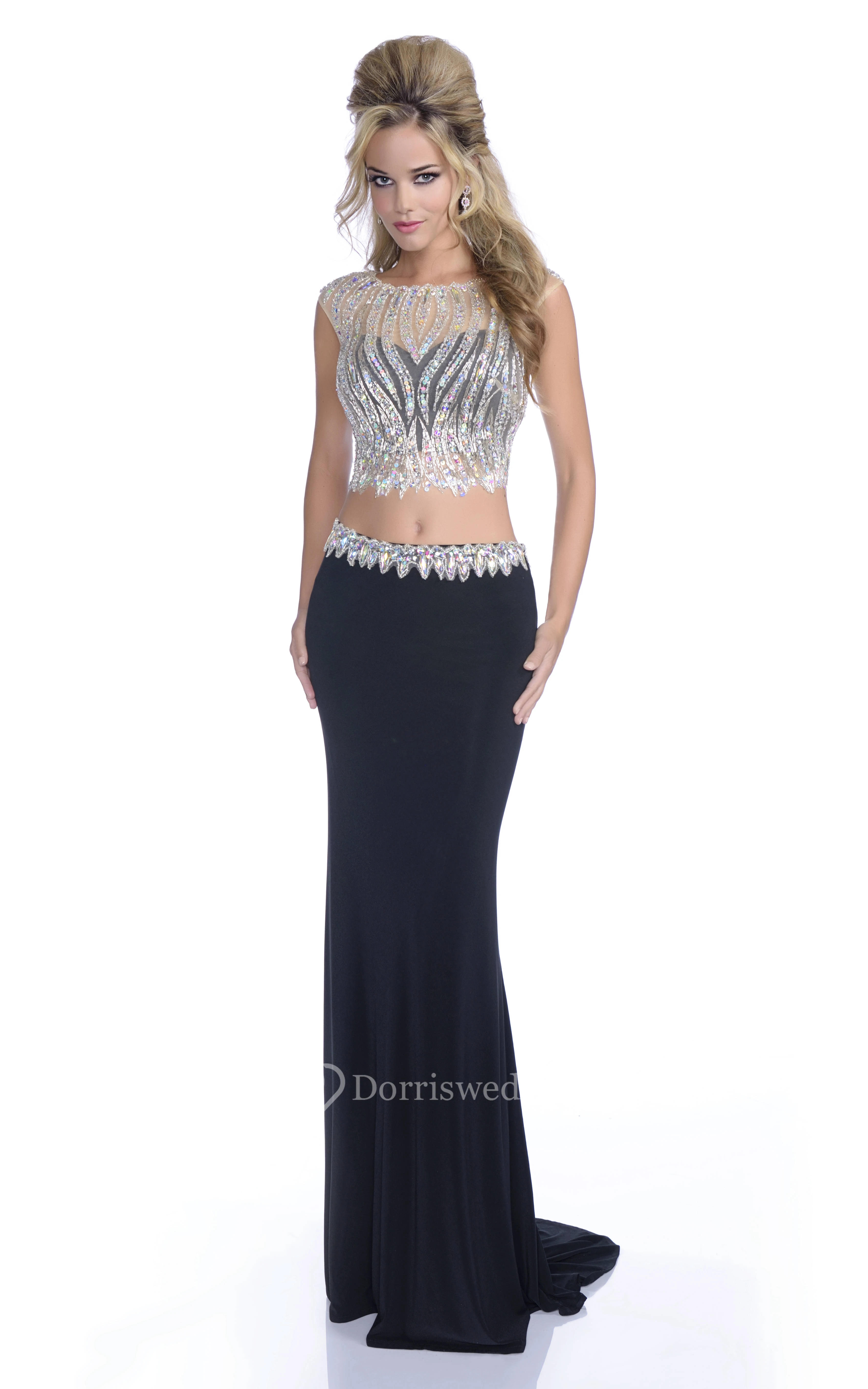 Crop Top Sheath Jersey Scalloped-Edge Neck Prom Dress With Shining Bodice