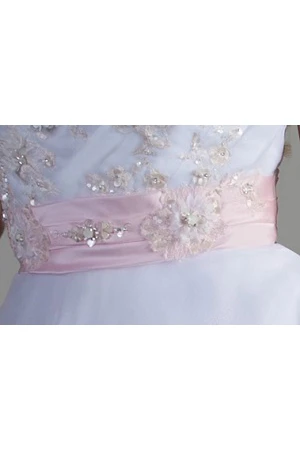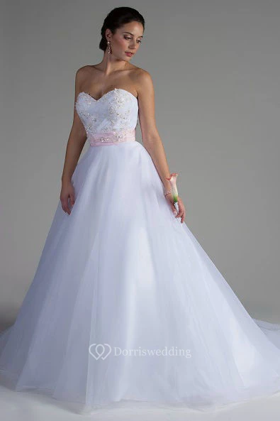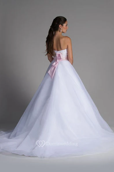 Crystal Applique Bodice Tulle Bridal Ball Gown With Pink Floral Sash