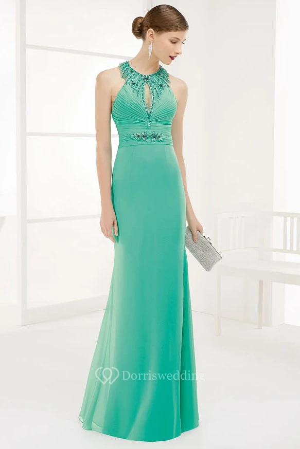Crystal High Neck Front Keyhole Chiffon Long Prom Dress With Back Spaghetti Straps