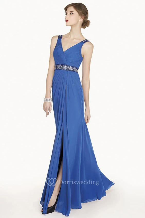 Crystal Waist Chiffon Long Prom Dress With Split And Bootlace Back