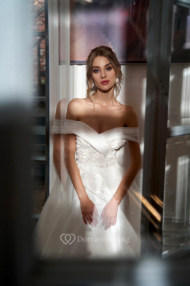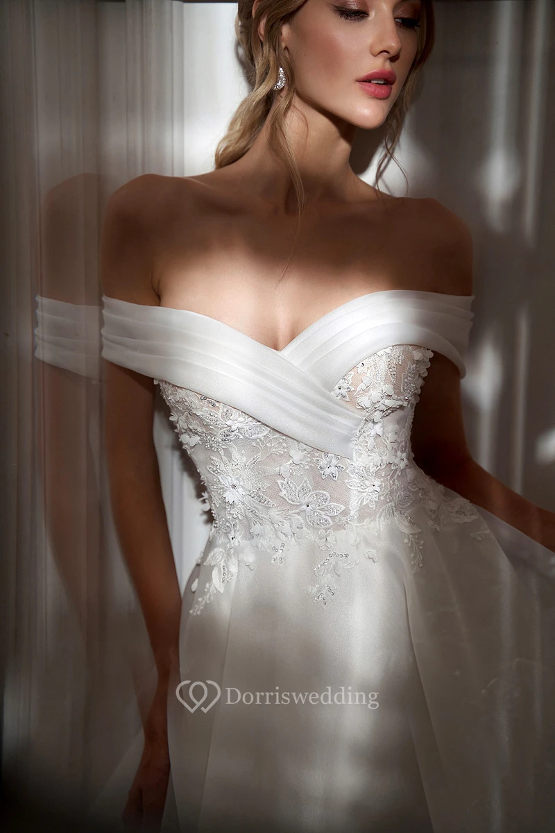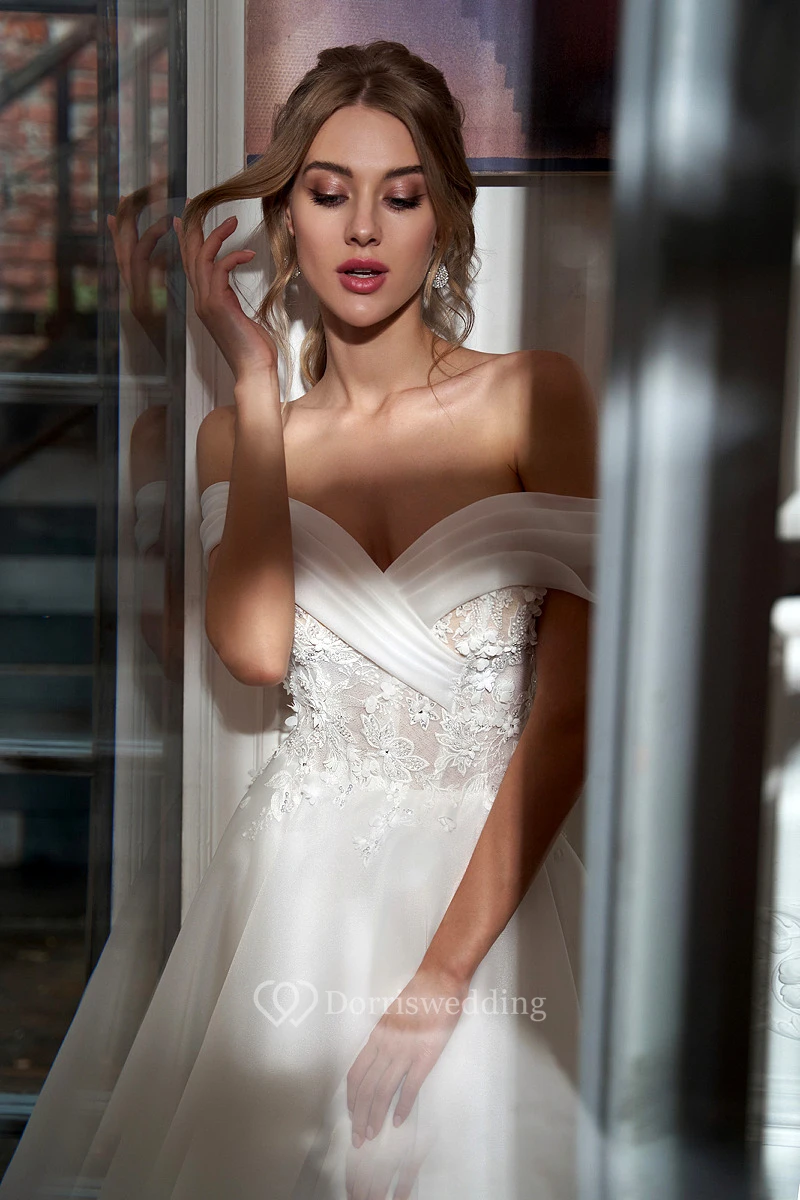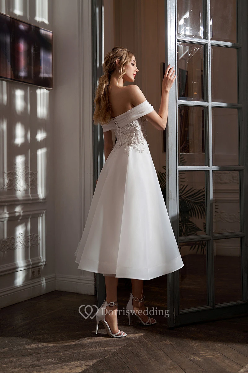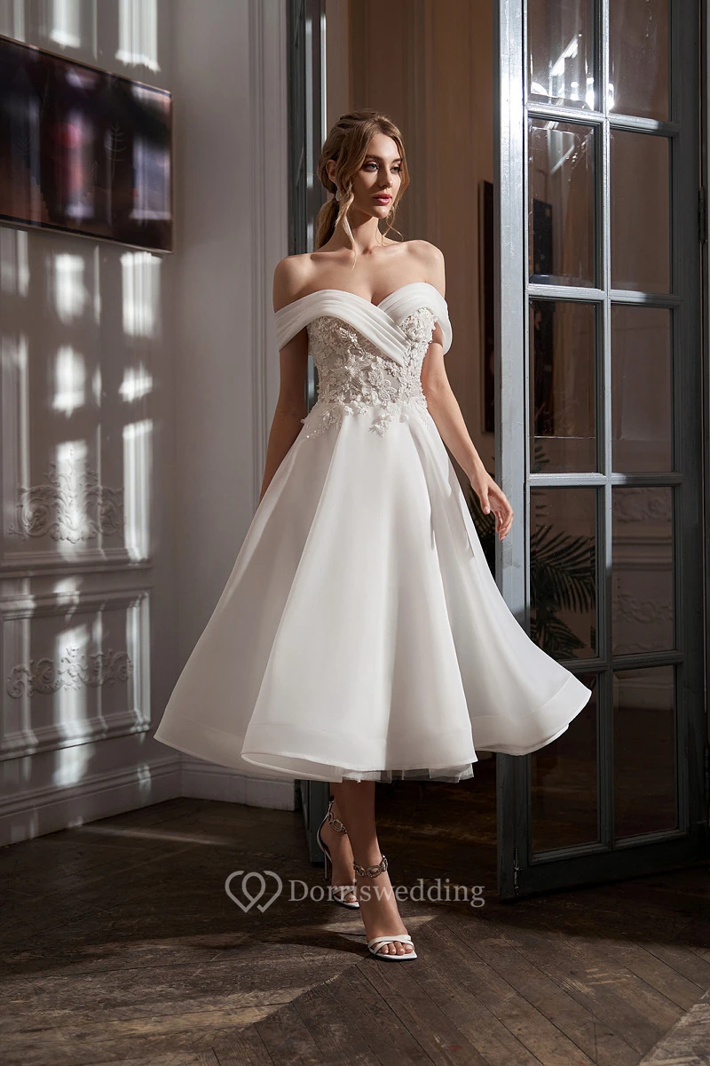 Cute Off-the-shoulder Ruched A-line Tea-length Applique Wedding Dress