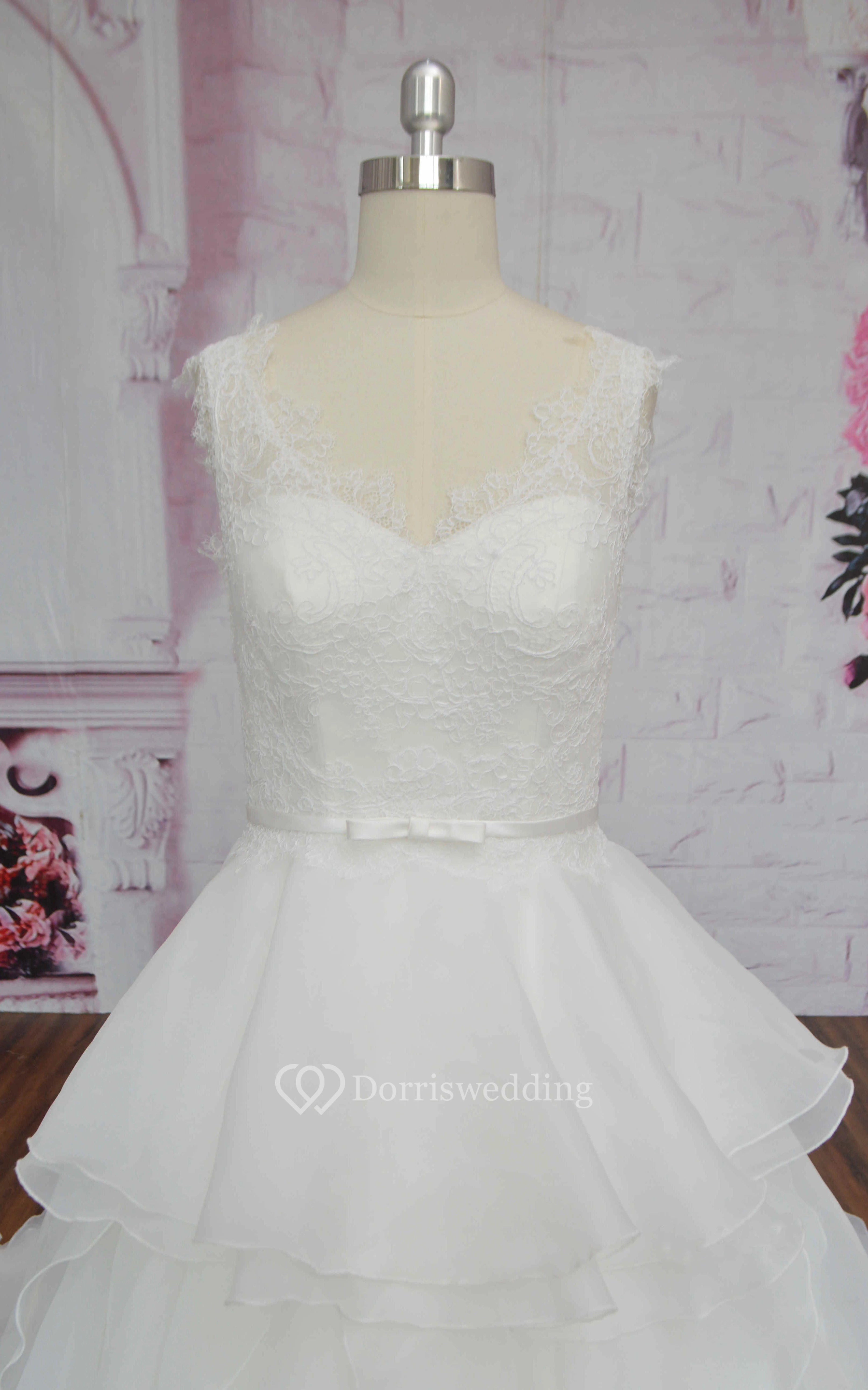 Cute Ruffle Lace Organza Sleeveless Simple Wedding Dress Ballgown With Bow And V-back