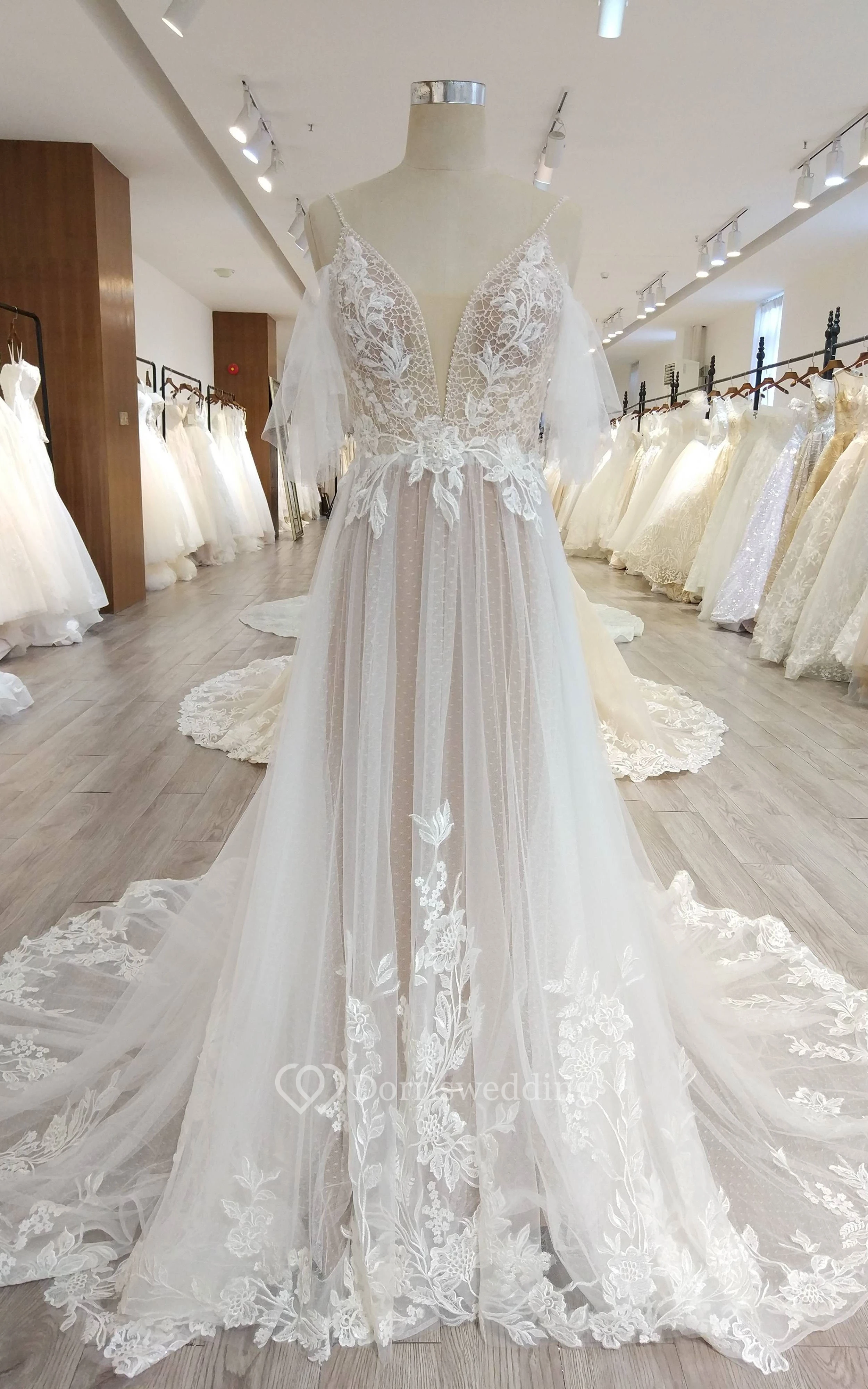 Cute Spaghetti Plunged Empire Ethereal Tulle Applique Lace Wedding Dress