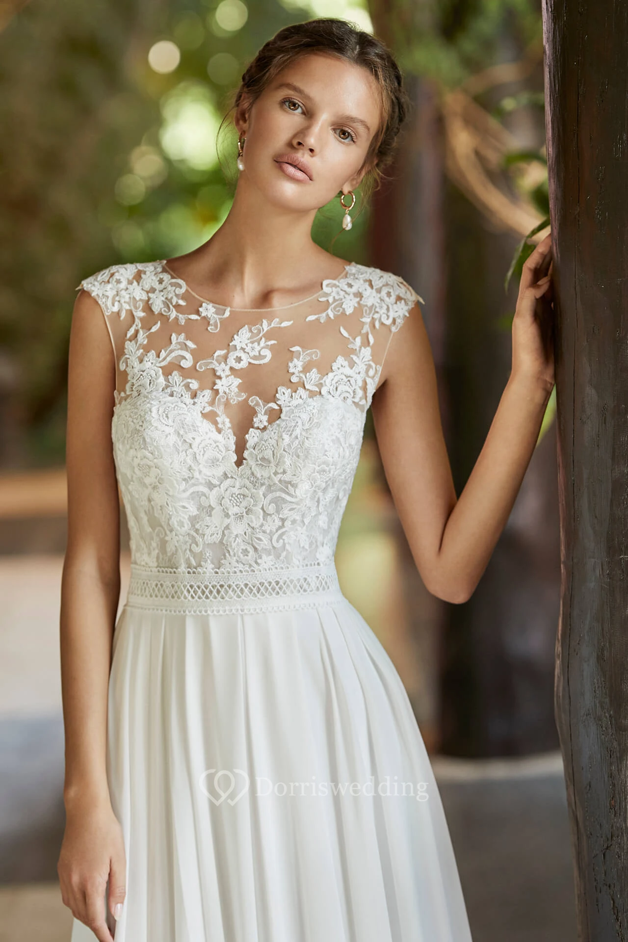 Deep V-back Ethereal Cap Sleeve And Court Train Lace Chiffon Simple Wedding Dress