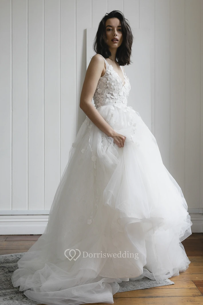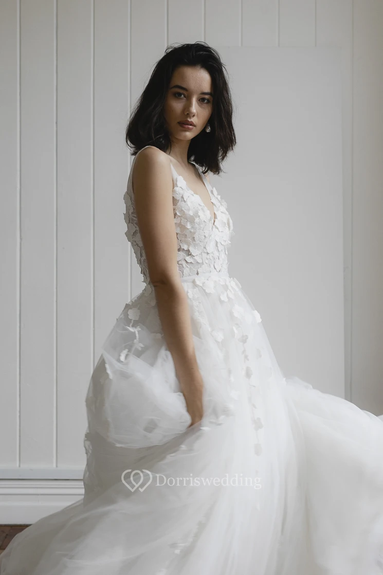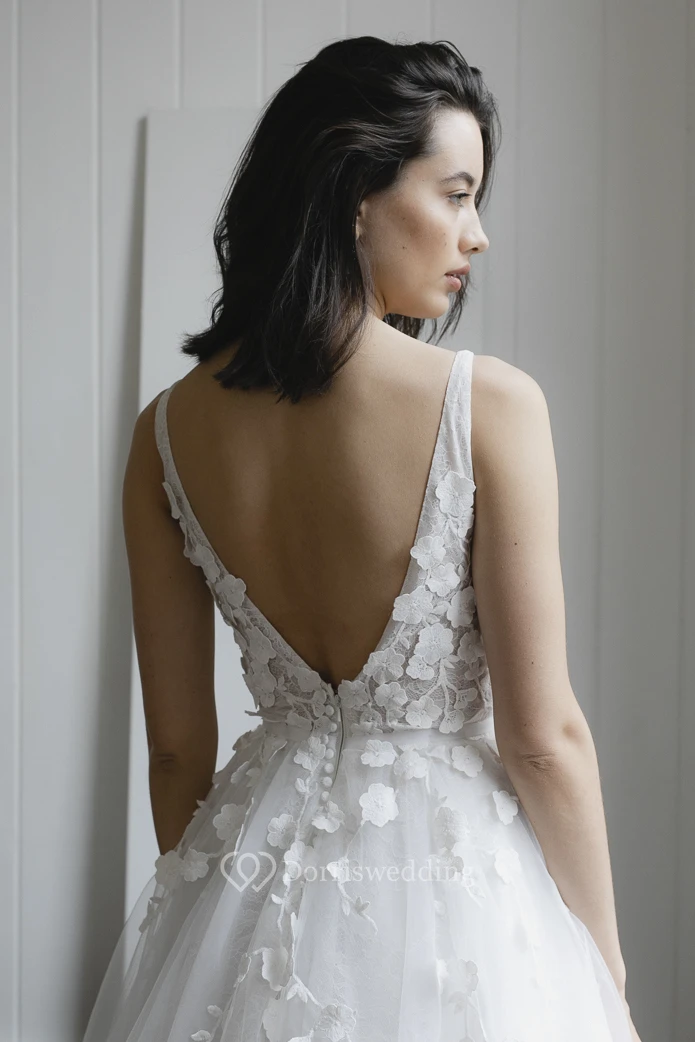 Deep V-back Romantic Plunging V-neck Sleeveless Lace Appliqued Boho Wedding Dress With Tulle Skirt