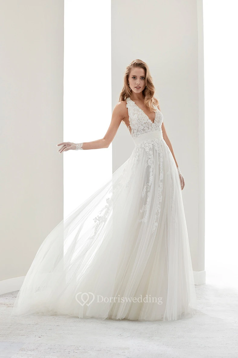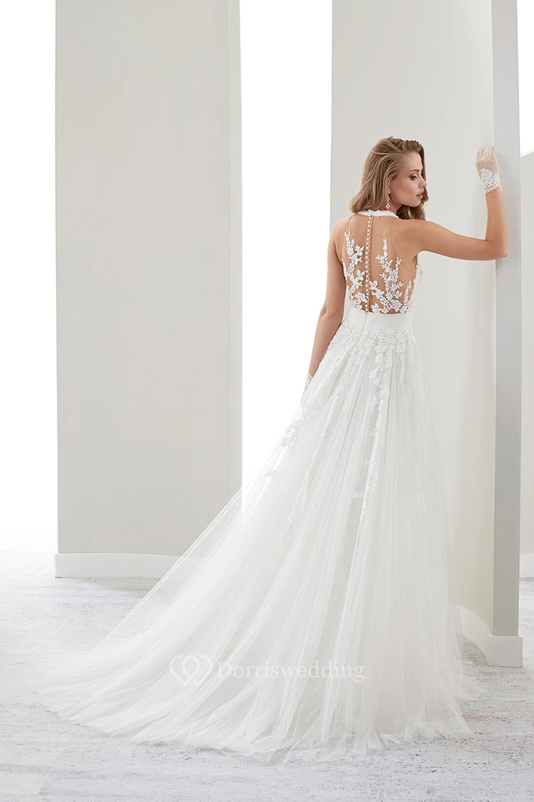 Deep-V Lace Draping Gown With Halter Strap And Illusive Lace Back