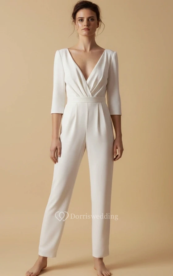 Deep V Neck 3/4 Sleeve Cinched Waist Straight Leg Wedding Jumpsuit