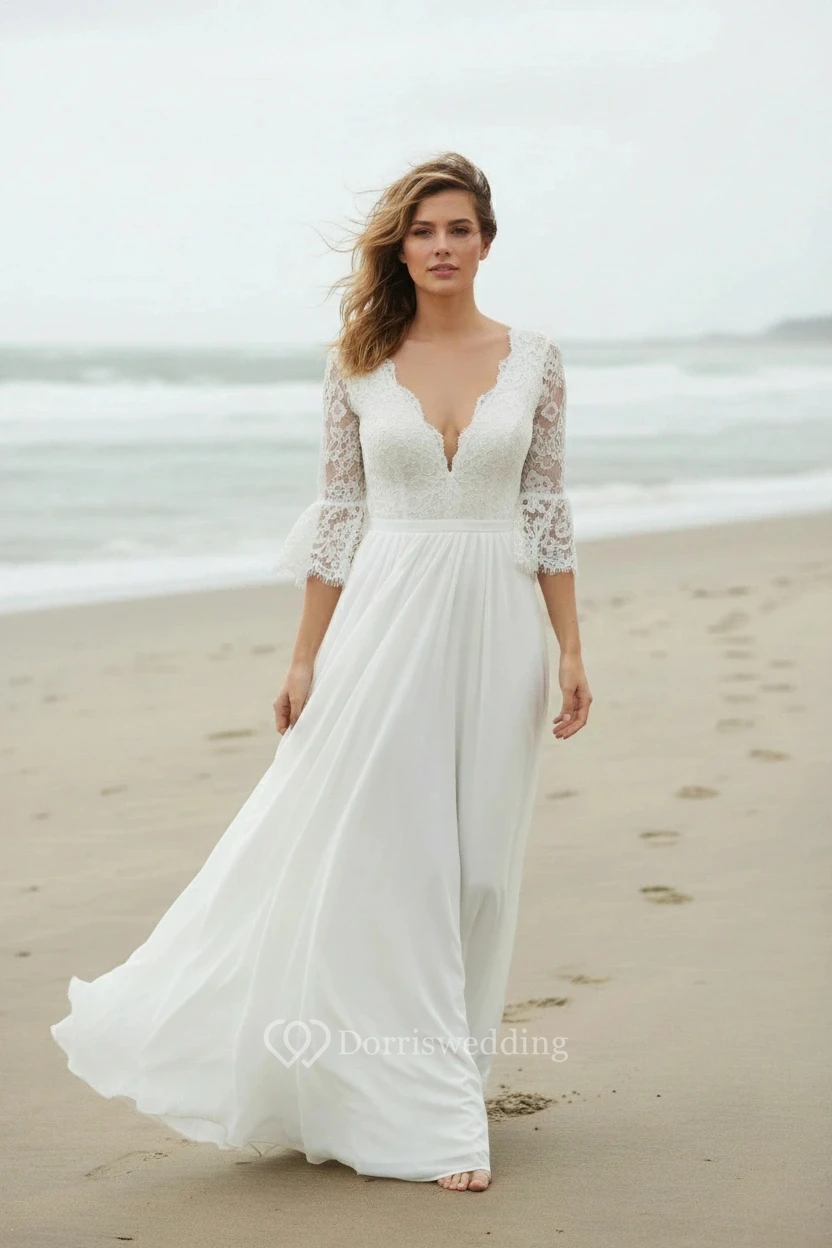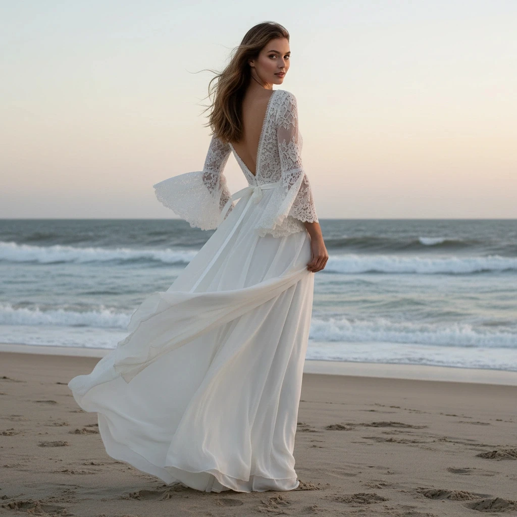 This romantic beach wedding dress boasts a deep V-neck, bell sleeves, and a lace bodice that flows into a lightweight chiffon skirt. Set against an ocean backdrop with waves and overcast skies, it offers a serene and dreamy vibe. Ideal for a seaside ceremony, it moves gracefully with the wind for a natural, effortless look.