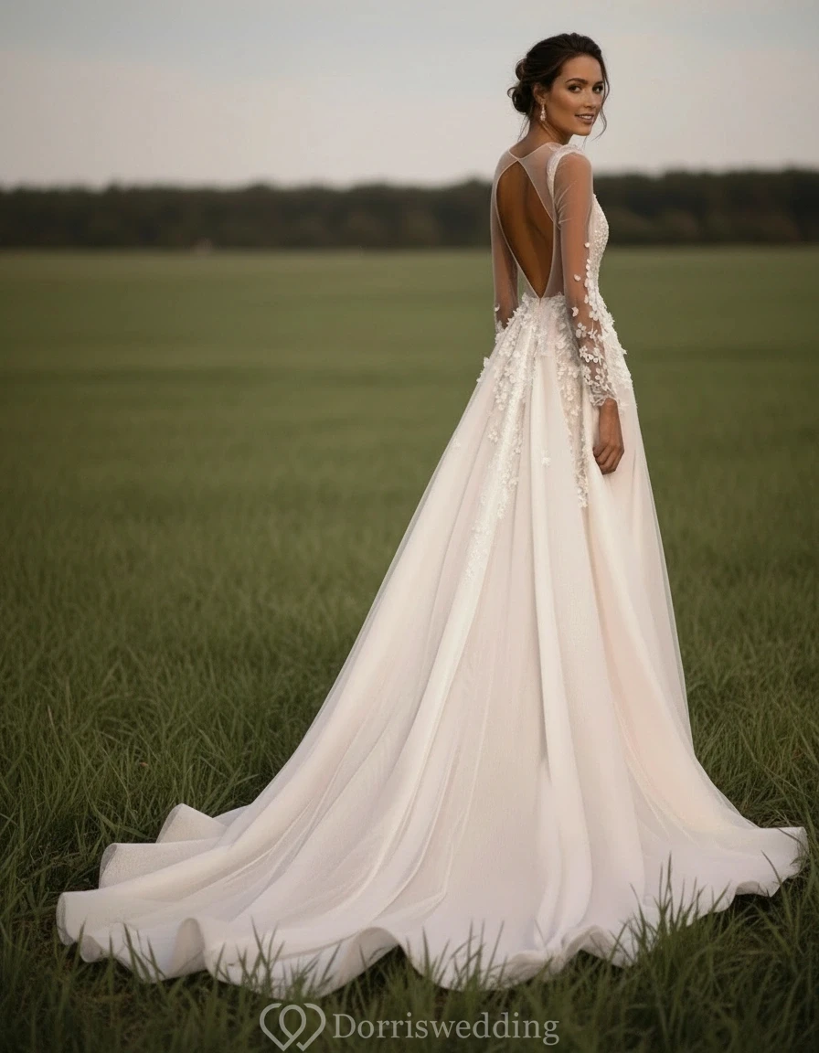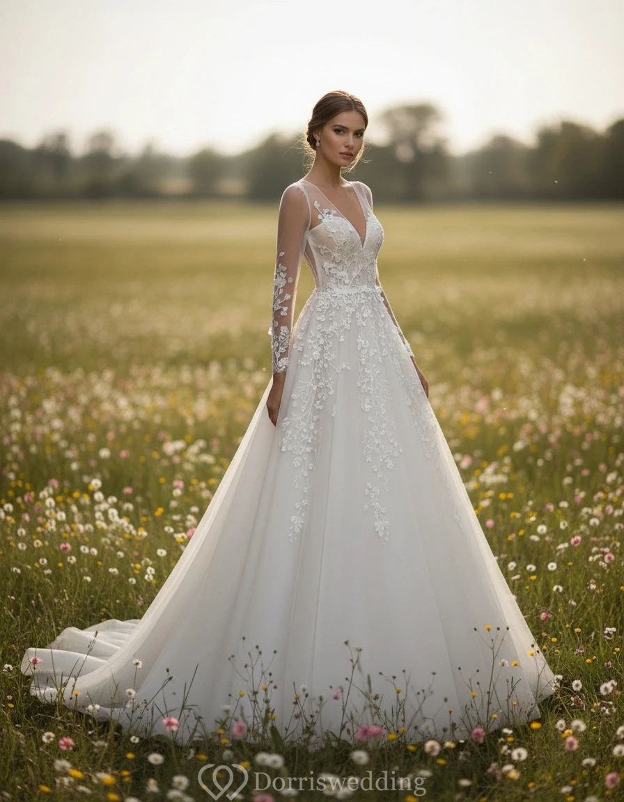This romantic wedding dress features a deep V-neckline, long lace sleeves, and a skirt flowing into a field of colorful flowers. The delicate lace and natural setting create an elegant and whimsical atmosphere, perfect for a garden or country-style wedding celebration.
