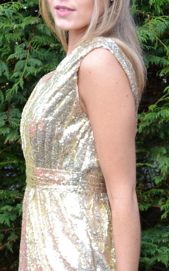 Deep V Neck Sleeveless Allover Sequined Knee Length Sheath Dress With V Back