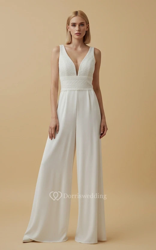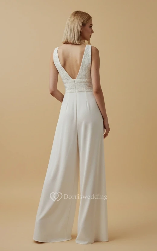 Deep V Neck Sleeveless Lace Wedding Jumpsuit