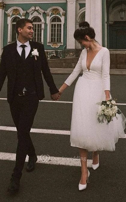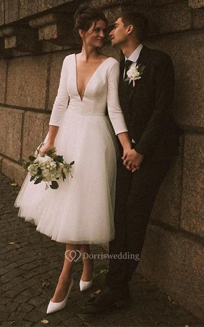 This dress features a plunging neckline with a delicate sheer tulle insert for a touch of modern elegance.