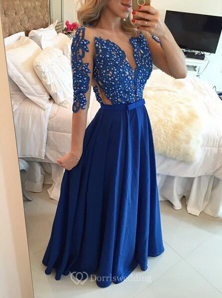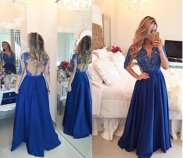 Delicate Chffion Royal Blue Prom Dress Lace Appliques Half Sleeve