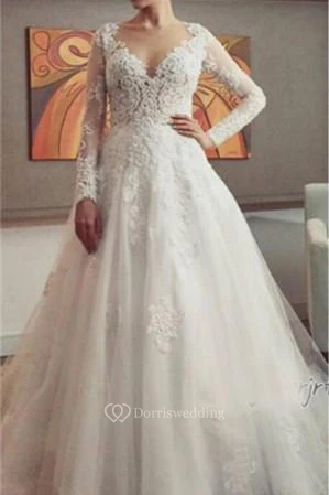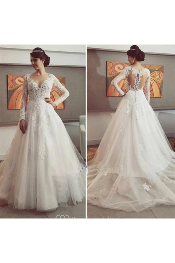 Delicate Lace Appliques Tulle Wedding Dress Button Zipper Back Long Sleeve