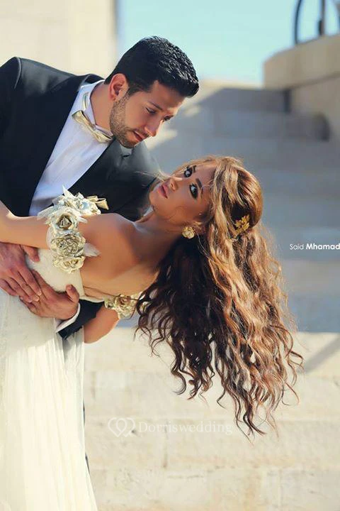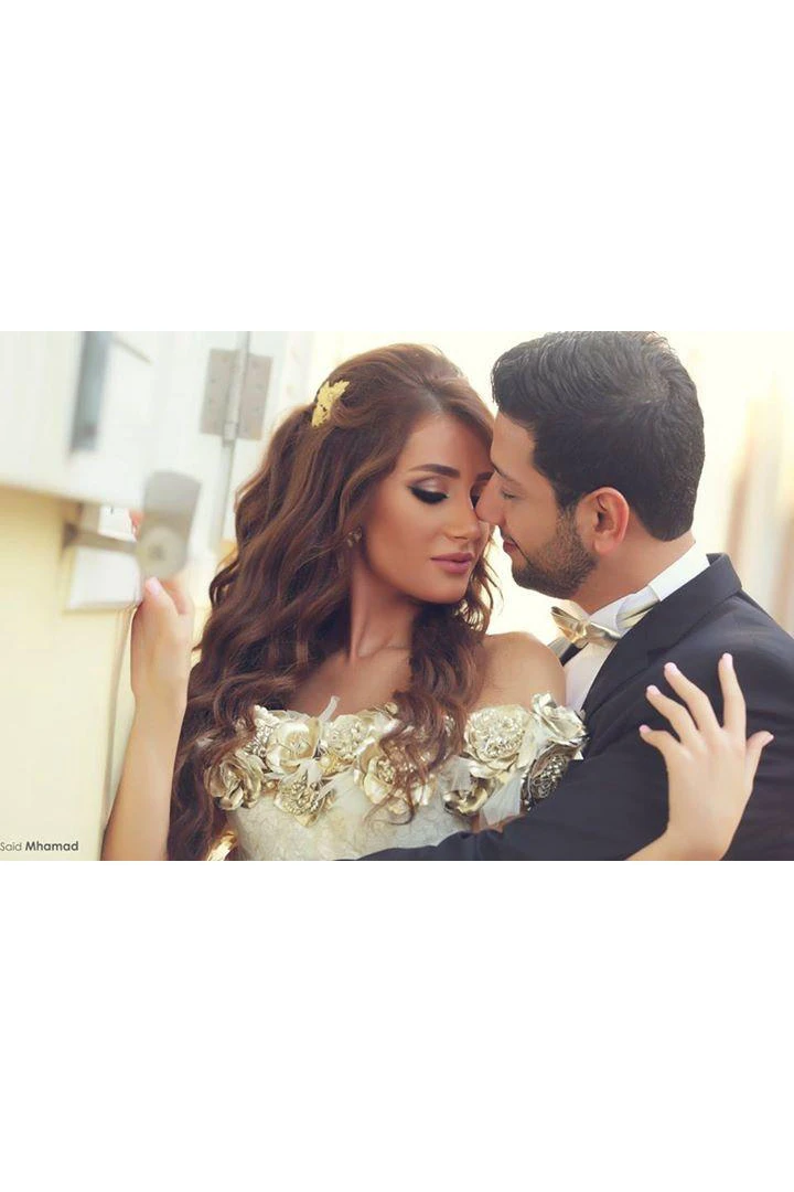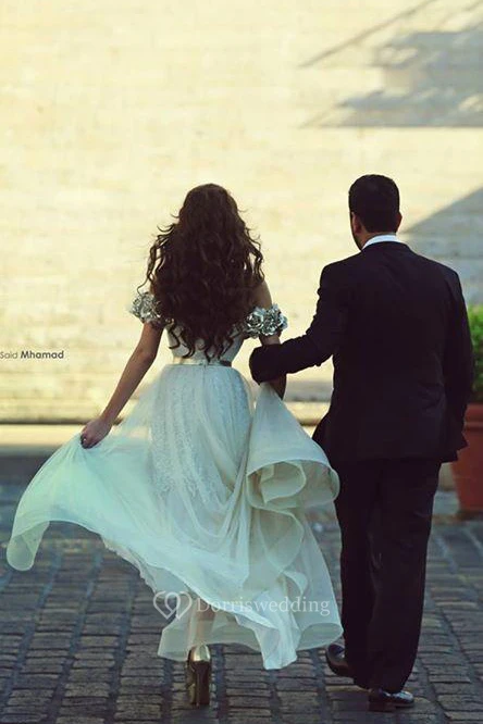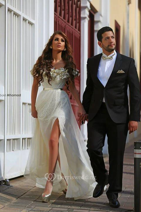 Delicate Off-the-shoulder Chiffon Flowers Wedding Dress Front Split