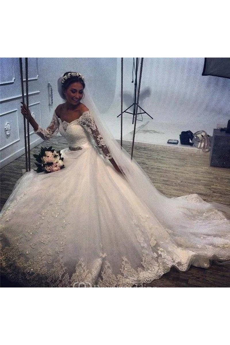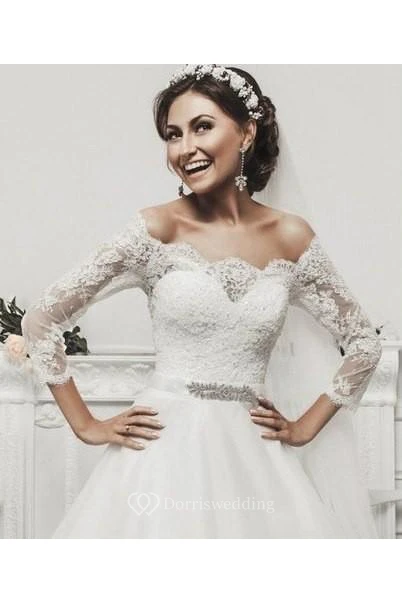 Delicate Tulle Lace Appliques Wedding Dress 3-4-Length Sleeve Beadings