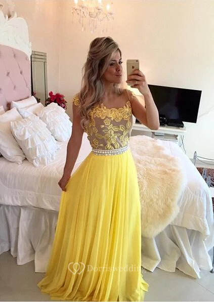 Delicate Yellow Chiffon Pearls Prom Dress Lace Appliques