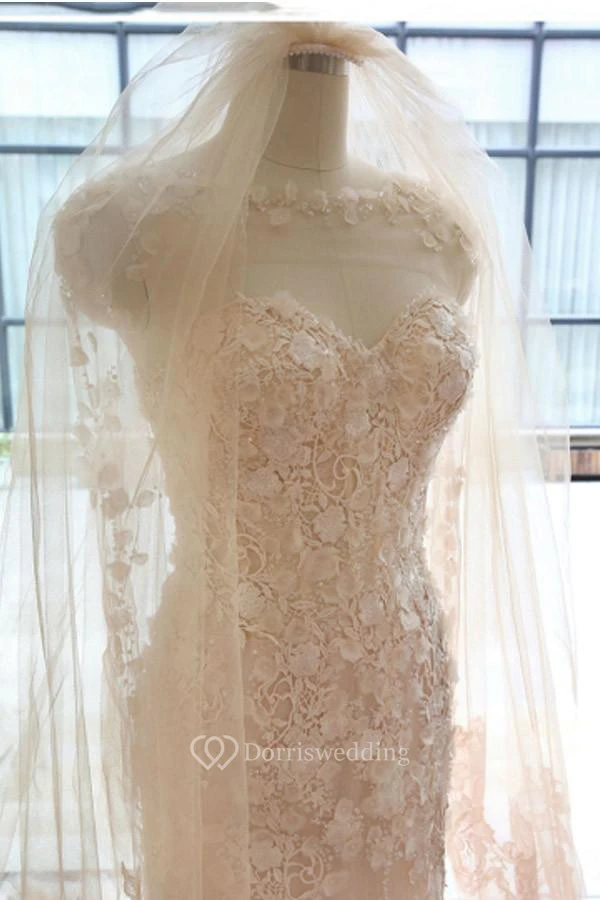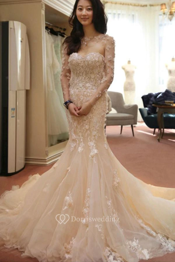Designer Open Back Sheer Flowers Long Sleeve Mermaid Lace Wedding Dress