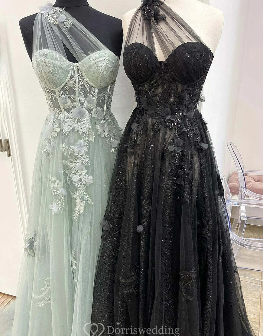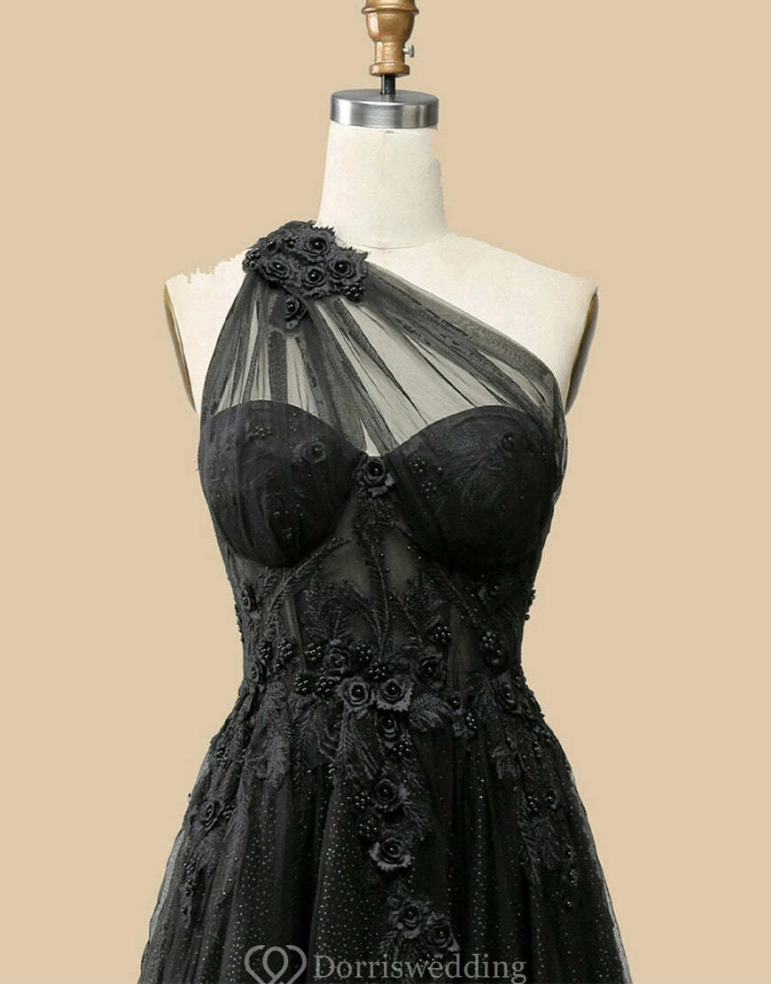 Embrace dark allure in this black sweetheart gown with glitter tulle layers and a bold thigh-high slit. Intricate floral appliqués and a structured bodice bring sophistication, perfect for making a statement at proms or black-tie events. ✨ Features: Black Glitter Tulle, Sweetheart Neckline, Thigh-High Slit, Floral Appliqués, Floor-Length Hem.