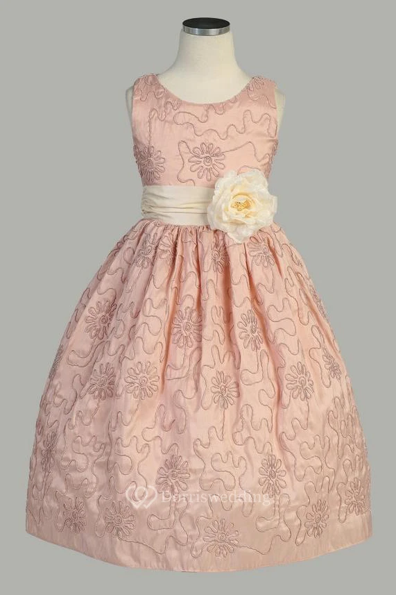 Tea-Length Floral Embroideried Taffeta Flower Girl Dress