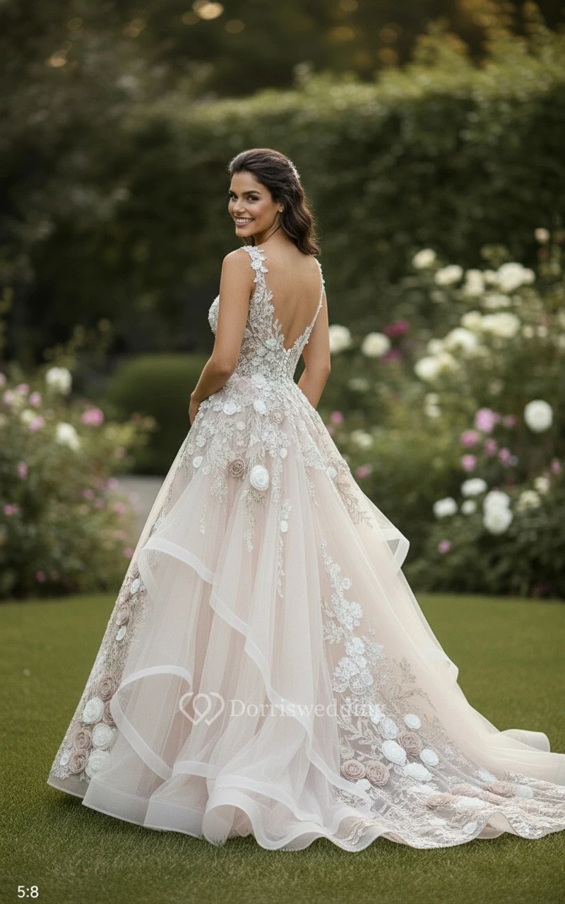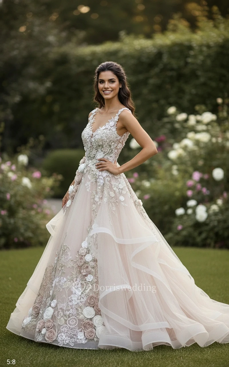 This is the ultimate "wow" dress. I wore it for my reception and everyone couldn't stop talking about the layered skirt. The ruffled tulle gives it so much volume without being heavy or bulky. The lace appliques are perfectly placed to highlight the silhouette.