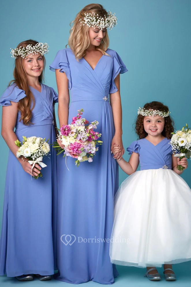 Draped Petal Sleeve V-Neck Chiffon Bridesmaid Dress