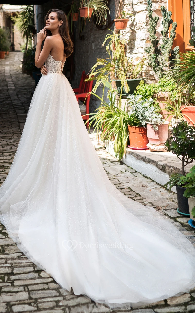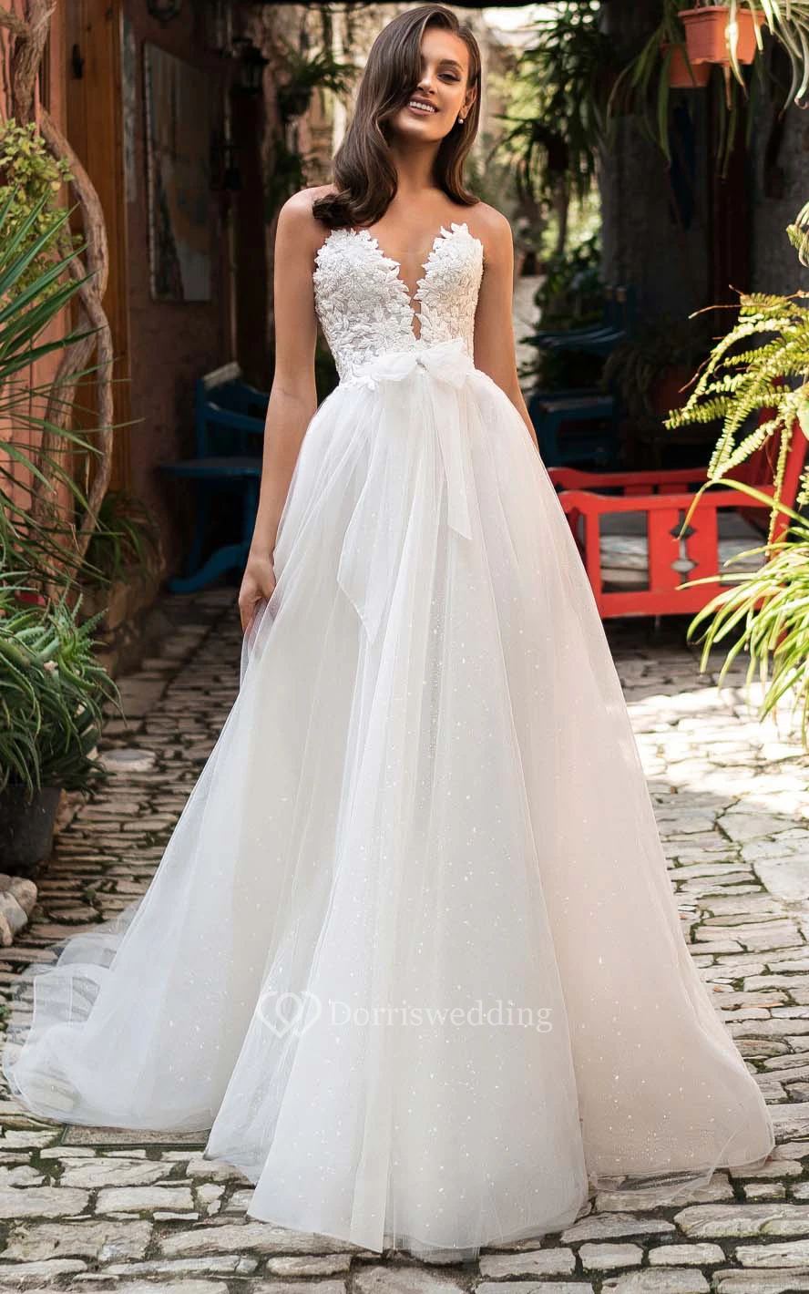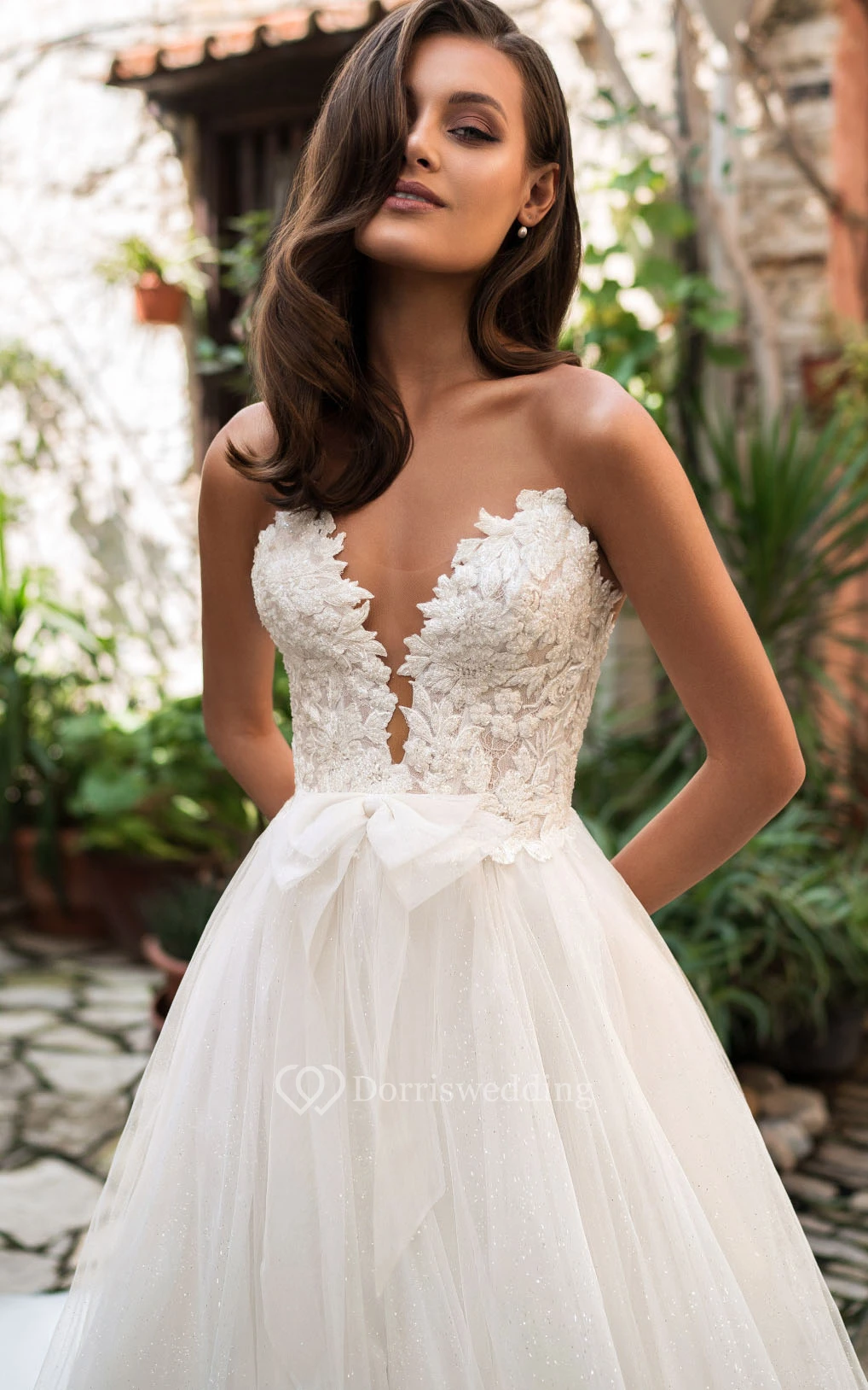 Elegant A Line Ball Gown Sweetheart Lace Tulle Court Train Simple Wedding Dress with Appliques and Bow