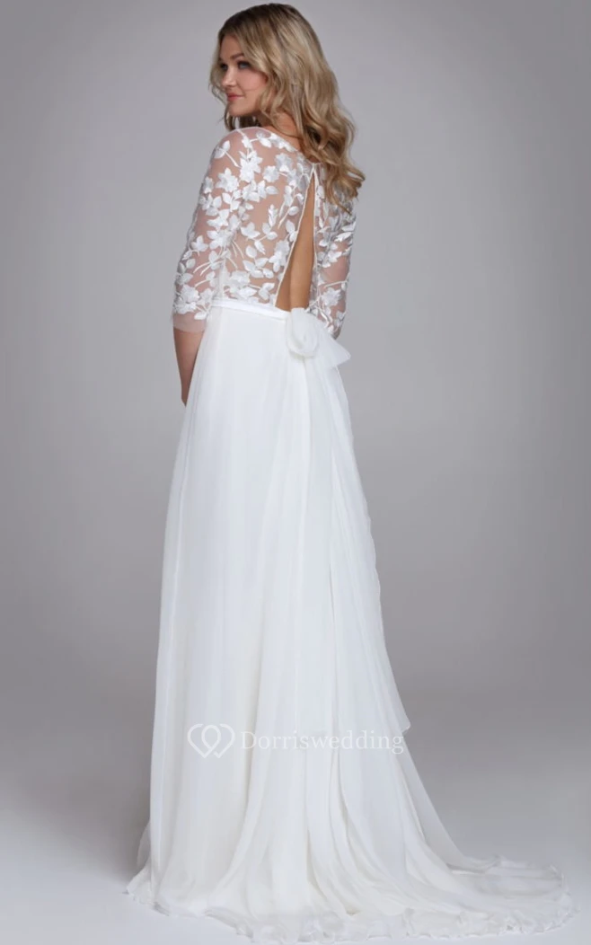 Elegant A Line Bateau Chiffon Brush Train Wedding Dress with Appliques