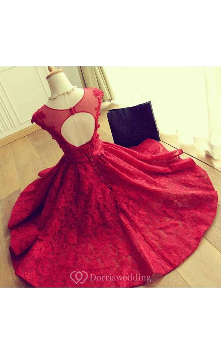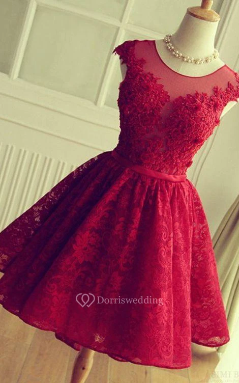 Elegant A-Line Jewel Cap Sleeve Short Back Lace Applique Knee Length Dress