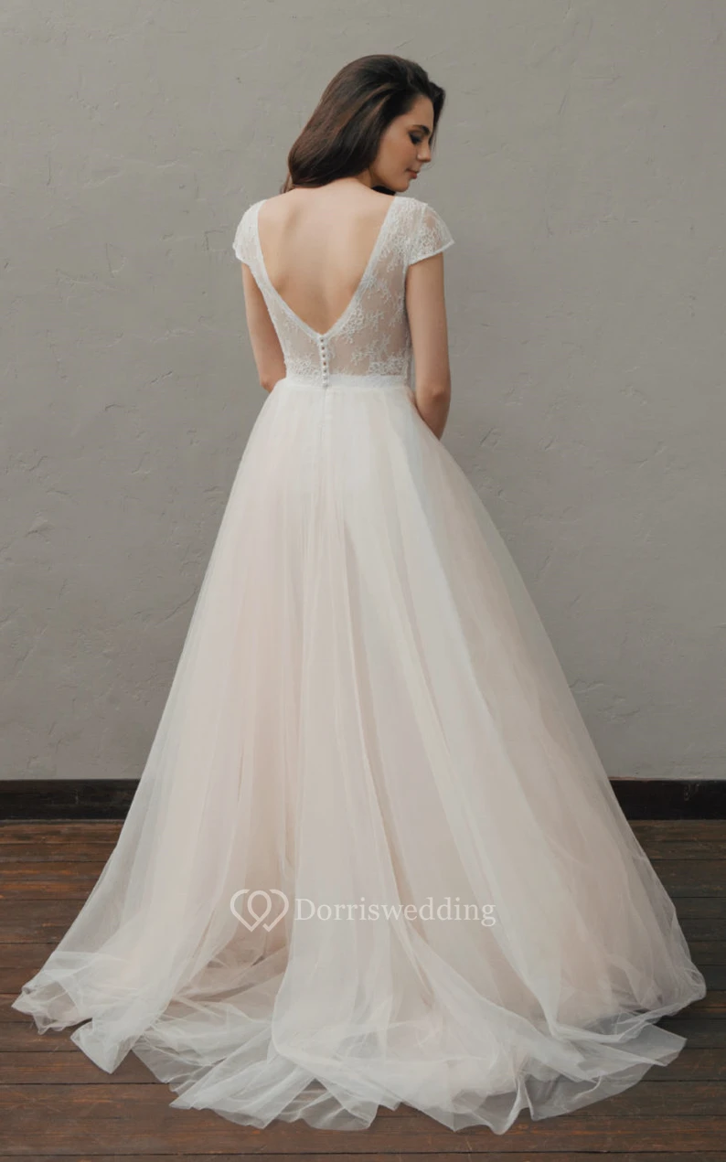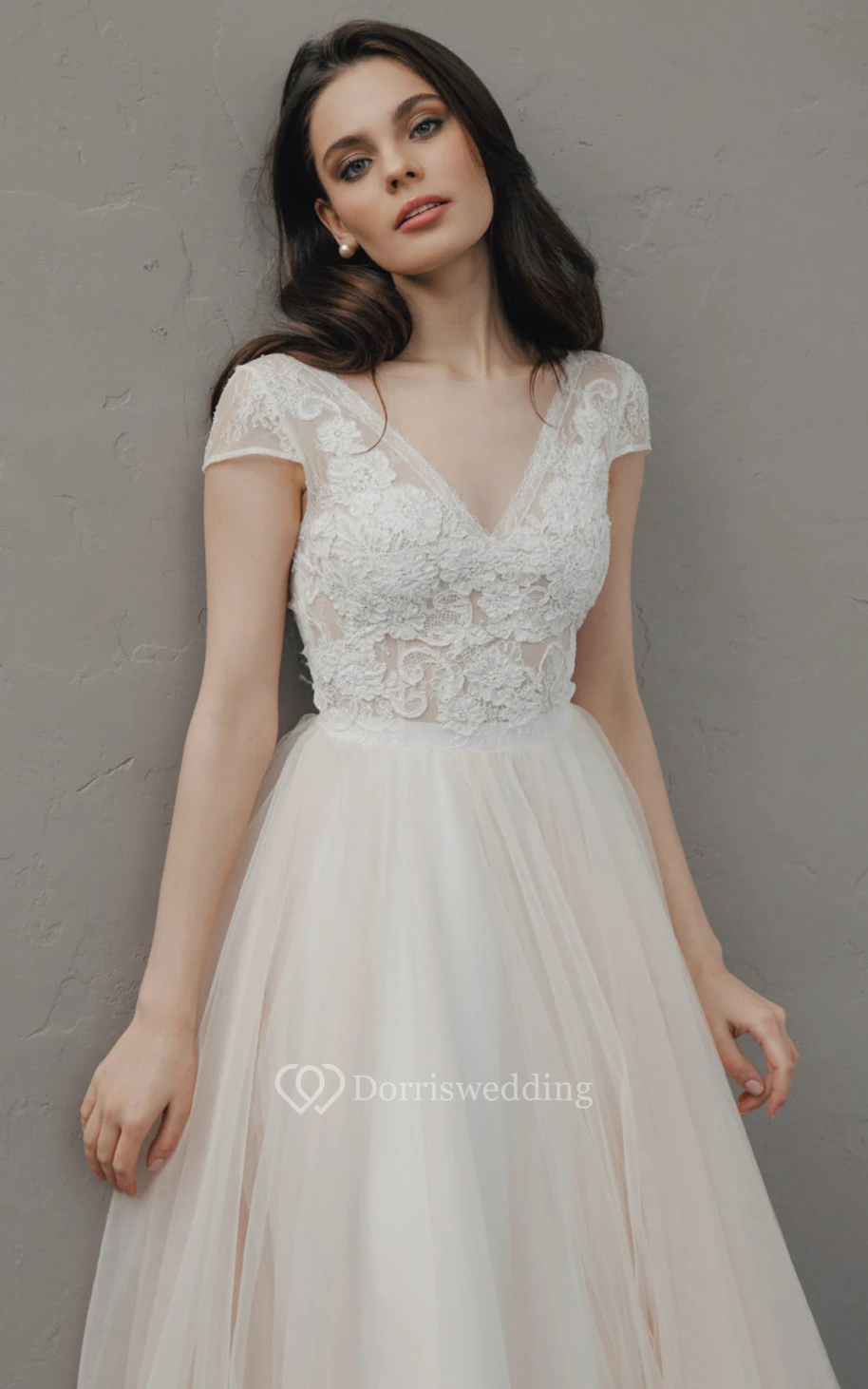Elegant A Line Lace and Tulle V-neck Simple Wedding Dress with Ruching